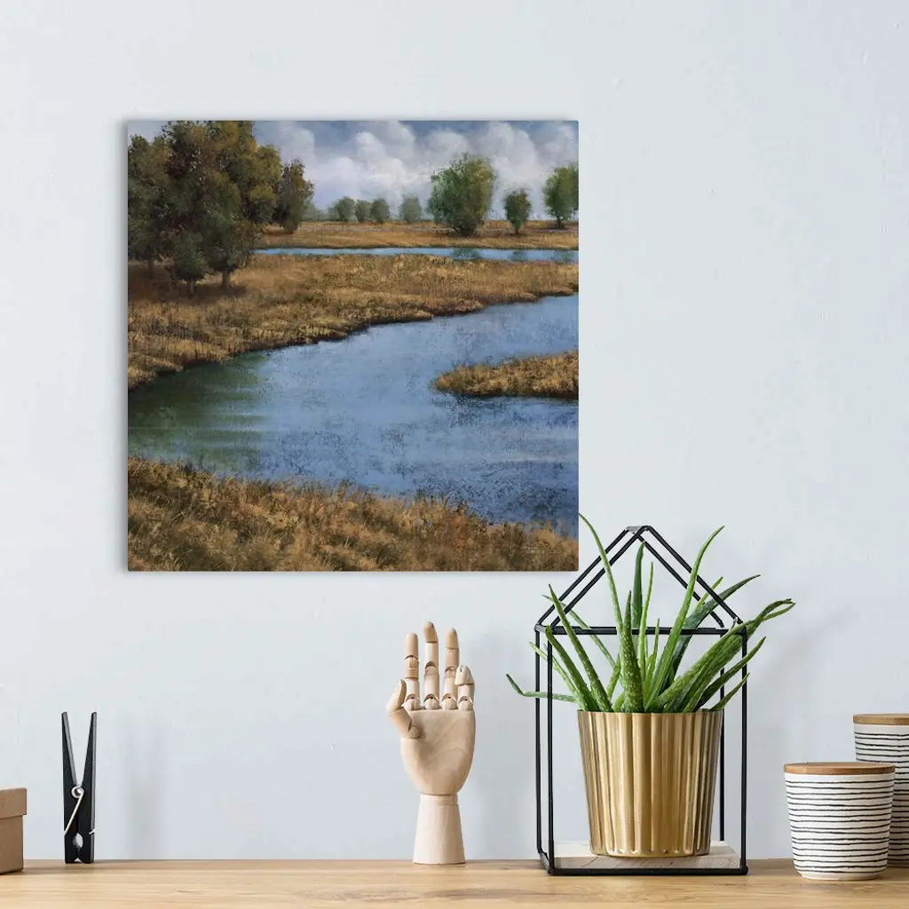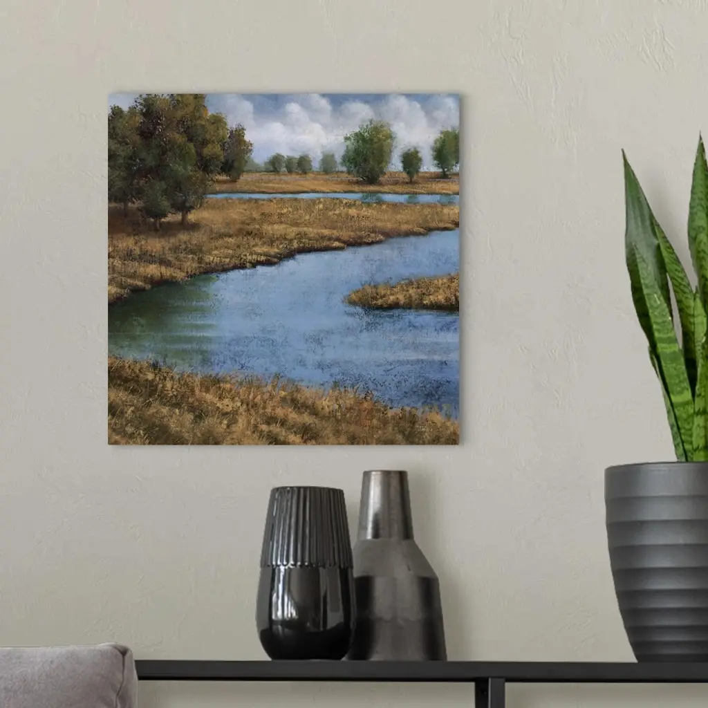 Contemporary painting of an idyllic countryside landscape, with a winding river.