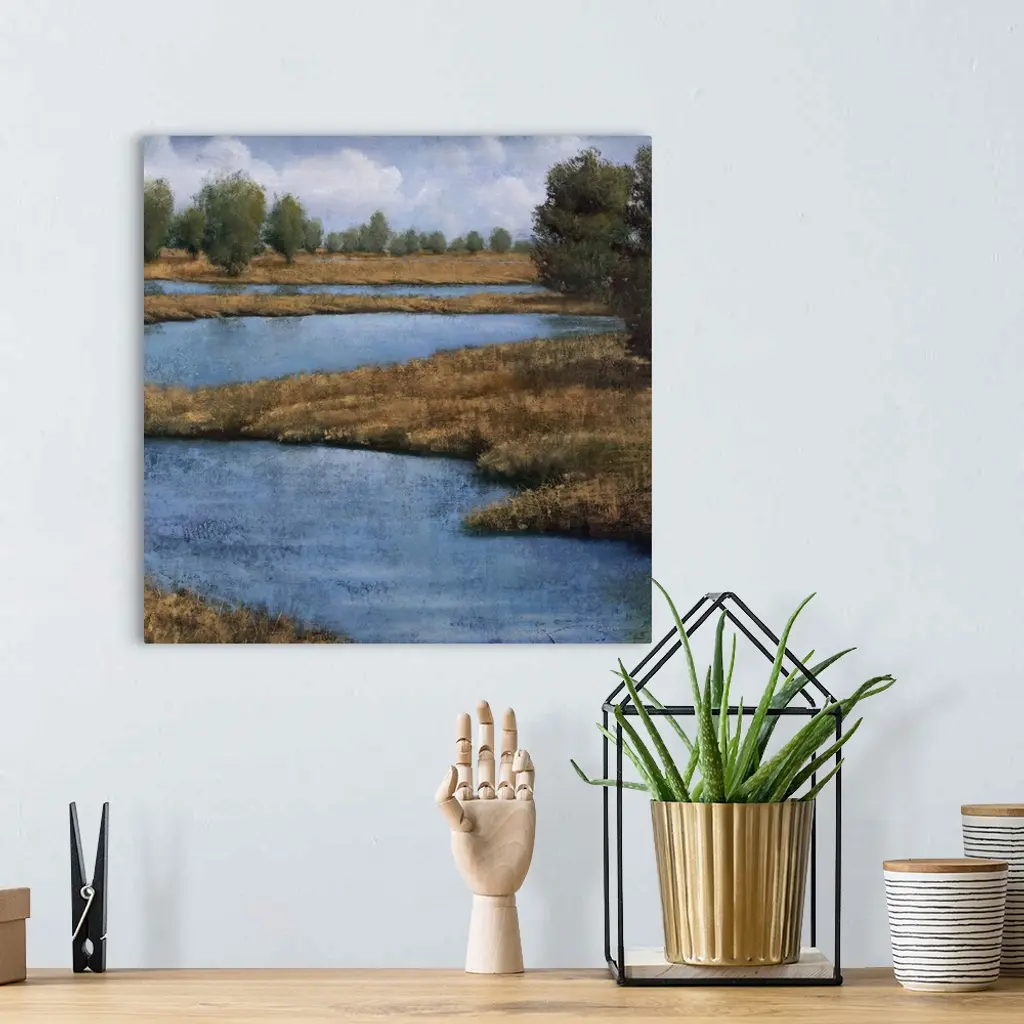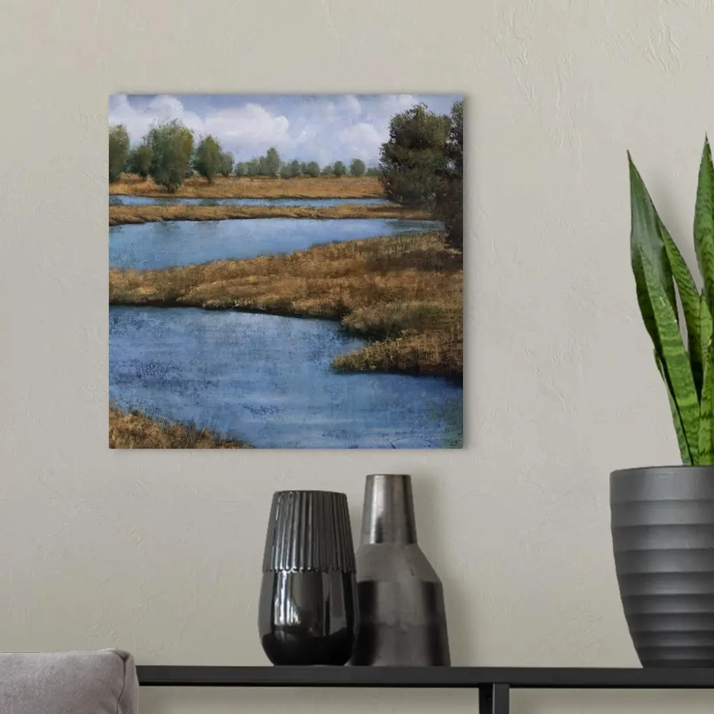 Contemporary painting of an idyllic countryside landscape, with a winding river.