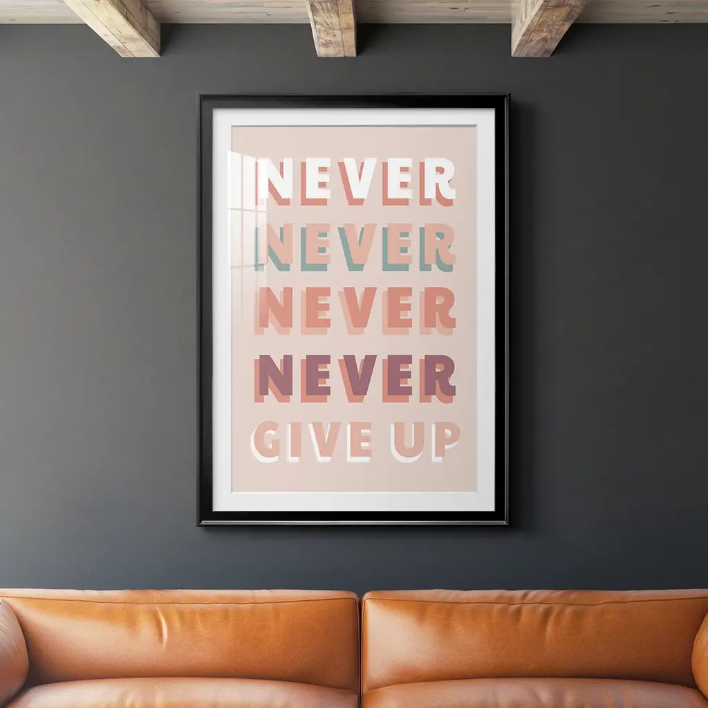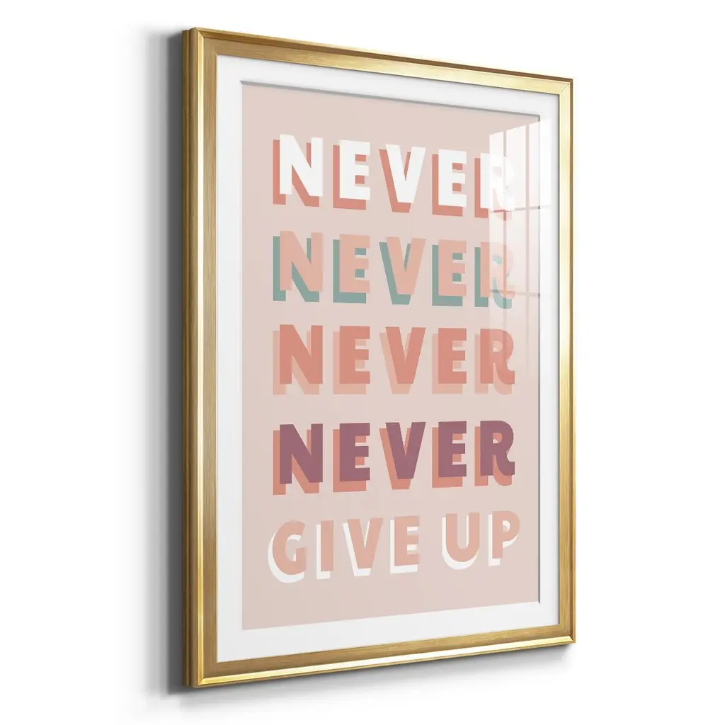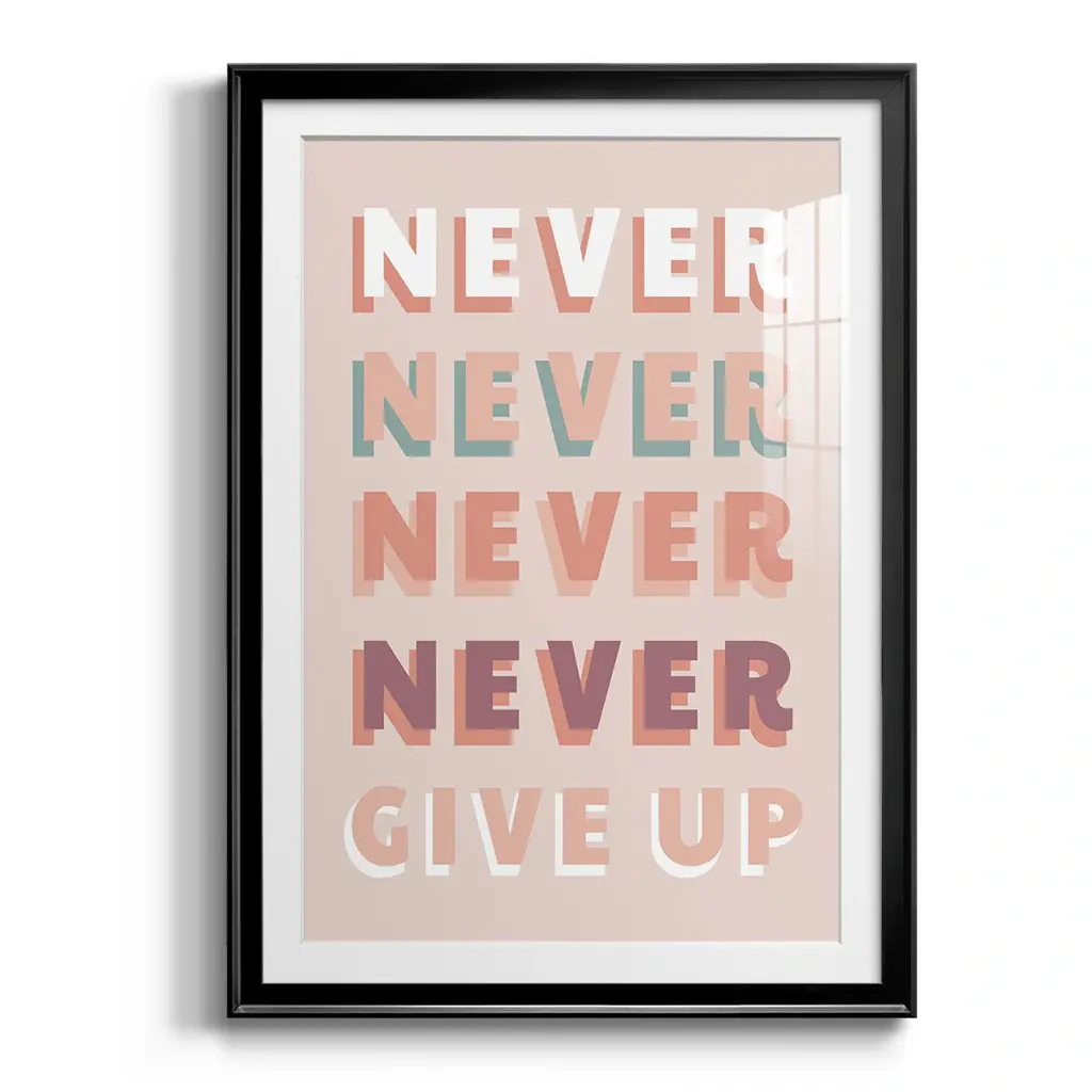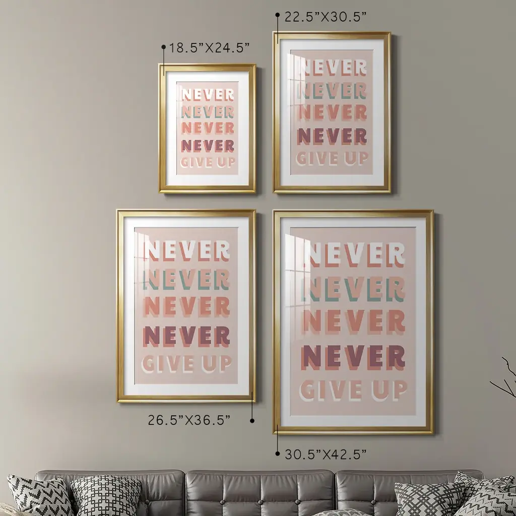 Never Give Up Premium Framed Print - Ready to Hang A Premium Framed Print created to last. Framed in distressed wood and available in an array of sizes and colors Featuring a beveled a solid wood stretcher bar, each piece comes ready to hand 4 SIZES AVAILABLE 30.5''X42.5'' - Overall Size 26.5'X36.5'' - Overall Size 22.5''x30.5'' - Overall Size 18.5''x24.5'' - Overall Size Each piece is made to order. Each piece comes with hanging hardware. Made in the USA Ready to Hang Giclee Paper Print Acrylic Glass Beveled Matt Board