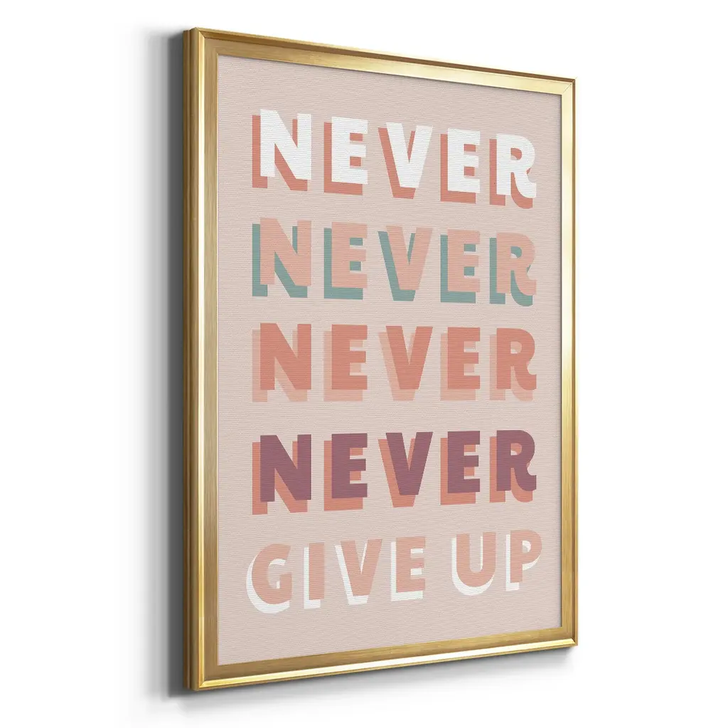 Never Give Up Premium Framed Print - Ready to Hang A Premium Framed Print created to last. Framed in distressed wood and available in an array of sizes and colors Featuring a beveled a solid wood stretcher bar, each piece comes ready to hand 4 SIZES AVAILABLE 30.5''X42.5'' - Overall Size 26.5'X36.5'' - Overall Size 22.5''x30.5'' - Overall Size 18.5''x24.5'' - Overall Size Each piece is made to order. Each piece comes with hanging hardware. Made in the USA Ready to Hang