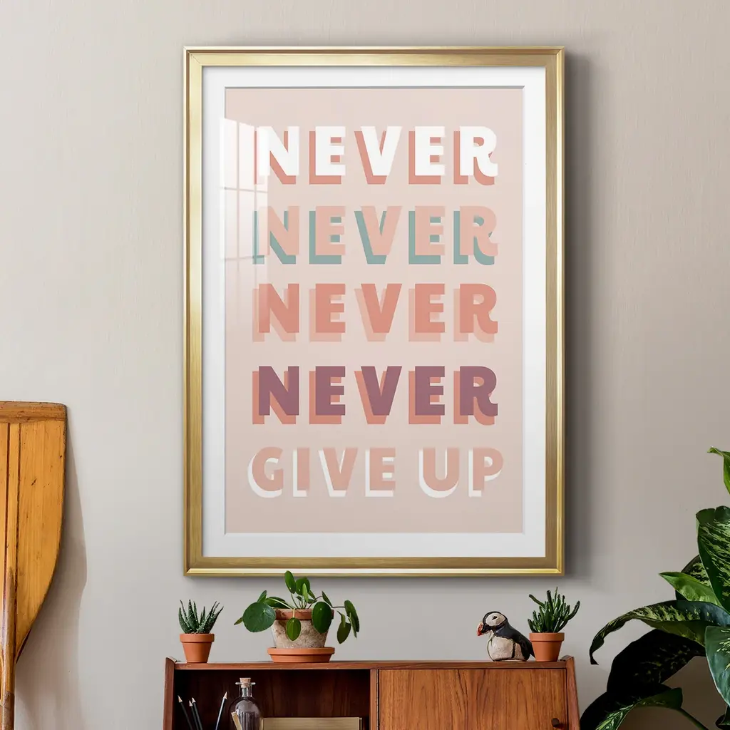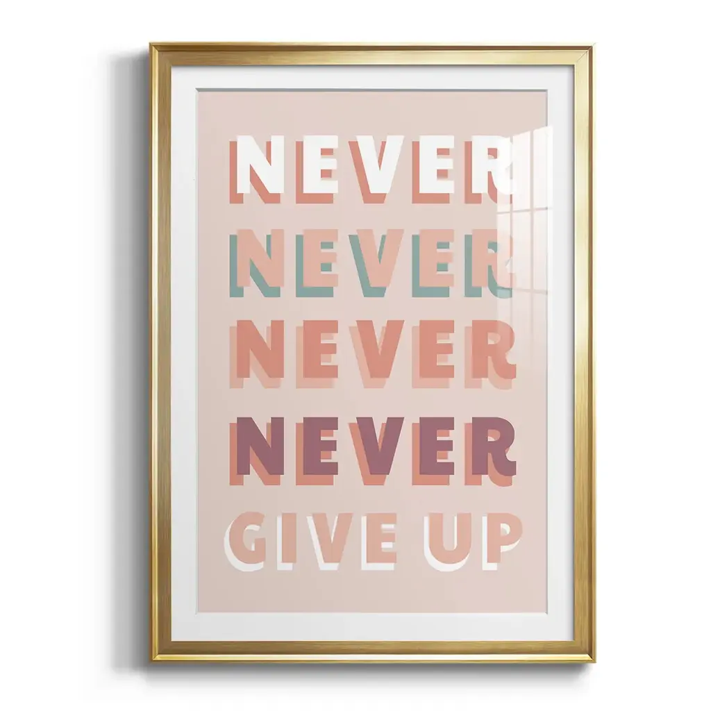 Never Give Up Premium Framed Print - Ready to Hang A Premium Framed Print created to last. Framed in distressed wood and available in an array of sizes and colors Featuring a beveled a solid wood stretcher bar, each piece comes ready to hand 4 SIZES AVAILABLE 30.5''X42.5'' - Overall Size 26.5'X36.5'' - Overall Size 22.5''x30.5'' - Overall Size 18.5''x24.5'' - Overall Size Each piece is made to order. Each piece comes with hanging hardware. Made in the USA Ready to Hang Giclee Paper Print Acrylic Glass Beveled Matt Board