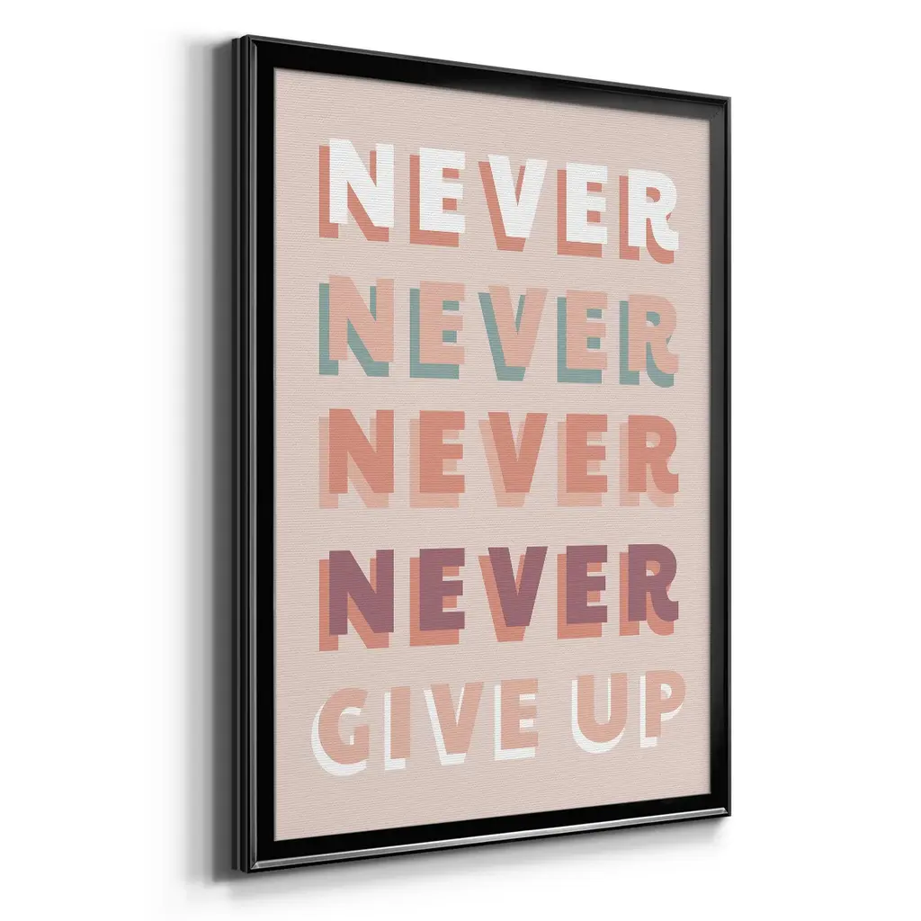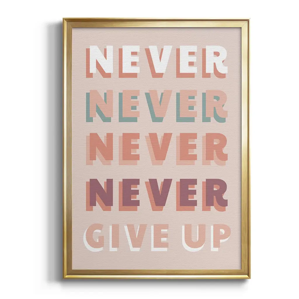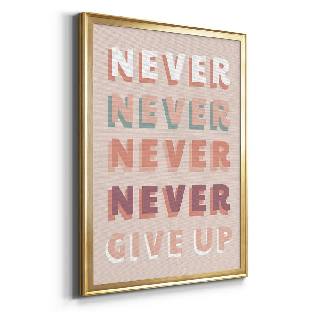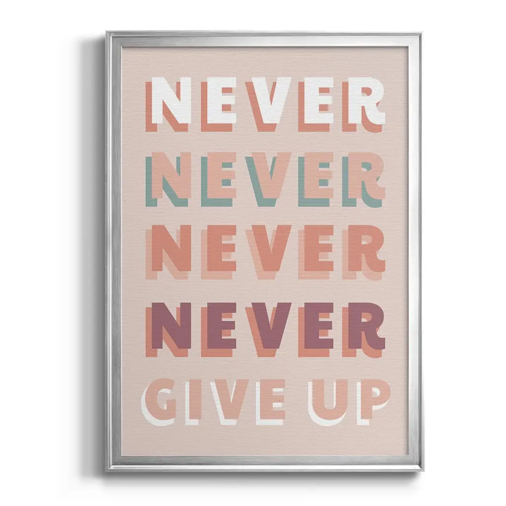 Never Give Up Premium Framed Print - Ready to Hang A Premium Framed Print created to last. Framed in distressed wood and available in an array of sizes and colors Featuring a beveled a solid wood stretcher bar, each piece comes ready to hand 4 SIZES AVAILABLE 30.5''X42.5'' - Overall Size 26.5'X36.5'' - Overall Size 22.5''x30.5'' - Overall Size 18.5''x24.5'' - Overall Size Each piece is made to order. Each piece comes with hanging hardware. Made in the USA Ready to Hang