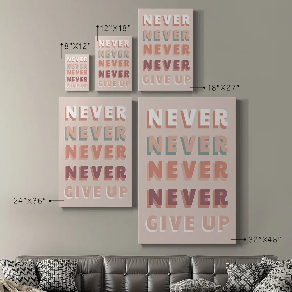 Never Give Up Premium Gallery Wrapped Canvas - Ready to Hang A premium hand stretched gallery wrapped canvas print created to last. Featuring a beveled a solid wood stretcher bar, each piece comes ready to hand 6 SIZES AVAILABLE 8''X12'' - Overall Size 12''X18'' - Overall Size 18''X27'' - Overall Size 24''x36'' - Overall Size 32''x48'' - Overall Size 40''x60'' - Overall Size Each piece is made to order. Built to Last Each piece comes ready to hang Solid wood stretcher Fade and Water resistant Made domestically