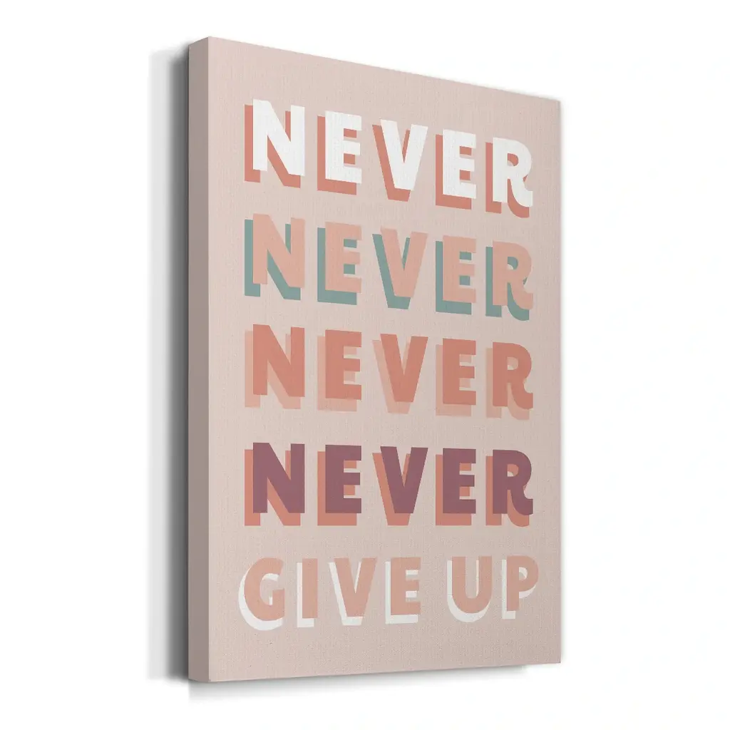 Never Give Up Premium Gallery Wrapped Canvas - Ready to Hang A premium hand stretched gallery wrapped canvas print created to last. Featuring a beveled a solid wood stretcher bar, each piece comes ready to hand 6 SIZES AVAILABLE 8''X12'' - Overall Size 12''X18'' - Overall Size 18''X27'' - Overall Size 24''x36'' - Overall Size 32''x48'' - Overall Size 40''x60'' - Overall Size Each piece is made to order. Built to Last Each piece comes ready to hang Solid wood stretcher Fade and Water resistant Made domestically