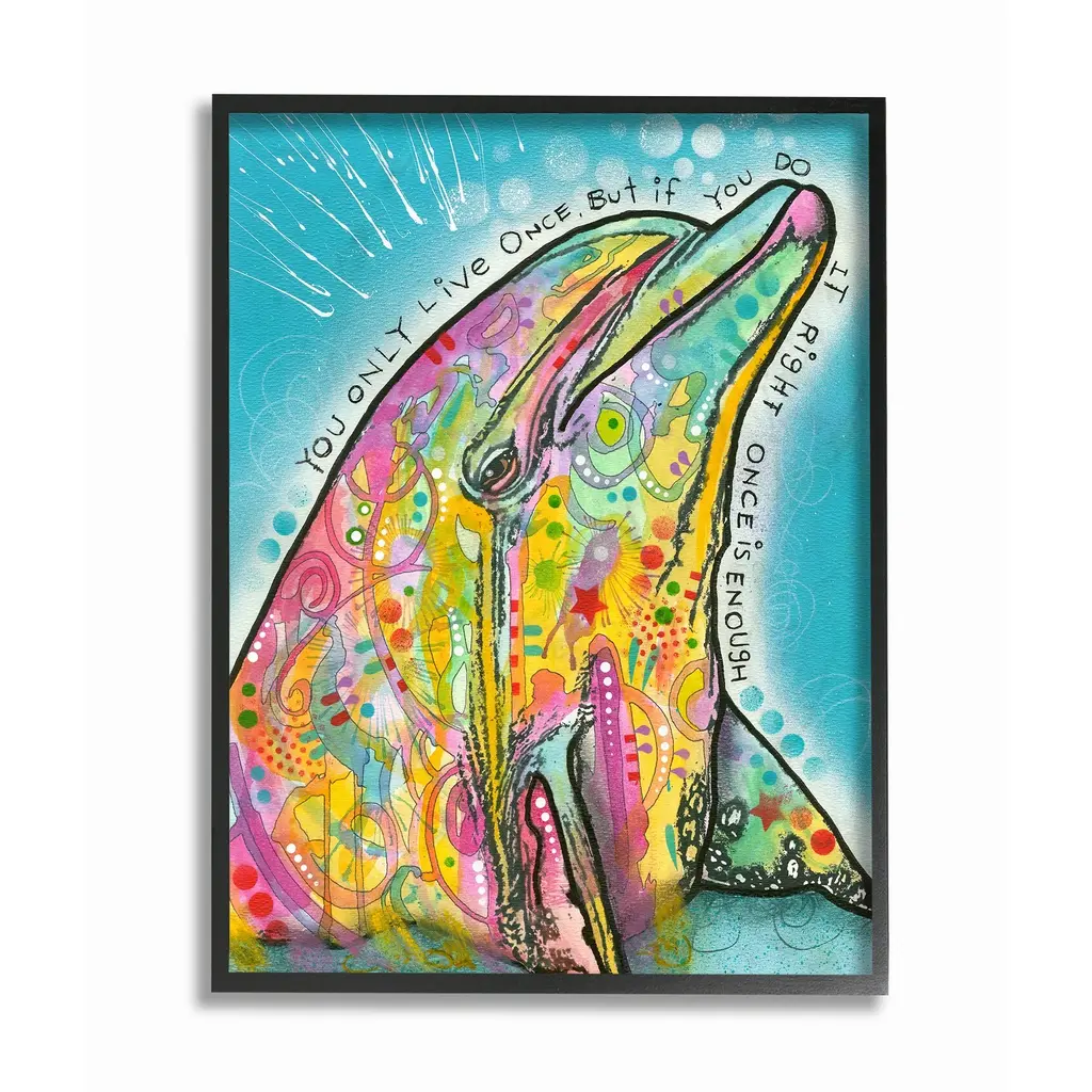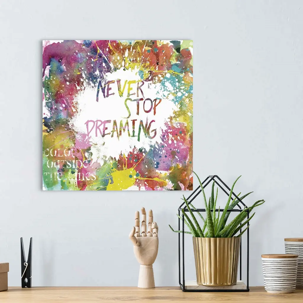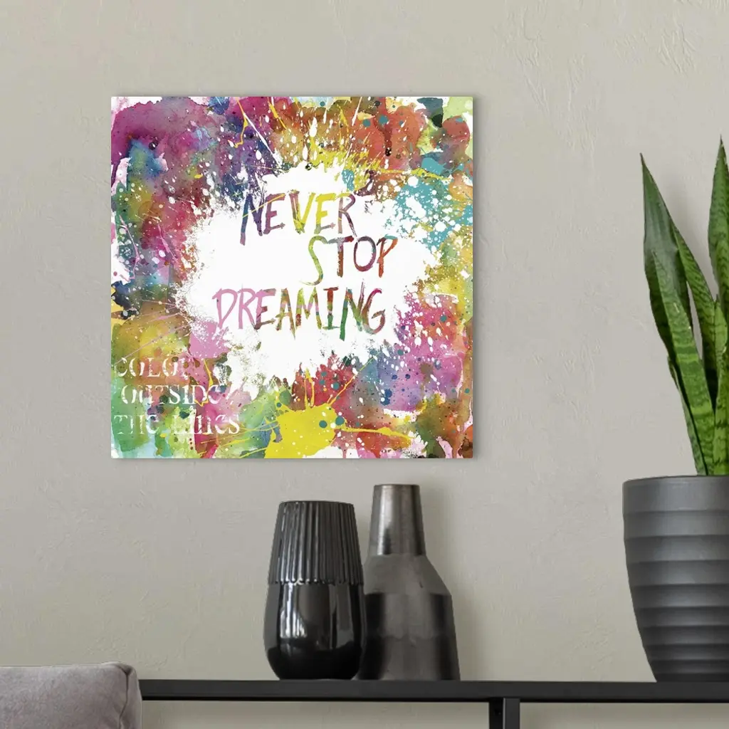 Inspirational square painting with colorful paint splatter and the phrases "Never Stop Dreaming" and "Color Outside The Lines"