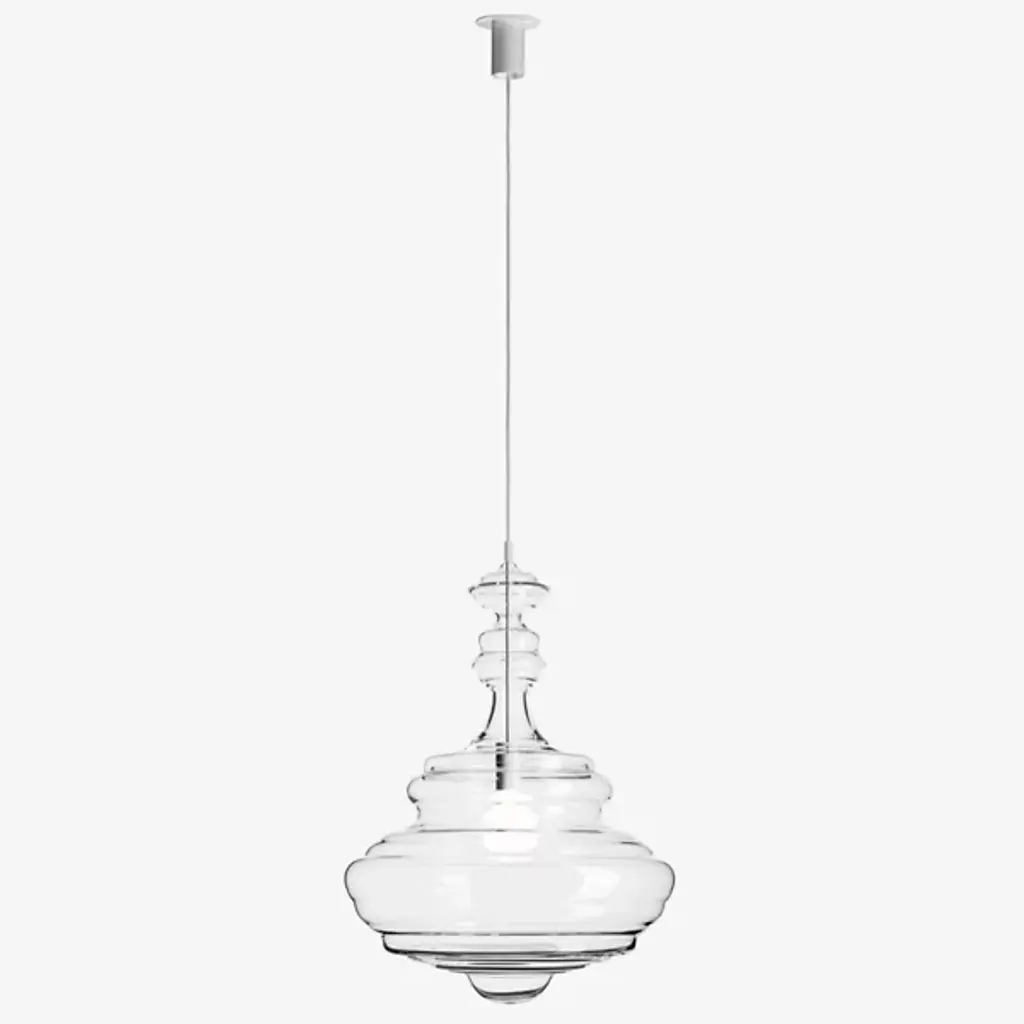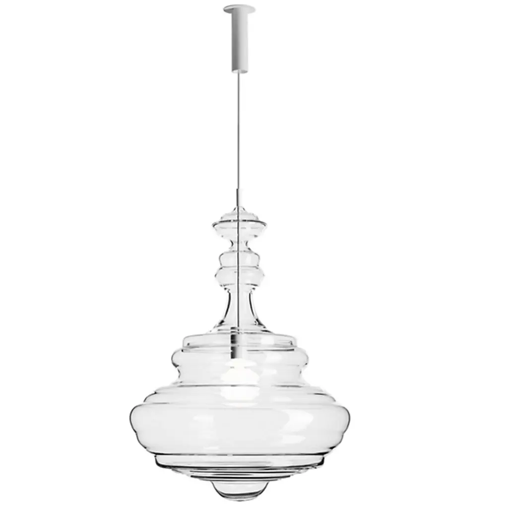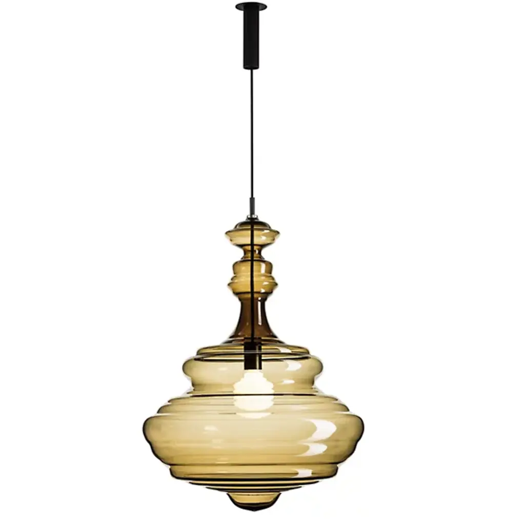 Referencing the iconic chandeliers in Moscow’s Bolshoi Theater, the Neverending Glory Bolshoi Theatre Pendant from Lasvit leaves an impression in the full 360-degrees with light-glazed stages of glass. Just like an opera or play, emotion proves central in designer Jan Plechác & Henry Wielgus’s work. The design duo conjures these emotions with a minimal aesthetic. While minimal in materials choice, the construction of this layered glass piece is as complex as they come. Glass artists translate the design duo’s sketched shape into a curve-draped shade evocative of classic chandeliers. Every level of glass catches streaking highlights as an atmospheric glow mellows through it.