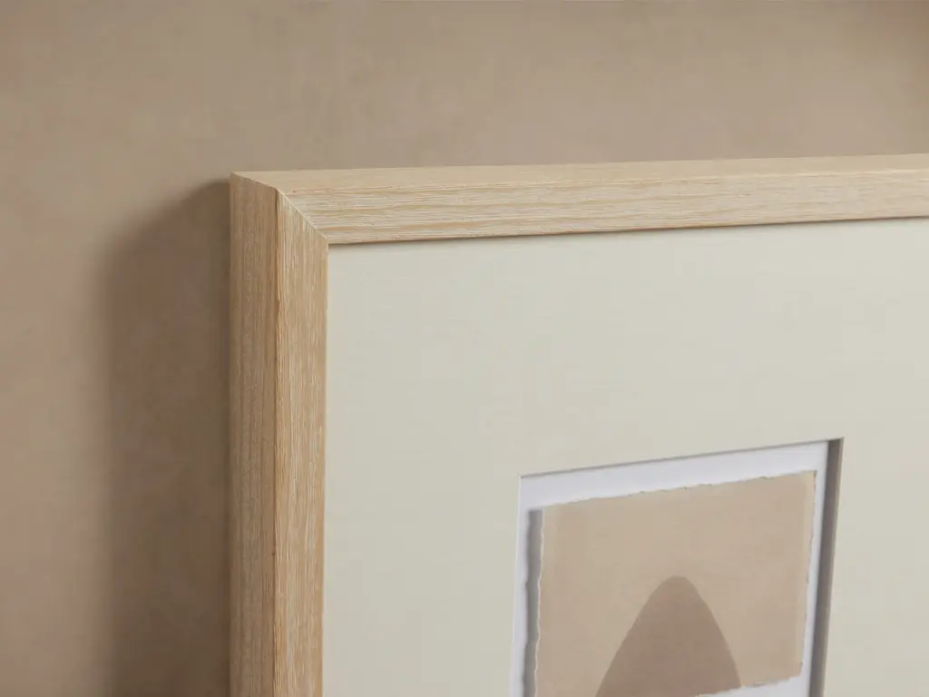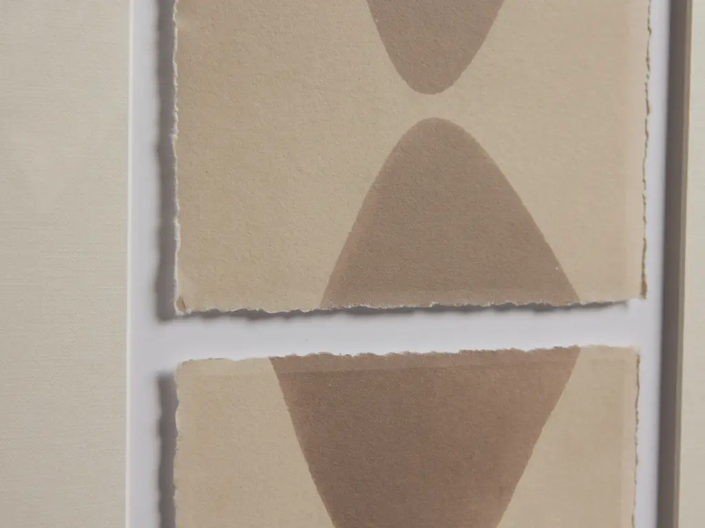 Add depth to your space with this series of angular forms in neutral hues, capturing warmth and movement across textural kozo paper with artfully deckled edges. Inspired by her childhood in Ohio as well as extensive world travels, Dawn Sweitzer uses abstract patterns that interact with materials, colors, textures, and finishes to arrange rich compositions. Printed on kozo paper with deckled edges under white matboard and acrylic glass, surrounded by a natural wood frame. Hangs vertically or horizontally from back-mounted D-rings. Hanging hardware not included. Artist: Dawn Sweitzer