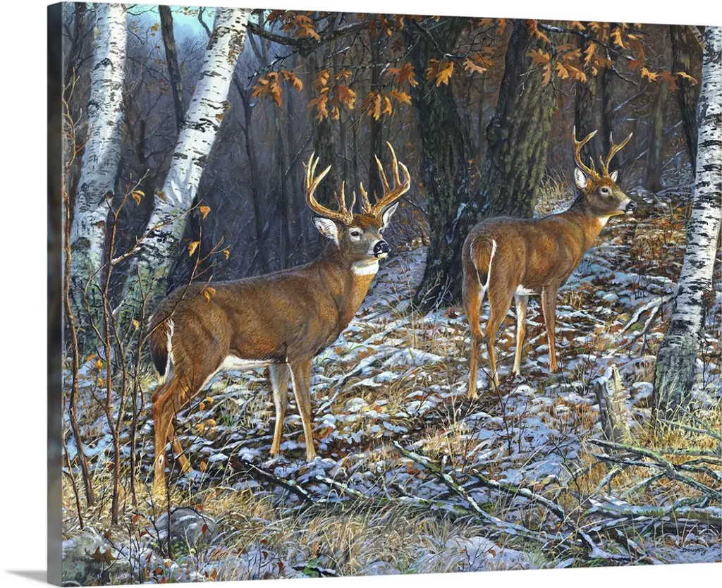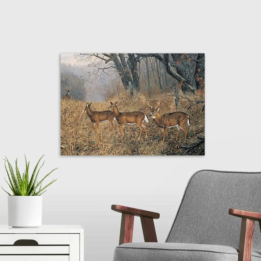 Contemporary artwork of a group of deer in a dry field and the forest with bare trees drawn to the right.