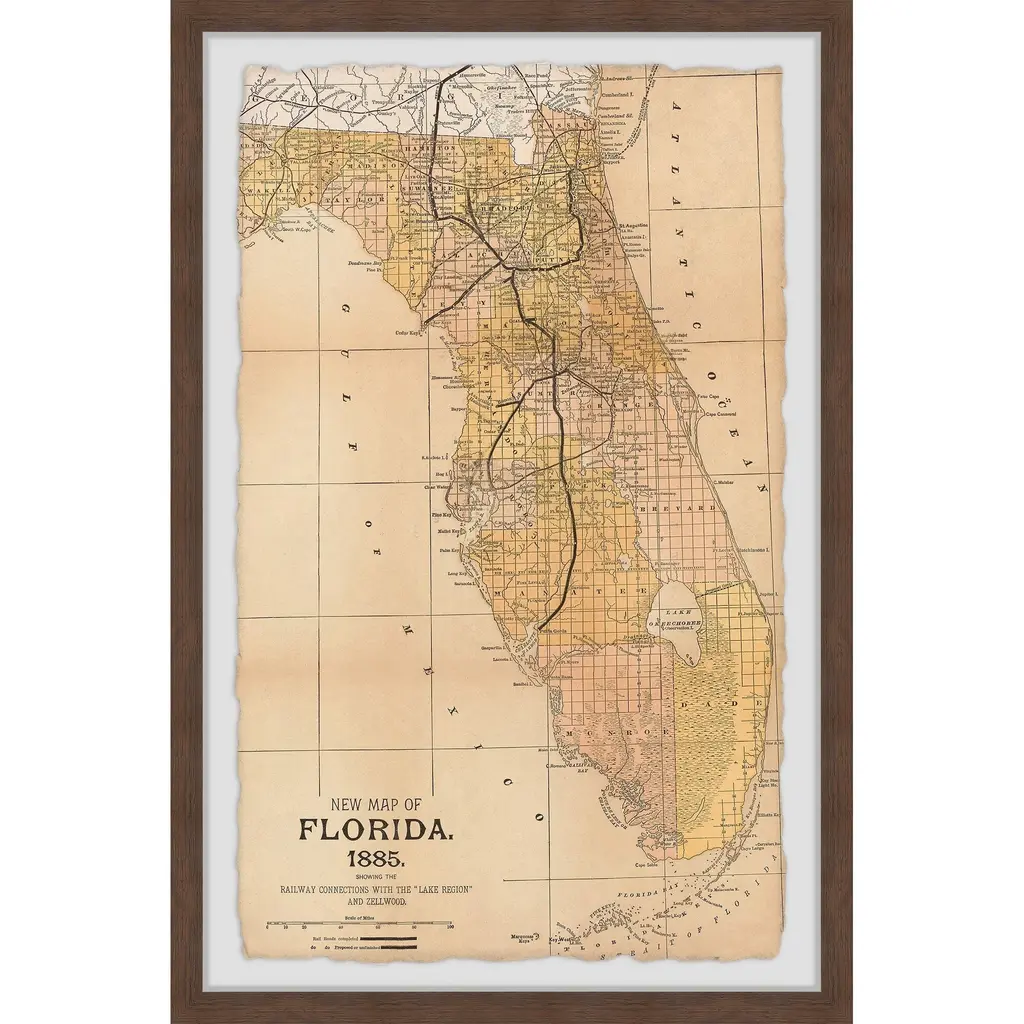 'New Map Of Florida, 1885' Framed Painting Print - 16 X 24