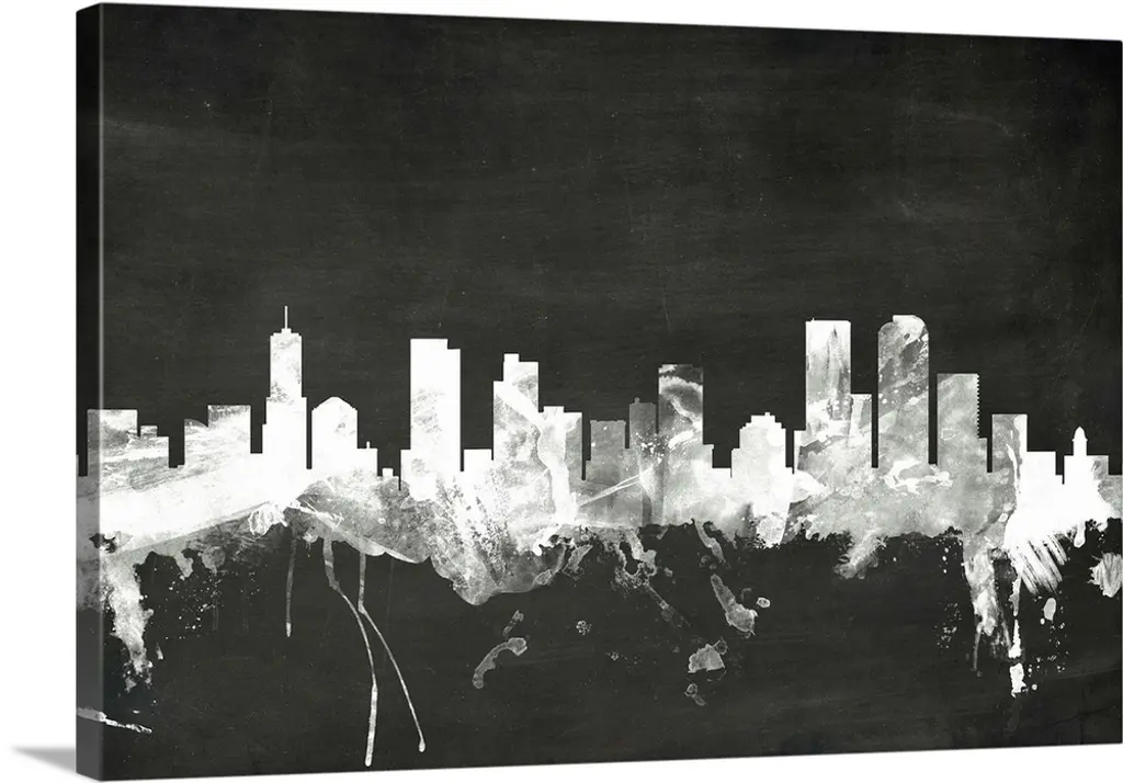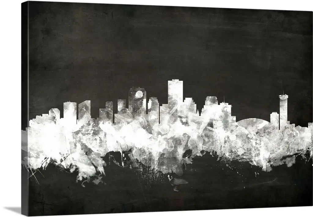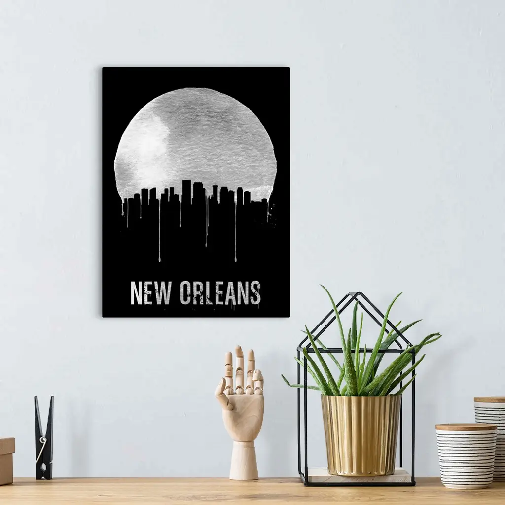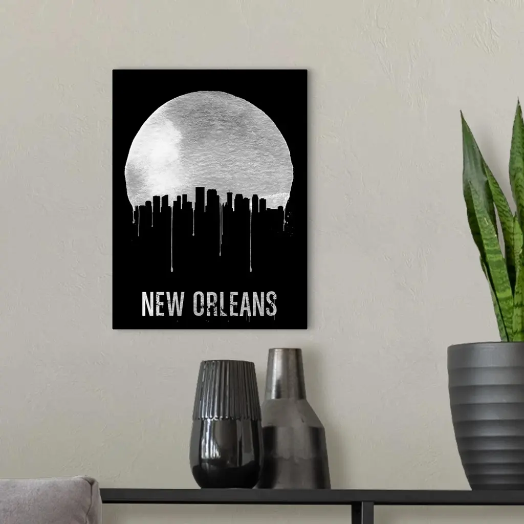 Contemporary watercolor artwork of the New Orleans city skyline, in silhouette.