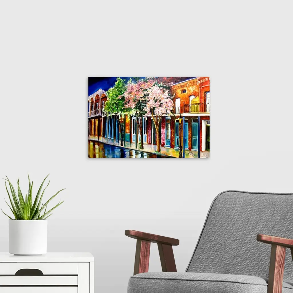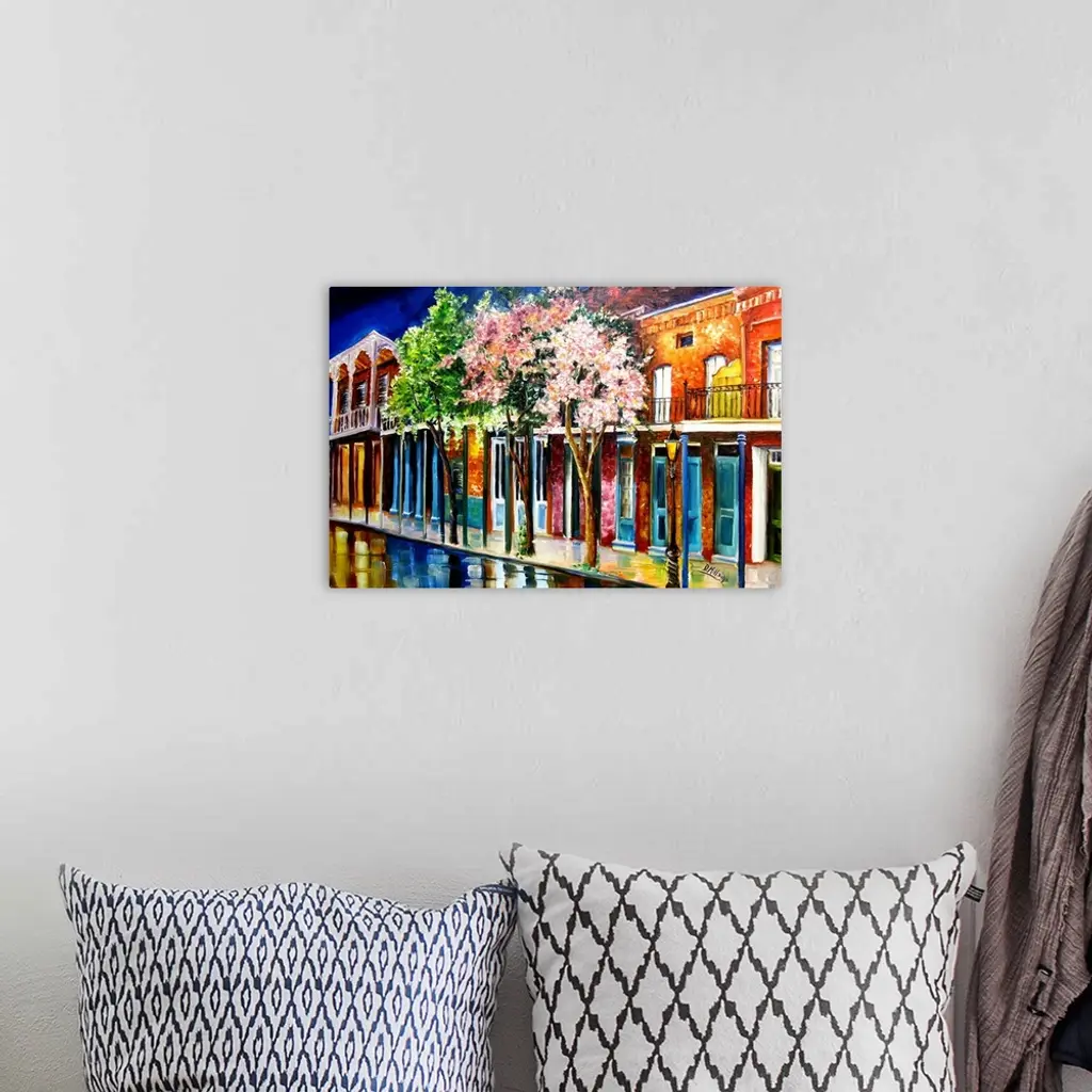 Contemporary painting of flowering trees along a street in New Orleans, Louisiana.