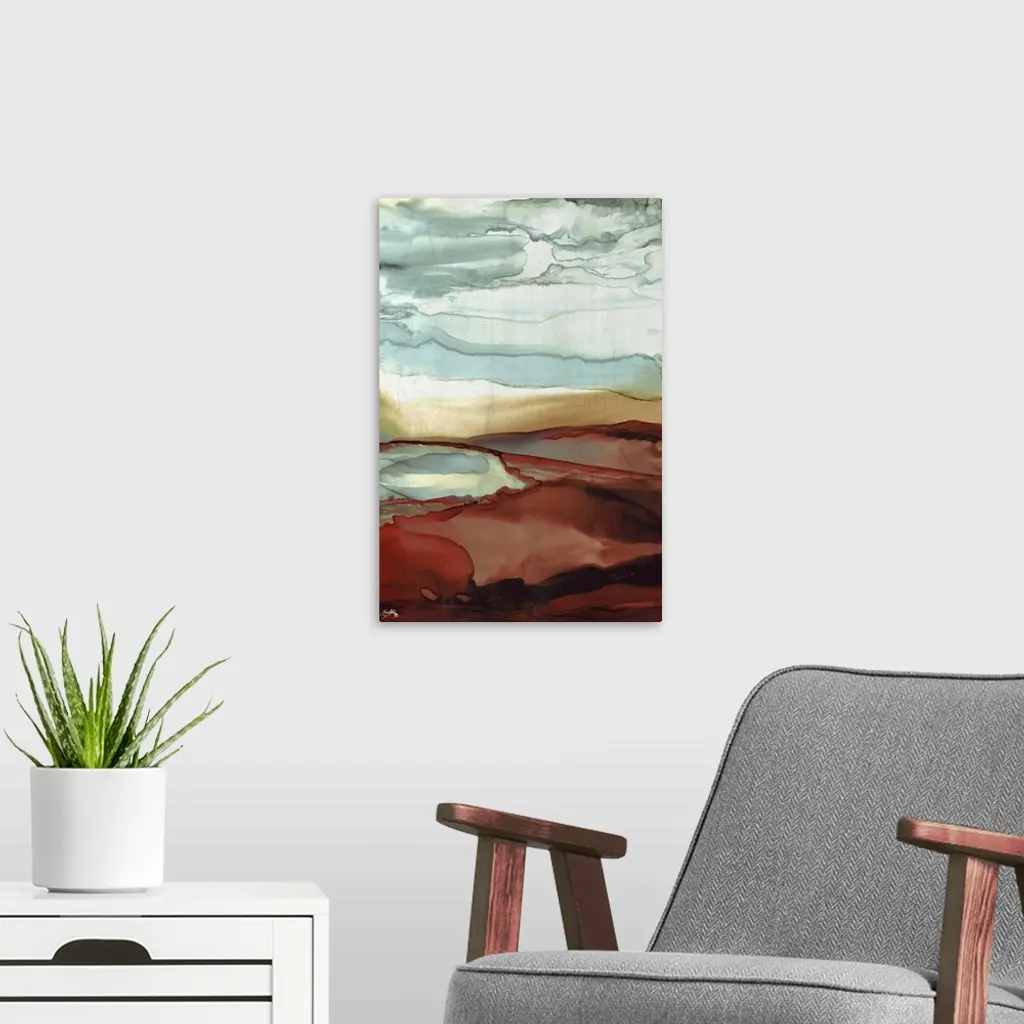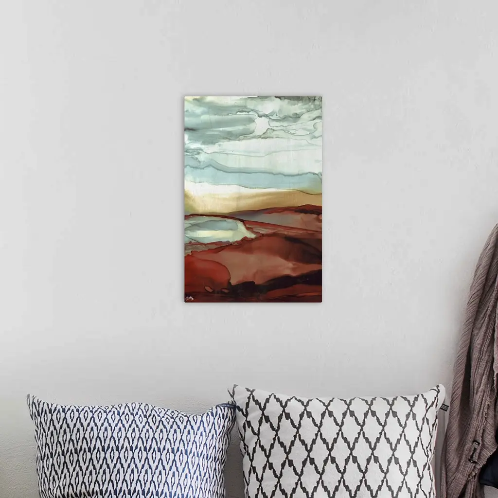 Abstract painting with slate blue, tan, and crimson red hues layered together to resemble a sky.