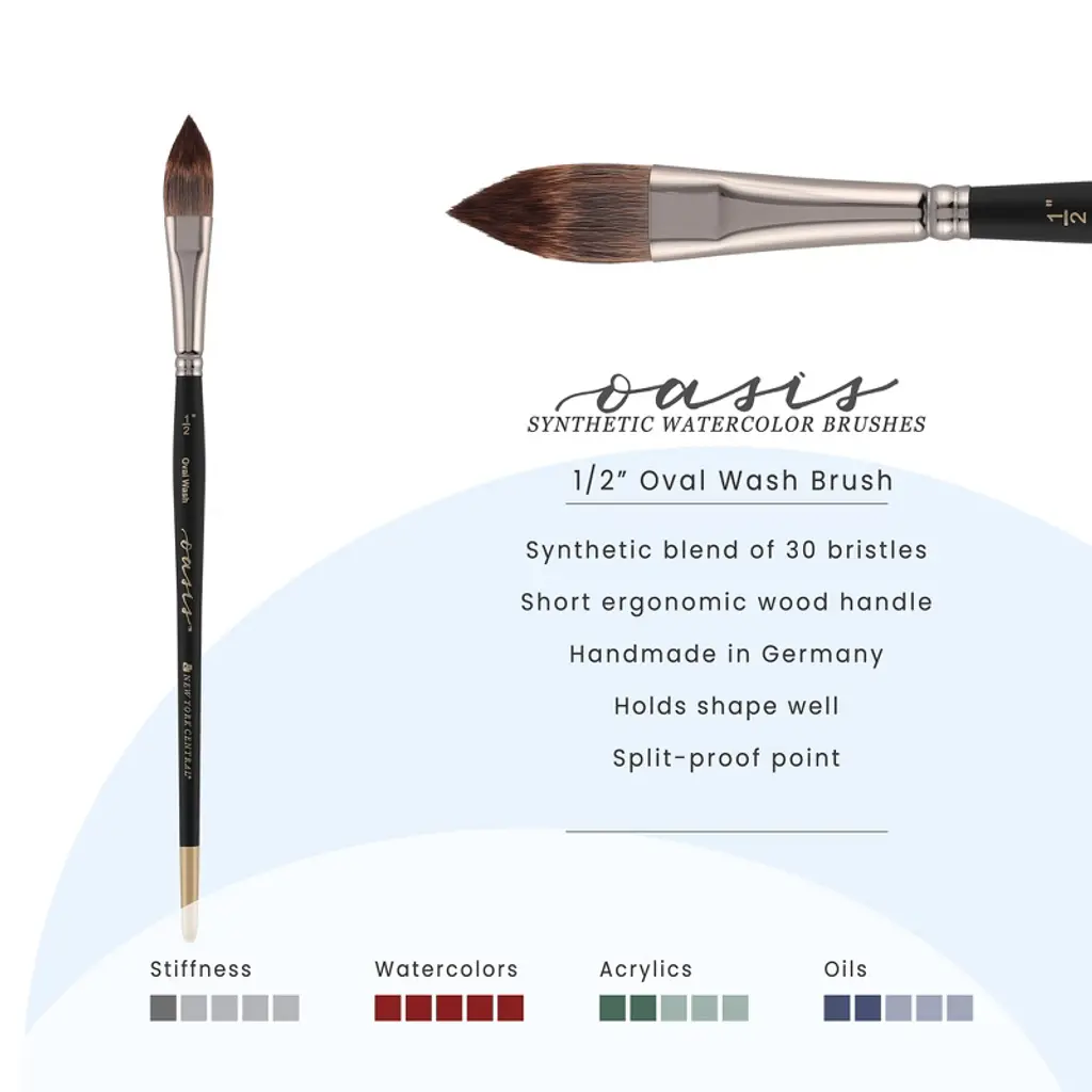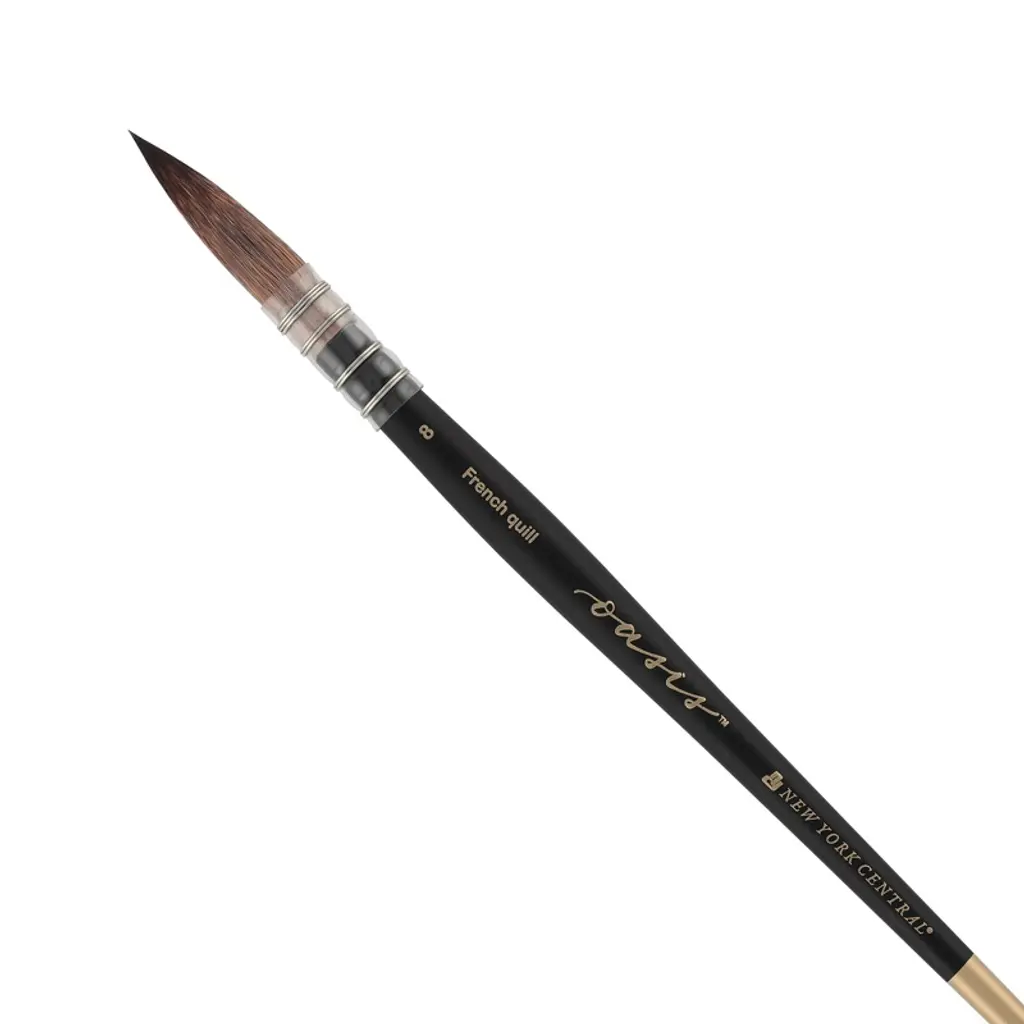 Introducing the New York Central Oasis Synthetic Brush, a pinnacle in the realm of professional art tools, meticulously crafted for artists who demand excellence in every stroke. This watercolor brushes professional set is engineered to cater to the discerning needs of professional artists and passionate watercolor enthusiasts alike. The Oasis Synthetic Brush blends diverse filament diameters, taper ratios, and lengths, achieving a harmony that replicates the natural feel of traditional brushes. Each brush in this line of watercolorbrushes is a masterpiece of its own, assembled by hand in Germany, ensuring precision and attention to detail. Our innovative approach uses computer simulations to determine the ideal combination of over 30 types of synthetic hair, offering an unparalleled experience akin to natural hair brushes. With soft bristles designed for superior absorption, these watercolor paint brushes maintain their shape, providing a consistent and responsive feel with exceptional snap. The split-proof point and uniform brush response make each brush a reliable companion for creating intricate details and expansive washes, fulfilling all your watercolor needs. The ergonomically shaped handle of our watercolor brush set is crafted to fit comfortably in the artist’s hand, reducing fatigue during extended painting sessions. This attention to ergonomics ensures that each brush feels like an extension of your arm, allowing for precise control and fluidity in every application. Explore the world of professional watercolor brushes with confidence, knowing that each brush is designed to deliver unparalleled performance. Elevate your artistry with the best watercolor brushes available, and experience the difference with the New York Central Oasis Synthetic Brush. Perfectly suited for watercolors with brush techniques, these brushes are your ideal partner in transforming your artistic vision into reality. The collection features round, travel round, script liners, pointed oval wash, French quill, mottler, and flat brush shapes, making it a comprehensive watercolor brush paint solution for seasoned professionals and beginning artists alike. Each brush has been designed to outperform natural hair, brought to life with over 30 types of synthetic hair blended meticulously to imitate the feel and performance of natural hair. These watercolor paint brushes are designed with soft bristles that are absorbent and hold their shape with great snap, ensuring a uniform brush response. Each brush also features a split-proof point, crafted using a computer simulation that determines the precise combo of filaments before each brush is assembled by hand. This high-quality watercolor brushes set offers a combination of different filament diameters, taper ratios, and lengths, providing you with the flexibility and precision needed for your watercolor projects. The watercolor brushes professional line is hand-made in Germany, where the focus on detail and quality is second to none. The brushes are fitted with an ergonomically shaped handle, ensuring comfort and control as you work on your masterpiece. This professional watercolor brushes set ensures your watercolor and brush set experience is smooth, fulfilling, and artistically rewarding. Whether you're a professional looking for the best watercolor brushes, a student starting your journey with watercolors brushes, or an artist seeking a professional watercolor brush that delivers, the Oasis Synthetic Brush New York Central is your perfect choice.