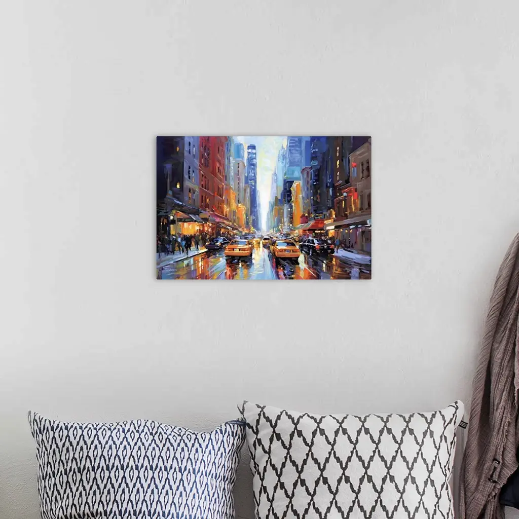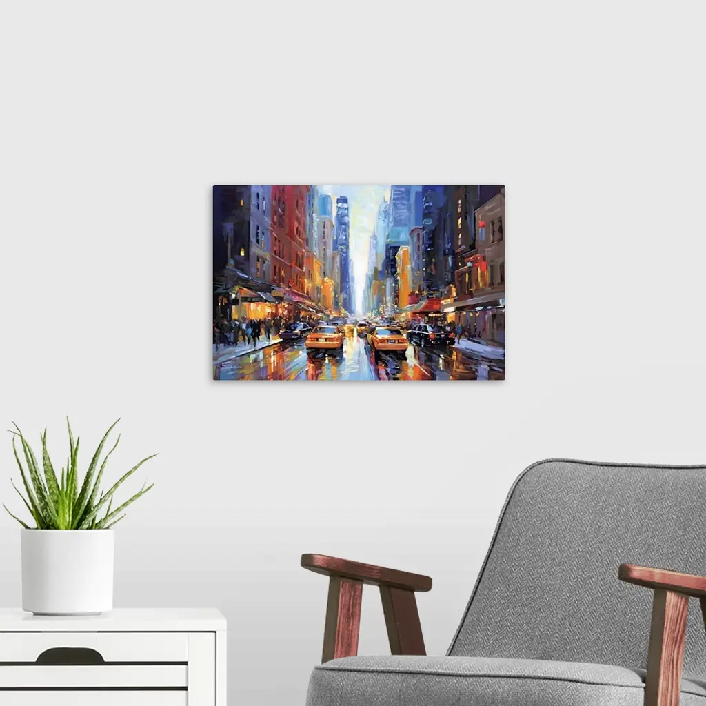 A vivid and energetic depiction of a busy new york city street, featuring iconic yellow taxis and colorful buildings reflecting on the wet pavement. The bright lights of the shops and towering skyscrapers add to the dynamic atmosphere of urban life, with people walking along the sidewalks and cars filling the street. This artwork captures the essence of the city's vibrancy and fast-paced lifestyle.