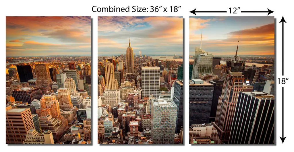 36"œ x 18"œ total size. Ready To Hang! (3 pieces - 12"œ x 18"œ each). 3 Panel Split (Triptych) Metal Print of New York City Skyline overlooking midtown Manhattan. Modern metal wall art for home or office wall decor & interior design. Printed on Luxurious, HD aluminum glossy metal panels. Multi panel art.. HD aluminum panels. Metal print wall art. Includes Shadow Wall Mount on the back.• Aluminum Metal Wall Art• Made in USA• Ready to hang - No assembly required• Shadow mount hardware on the back• 0.045"œ thick HD Aluminum Panels• Scratch resistant, glossy finish• Superb color clarity, luxurious prints• Epson printing process• For indoor or moisture rich environment use• Easy to clean. Gently wipe with microfiber cloth.