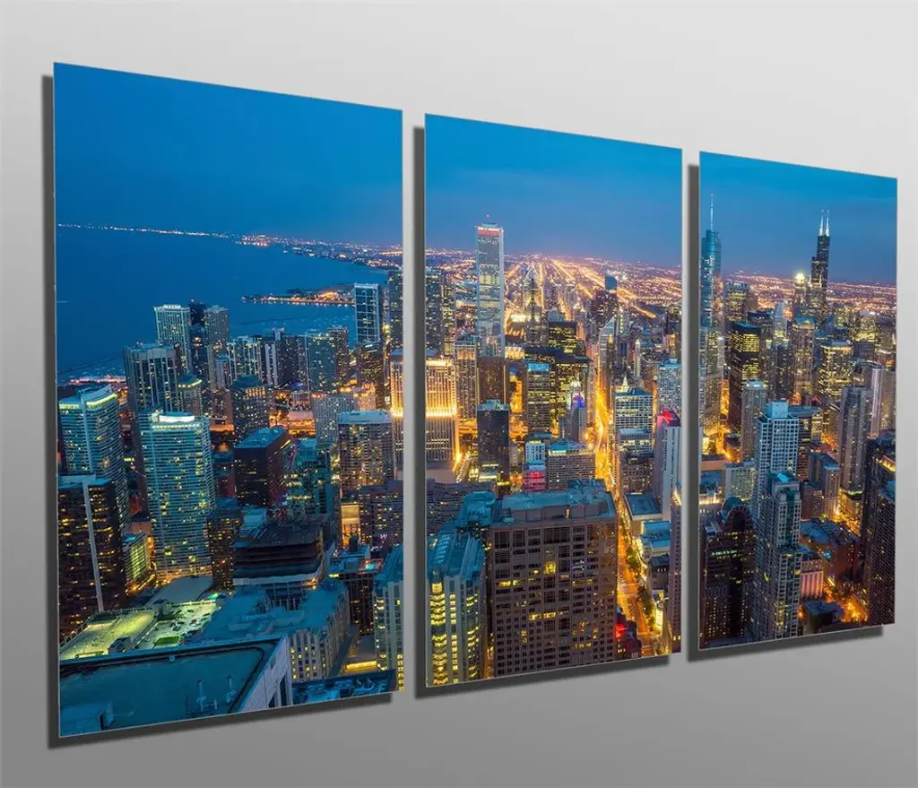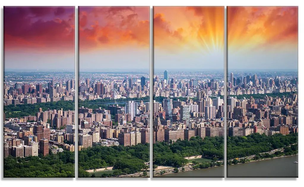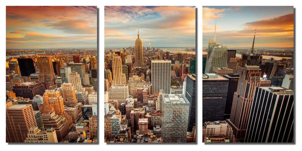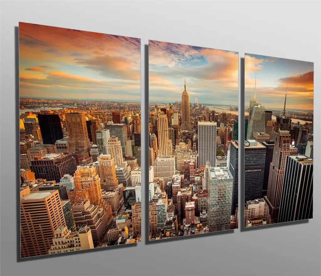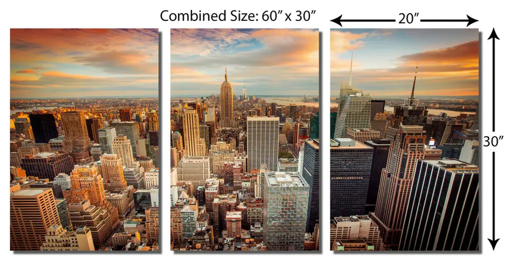 60"œ x 30"œ total size. Ready To Hang! (3 pieces - 20"œ x 30"œ each). 3 Panel Split (Triptych) Metal Print of New York City Skyline overlooking midtown Manhattan. Modern metal wall art for home or office wall decor & interior design. Printed on Luxurious, HD aluminum glossy metal panels. Multi panel art.. HD aluminum panels. Metal print wall art. Includes Shadow Wall Mount on the back.• Aluminum Metal Wall Art• Made in USA• Ready to hang - No assembly required• Shadow mount hardware on the back• 0.045"œ thick HD Aluminum Panels• Scratch resistant, glossy finish• Superb color clarity, luxurious prints• Epson printing process• For indoor or moisture rich environment use• Easy to clean. Gently wipe with microfiber cloth.
