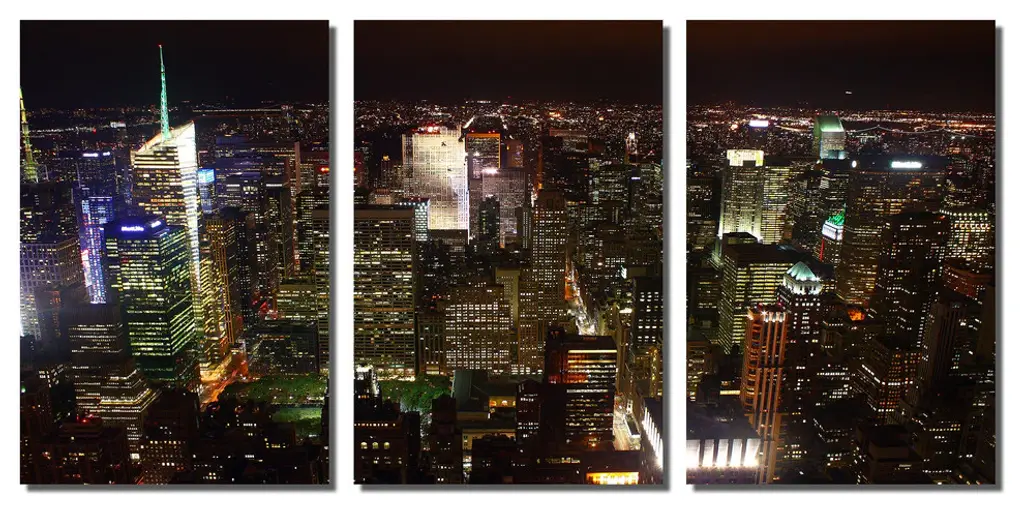 72"œ x 36"œ total size. Ready To Hang! (3 pieces - 24"œ x 36"œ each). 3 Panel Split (Triptych) Metal Print aerial view of New York skyline at night. Modern metal wall art for home or office wall decor & interior design. Printed on Luxurious, HD aluminum glossy metal panels. Multi panel art.. HD aluminum panels. Metal print wall art. Includes Shadow Wall Mount on the back.• Aluminum Metal Wall Art• Made in USA• Ready to hang - No assembly required• Shadow mount hardware on the back• 0.045"œ thick HD Aluminum Panels• Scratch resistant, glossy finish• Superb color clarity, luxurious prints• Epson printing process• For indoor or moisture rich environment use• Easy to clean. Gently wipe with microfiber cloth.