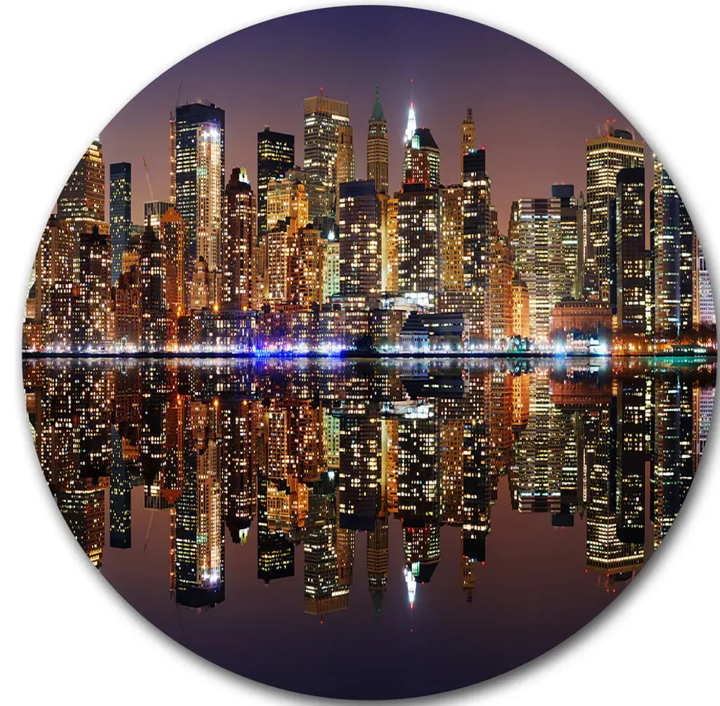 Bring Contemporary Abstraction to your home with this large Circle Metal wall art. This New York Midtown Night Panorama Metal Artwork makes it the focal point of any room or office. - White Gloss Coating ensures colors are extra vibrant with light reflection.- Aluminum grade Sheet Metal with 1 inch mounting frame on the back giving the illusion that the artwork is floating on the wall..- Mounting Brackets are included along with instructions.- High Quality Digital images are created directly into a glossy aluminum panel producing a stunning and captivating print into the glossy finish of the metal.- Water, Fire and Scratch resistant HD Aluminum panels.- Looks better than any photo paper and guaranteed to last at least 20 years- Easy to clean with a microfiber cloth. Colors are far superior to regular Canvas Art. - Easy to Hang