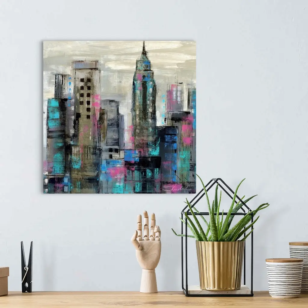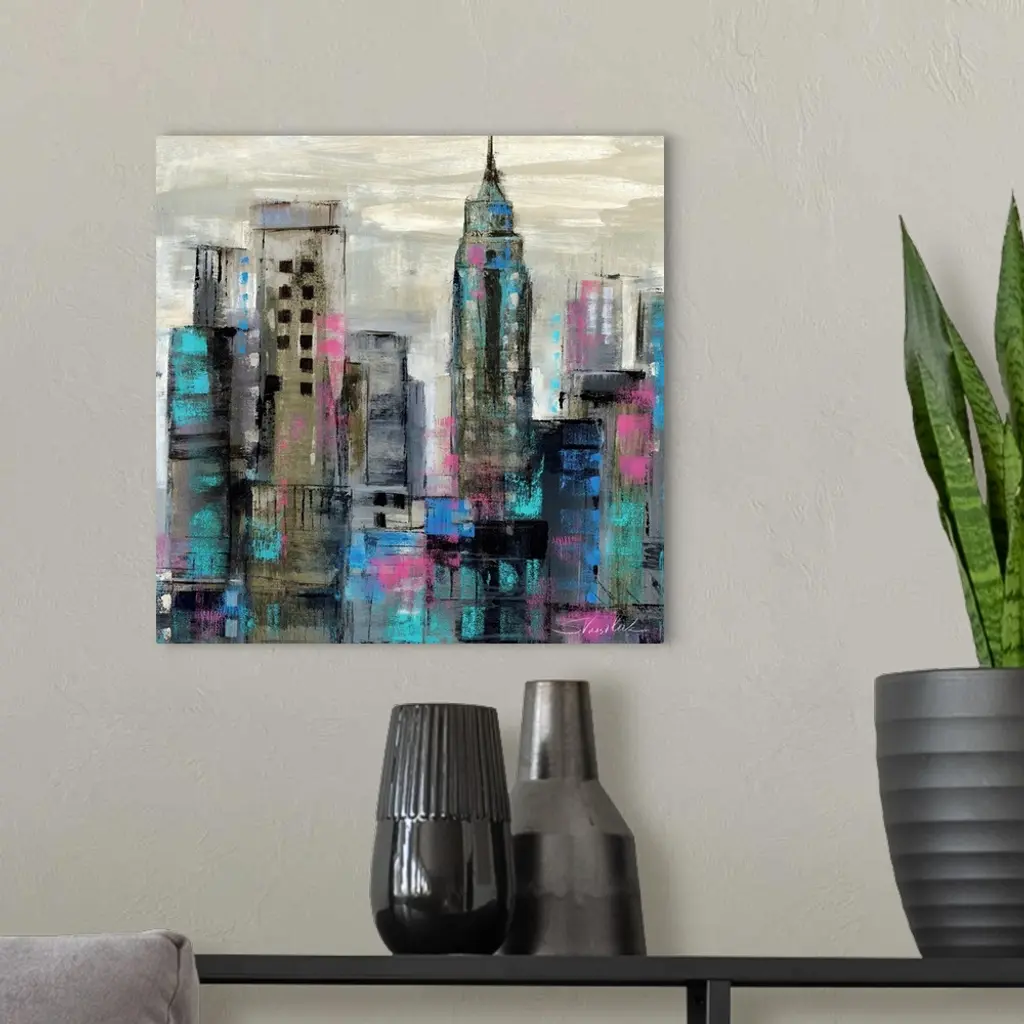 Contemporary painting of a city skyline in dark cool tones.