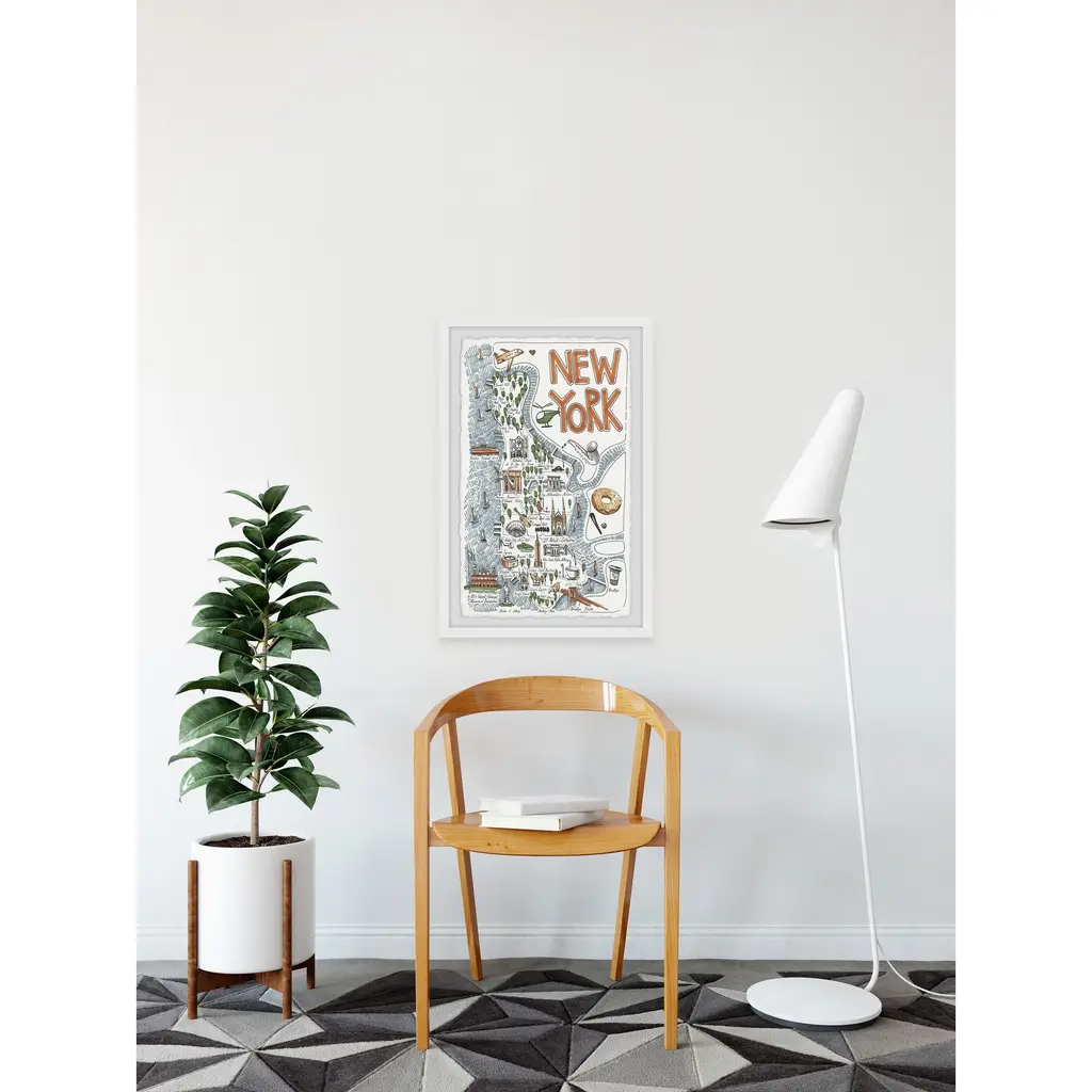 Showcase all that The Empire State has to offer by hanging up this green and blue, image-filled map of New York and its most notable spots. Proudly printed in the USA, this piece is printed on high quality archive paper and professionally hand-framed. With wall-mounting hooks included, this artful accent is ready to hang up as soon as it reaches your front door. • Top quality Giclee print on high resolution Archive Paper • Hand cut deckled edges • High quality durable non-warping frame • Finished under shatter resistant plexiglass • Arrives ready to hang • Includes a certificate of authenticity • Printed in the USA