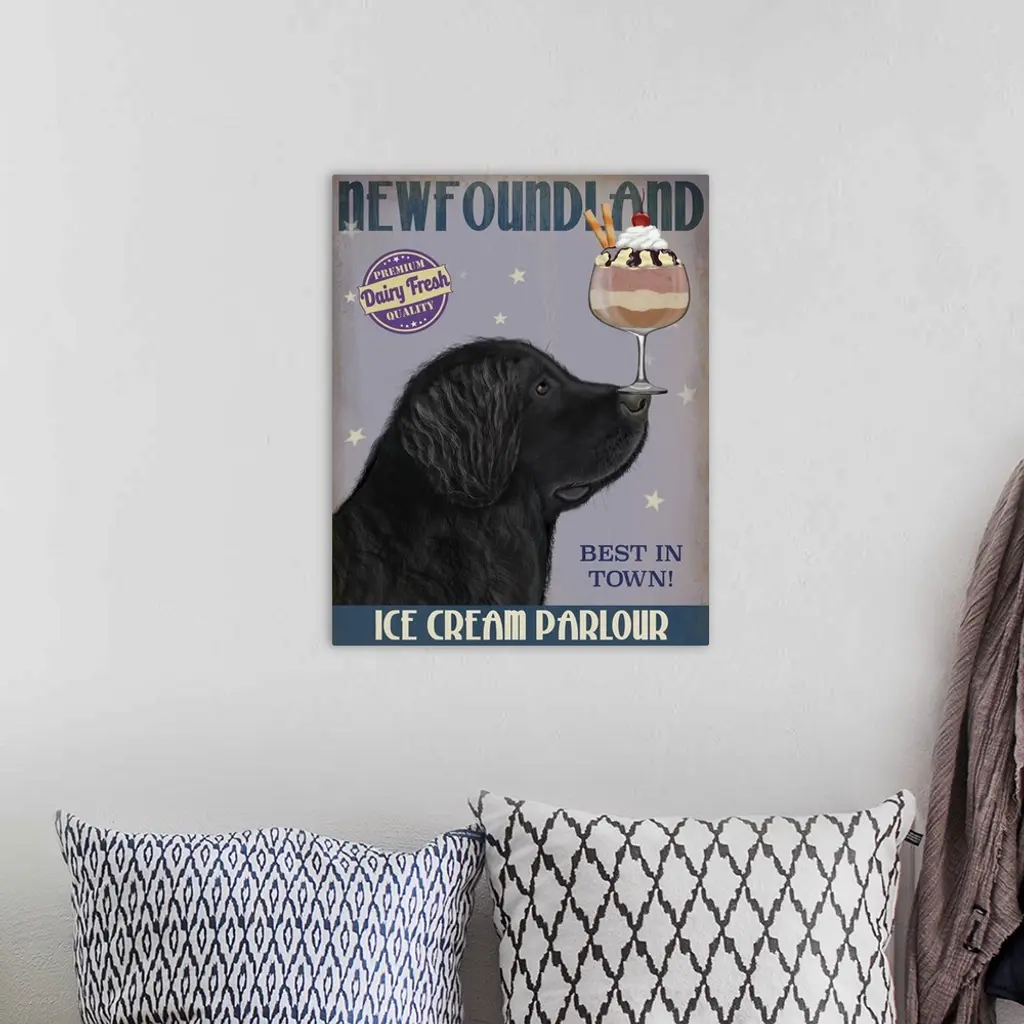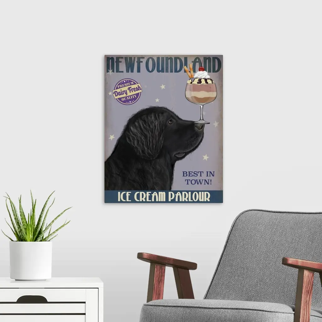 Decorative artwork of a Newfoundland balancing an ice cream sundae on its nose in an advertisement for an ice cream parlour.