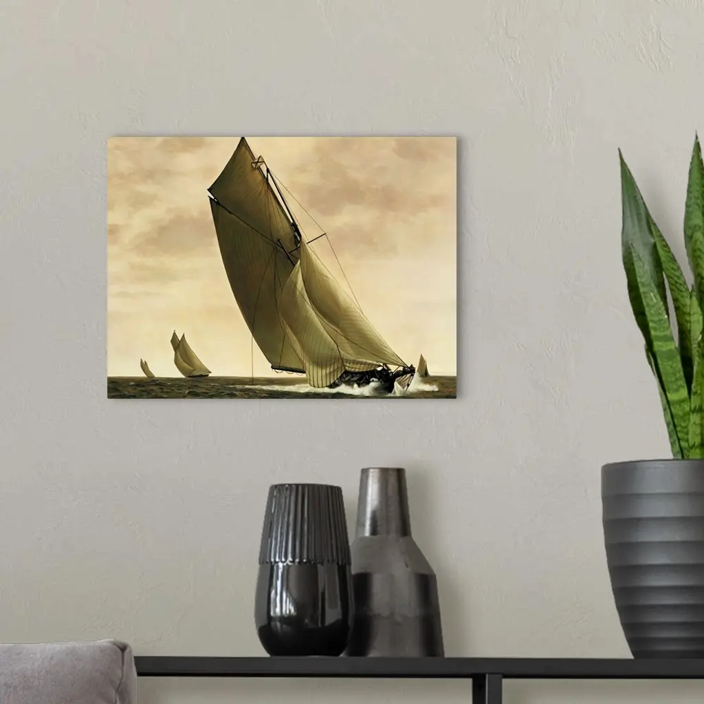 Contemporary painting of sailboats in the middle of the ocean with the wind blowing to the left.