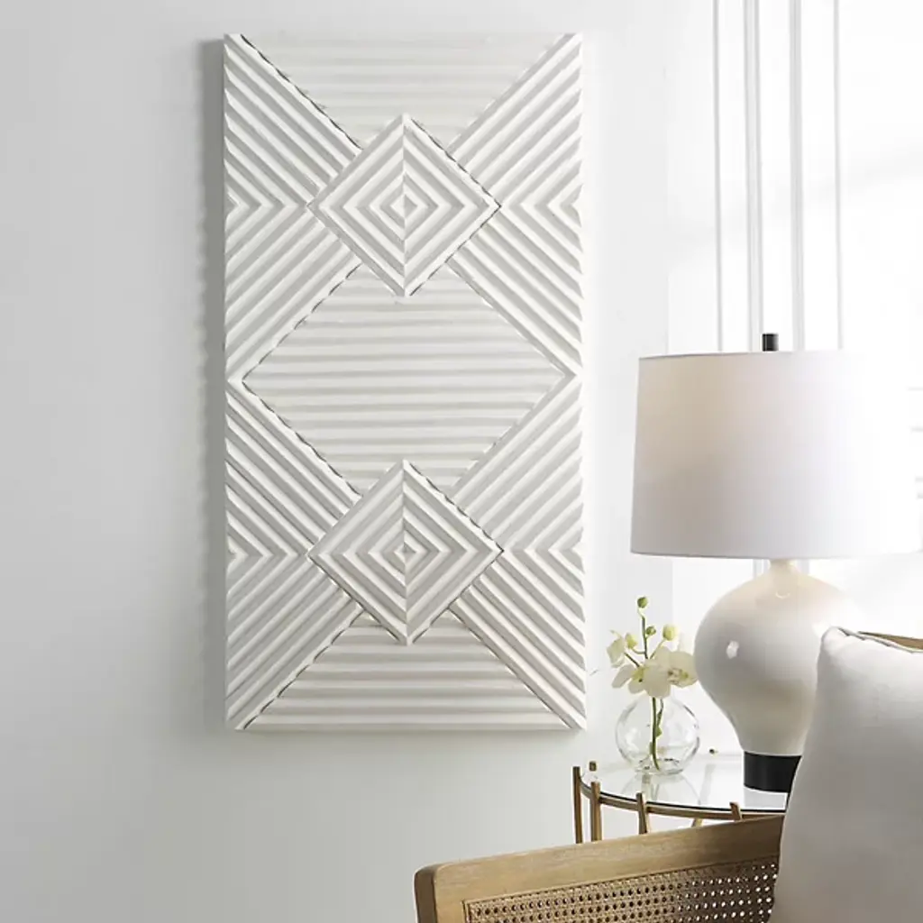The Nexus Wall Art from Uttermost plays with perception through its precisely arranged wooden slats that create geometric dimensionality. Natural fir strips arranged in mathematical patterns produce an optical effect that shifts as viewers move around the piece. The geometric arrangement directs light and shadow across the surface, creating a sense of movement within a static form. Multiple panels installed together create an expansive architectural effect that transforms ordinary wall space. Each piece maintains consistent quality while allowing the natural variations in the wood to shine through. This wall décor bridges the gap between purposeful wall covering and artistic expression through its carefully considered arrangement of simple materials.