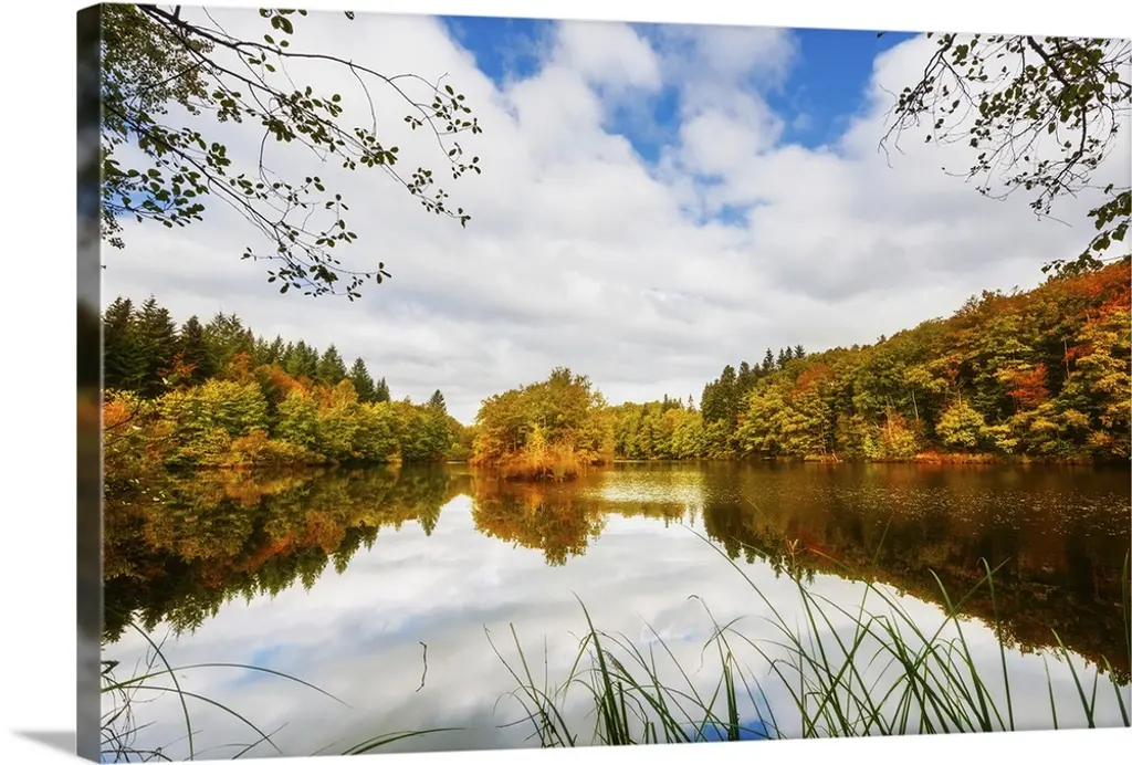 Nice Autumn Trees With Forest Lake, Landscape Canvas Art Print, 60"x28"
