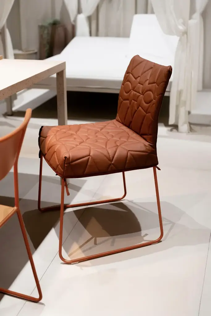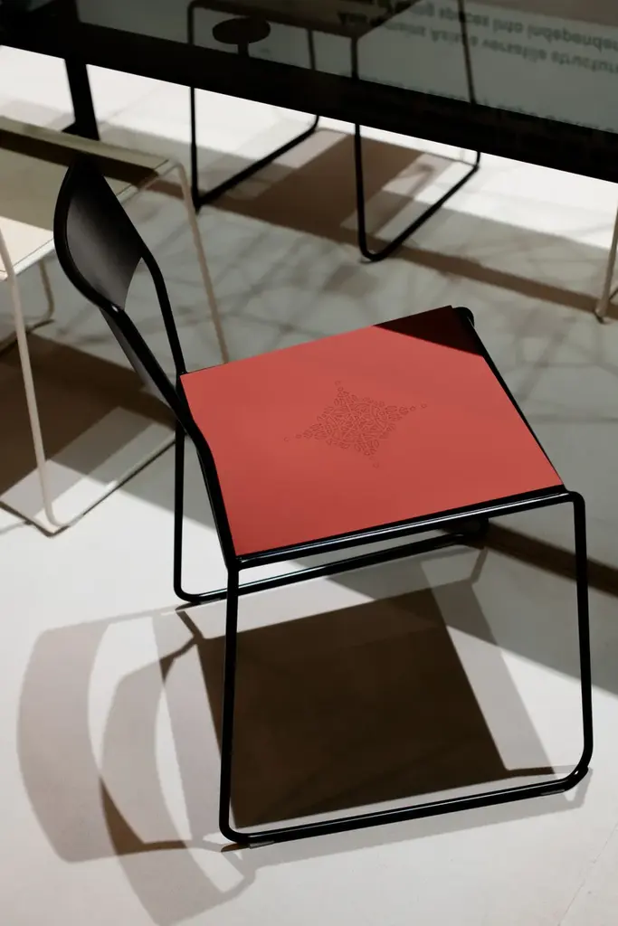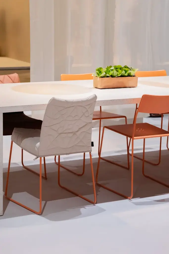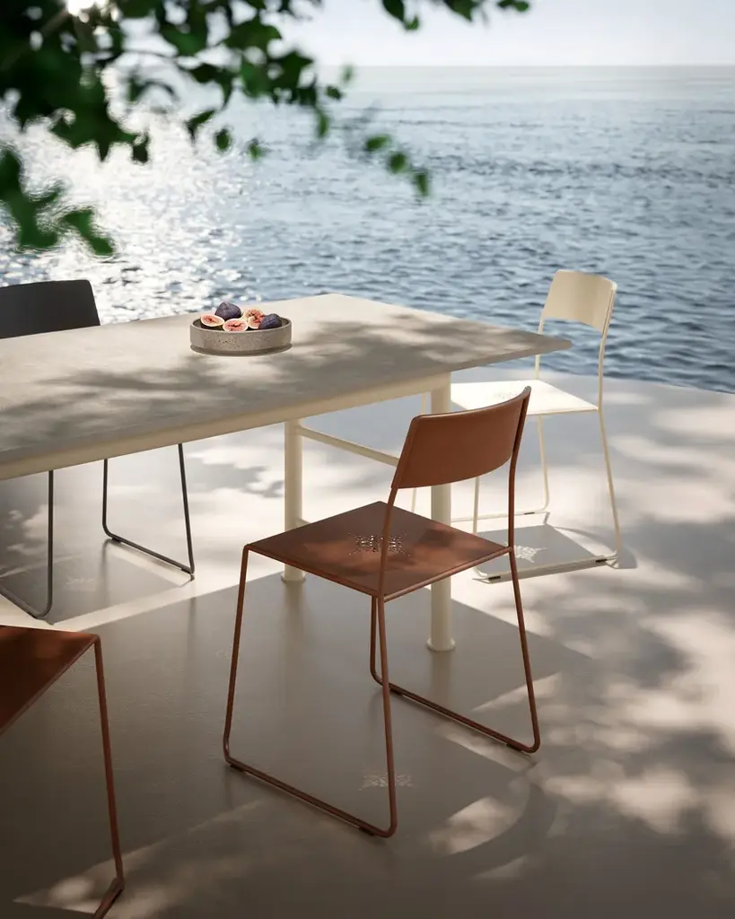 Nigelle is a stackable chair in powder-coated sled frame steel. The seat decoration is inspired by Tuscan lace and allows water drainage. Suitable for indoor/outdoor use. Chairs in a pack of four pieces. Finishes: painting with EcoShield* protective coating in beige, light grey, terracotta, black.Accessories: Upholstered seat and backrest in quilted coated fabric available in beige, light gray, terracotta, black. Cushion/pad in recycled plastic material with decorations. Finishes: beige, light gray, terracotta.*EcoShield: Treatment ensuring exceptional protection against corrosion caused by atmospheric agents, using water-based paints to reduce environmental impact. The resulting coating is durable over time and effectively resists wear and deterioration.A tribute to artisanal mastery, passed down through generations with elegance, authenticity, and durability. The ethereal delicacy of lace, reinterpreted through the strength and pureness of contemporary design. From this encounter comes Nigelle, the outdoor seating collection designed by Maurizio Galante and Tal Lancman.Its defining feature is the perforated pattern on the seat, inspired by the lightness and complexity of Renaissance lacework. A motif that recalls the reticello, one of the most refined techniques of Tuscan lace-making, documented as early as the late 15th century. Intricate geometries of rosettes and circular medallions adorned noble garments and fine linens, thus handing down the art of threadwork to history.Even the name chosen for the collection contains a nod to this extraordinary craft. Nigelle is the French name for Nigella, a tribute to the designers’ country of adoption, is a light, delicate flower that shares a refined aesthetic with Tuscan lace. Its thin petals and the network of stamens and laments resemble the airy patterns of lacework, while theornamental capsule that appears after flowering recalls the richness of handmade embroidery.In Nigelle, timeless gestures and authentic tradition come together with the tastes and needs of the contemporary world. “We wanted to create an object that serves as a bridge between past and future, between the delicacy of Tuscan lace and the solidity of steel. Nigelle is a play of contrasts that becomes harmony, a symbol of connection between materials, cultures, contexts and experiences,” explain Maurizio Galante and Tal Lancman.