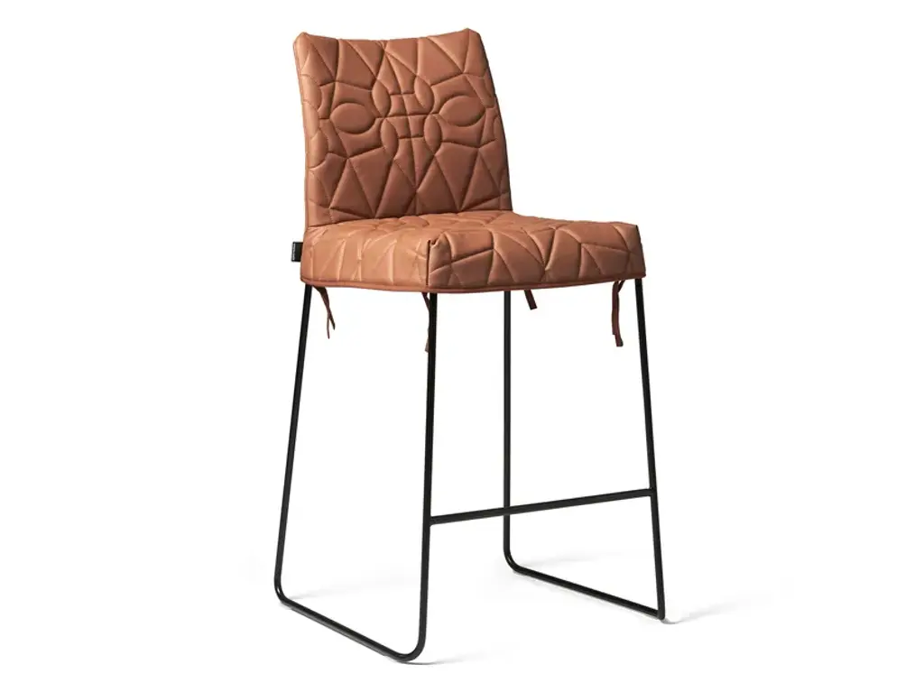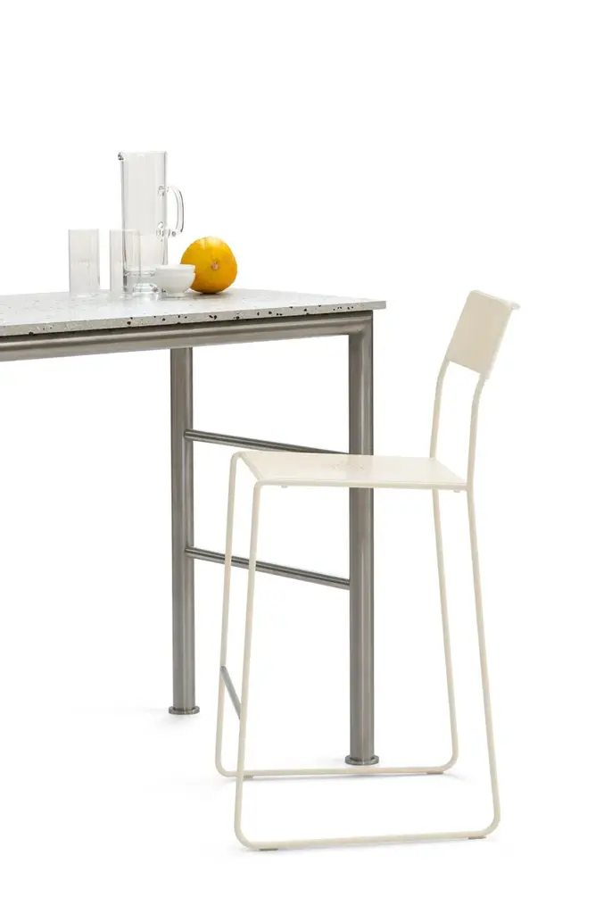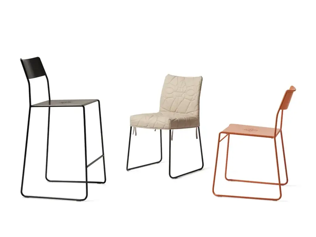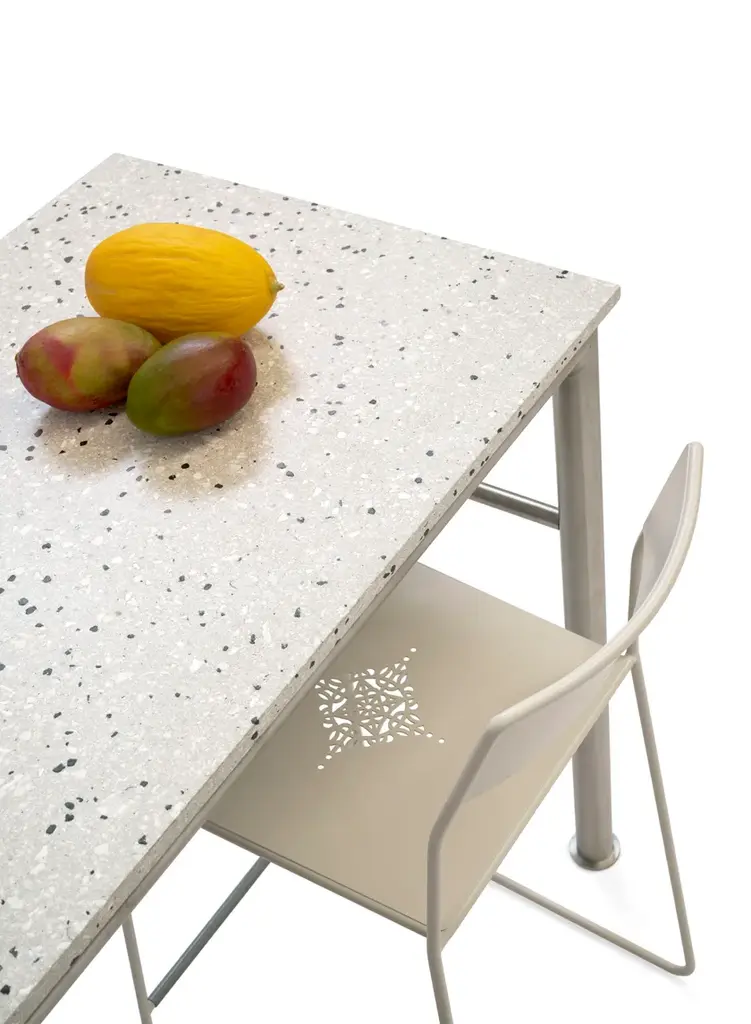 Nigelle is a stackable stool in powder-coated sled frame steel. The seat decoration is inspired by Tuscan lace and allows water drainage. Suitable for indoor/outdoor use. Stools in a pack of two pieces.Finishes: painting with EcoShield* protective coating in beige, light grey, terracotta, black.Accessories: Upholstered seat and backrest in quilted coated fabric available in beige, light gray, terracotta, black. Cushion/pad in recycled plastic material with decorations. Finishes: beige, light gray, terracotta.*EcoShield: Treatment ensuring exceptional protection against corrosion caused by atmospheric agents, using water-based paints to reduce environmental impact. The resulting coating is durable over time and effectively resists wear and deterioration.A tribute to artisanal mastery, passed down through generations with elegance, authenticity, and durability. The ethereal delicacy of lace, reinterpreted through the strength and pureness of contemporary design. From this encounter comes Nigelle, the outdoor seating collection designed by Maurizio Galante and Tal Lancman.Its defining feature is the perforated pattern on the seat, inspired by the lightness and complexity of Renaissance lacework. A motif that recalls the reticello, one of the most refined techniques of Tuscan lace-making, documented as early as the late 15th century. Intricate geometries of rosettes and circular medallions adorned noble garments and fine linens, thus handing down the art of threadwork to history.Even the name chosen for the collection contains a nod to this extraordinary craft. Nigelle is the French name for Nigella, a tribute to the designers’ country of adoption, is a light, delicate flower that shares a refined aesthetic with Tuscan lace. Its thin petals and the network of stamens and laments resemble the airy patterns of lacework, while theornamental capsule that appears after flowering recalls the richness of handmade embroidery.In Nigelle, timeless gestures and authentic tradition come together with the tastes and needs of the contemporary world. “We wanted to create an object that serves as a bridge between past and future, between the delicacy of Tuscan lace and the solidity of steel. Nigelle is a play of contrasts that becomes harmony, a symbol of connection between materials, cultures, contexts and experiences,” explain Maurizio Galante and Tal Lancman.