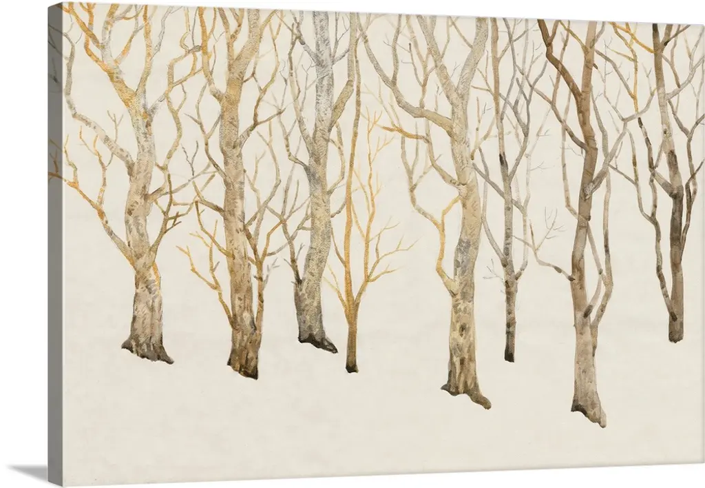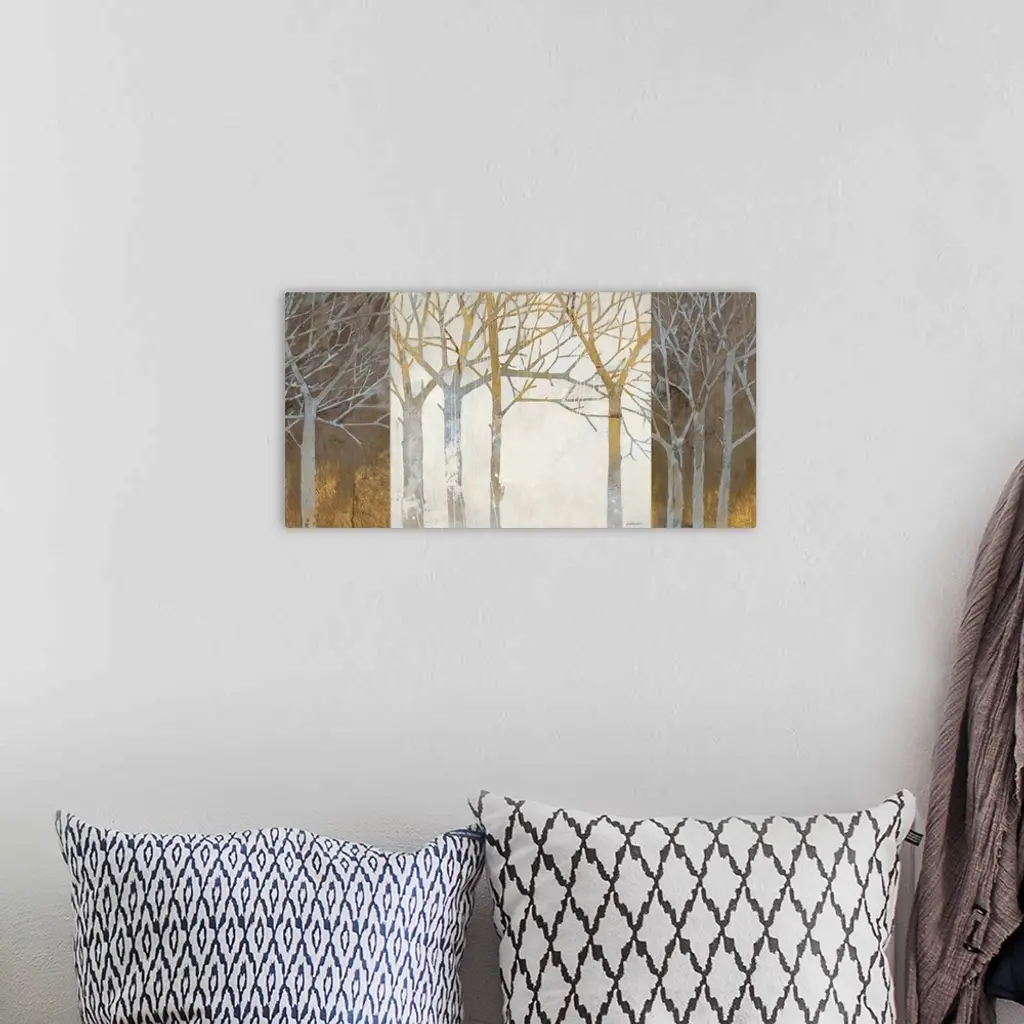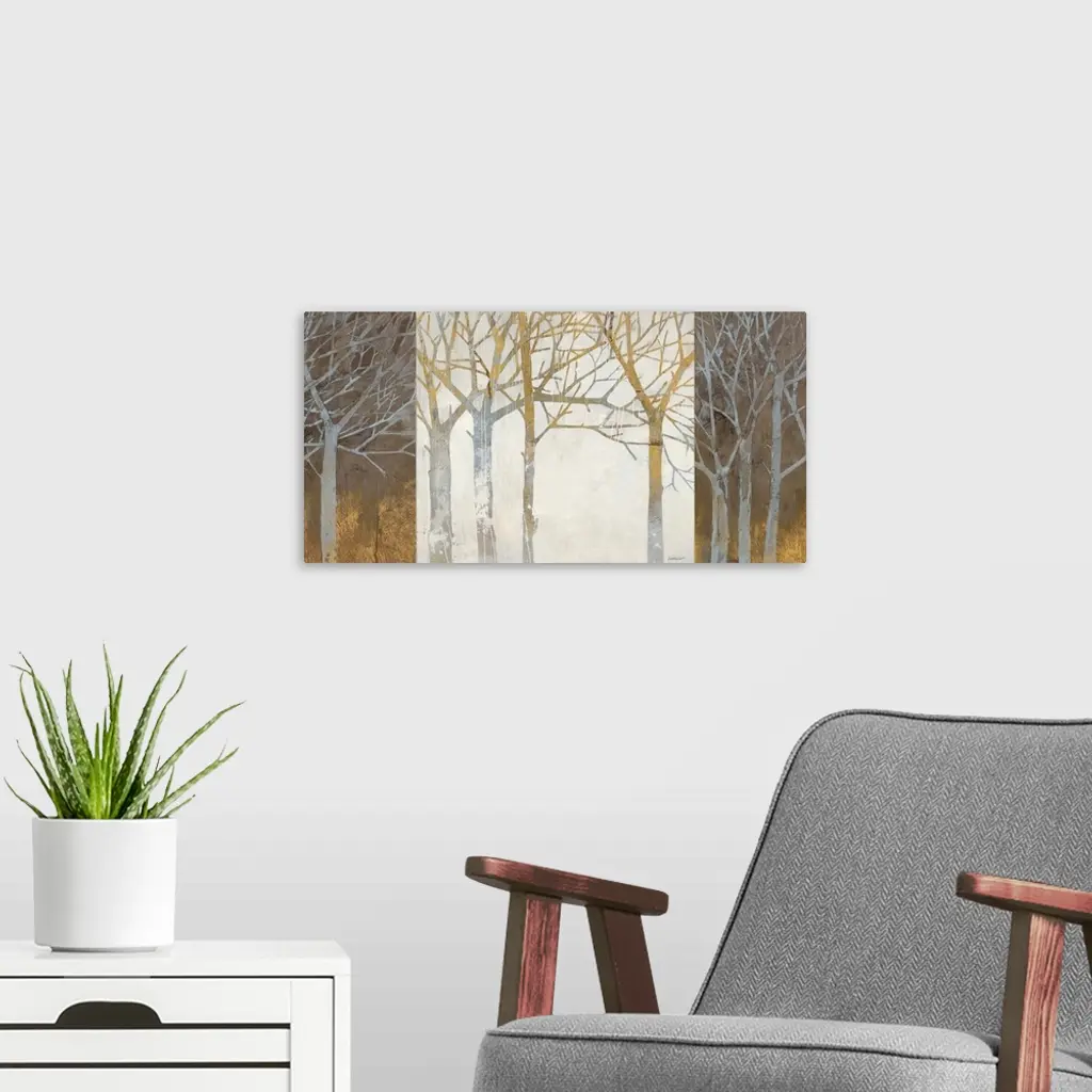 A panoramic shaped contemporary painting of a grove of silhouetted threes against a contrasting background divided into thirds.
