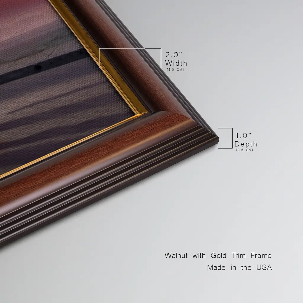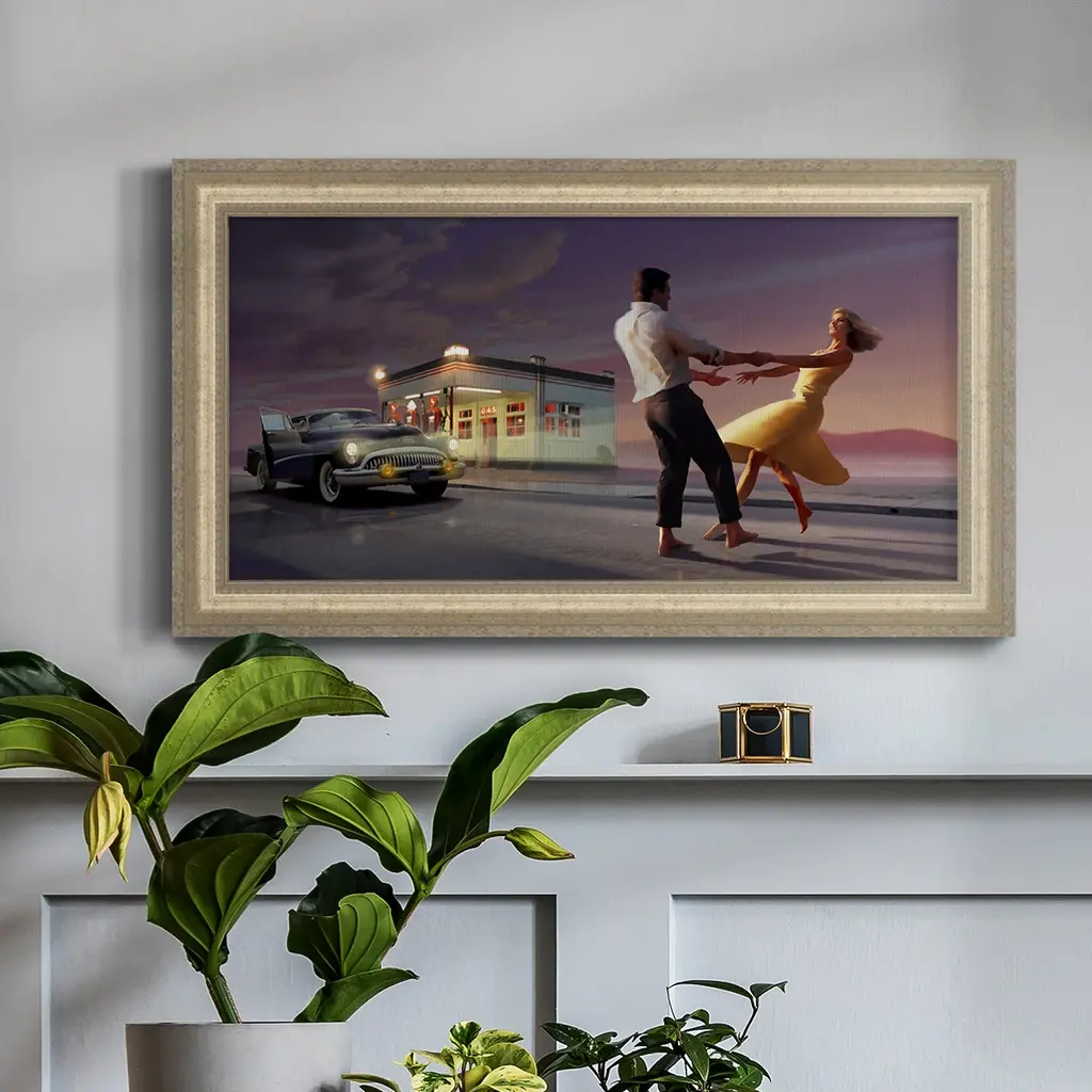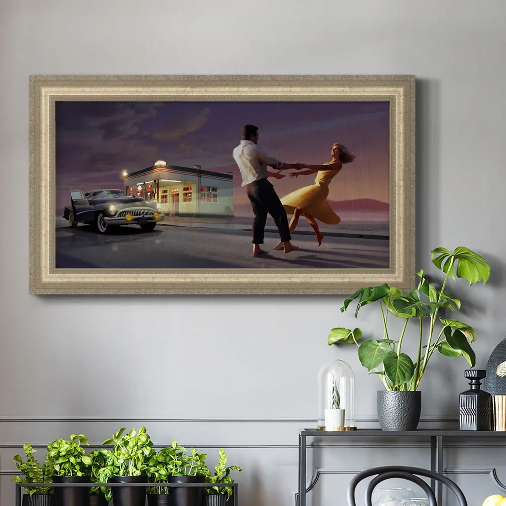Night Dance Premium Framed Canvas- Ready to Hang A Premium Framed Canvas created to last. Framed in distressed wood and available in an array of sizes and colors Featuring a beveled a solid wood stretcher bar, each piece comes ready to hand 3 SIZES AVAILABLE 21''X37'' - Overall Size 25''X45'' - Overall Size 29''x53'' - Overall Size Each piece is made to order. Each piece comes with hanging hardware. Made in the USA Ready to Hang Giclee Paper Print Acrylic Glass Beveled Matt Board