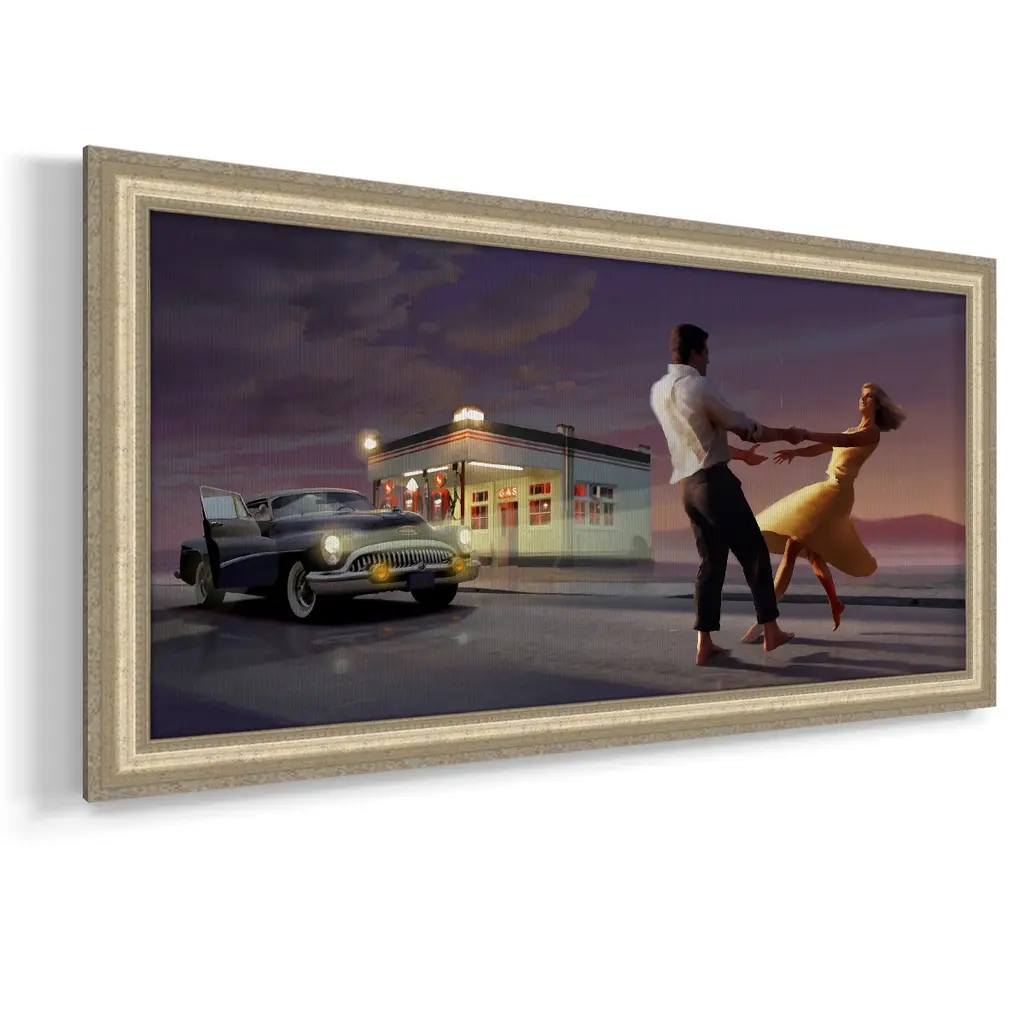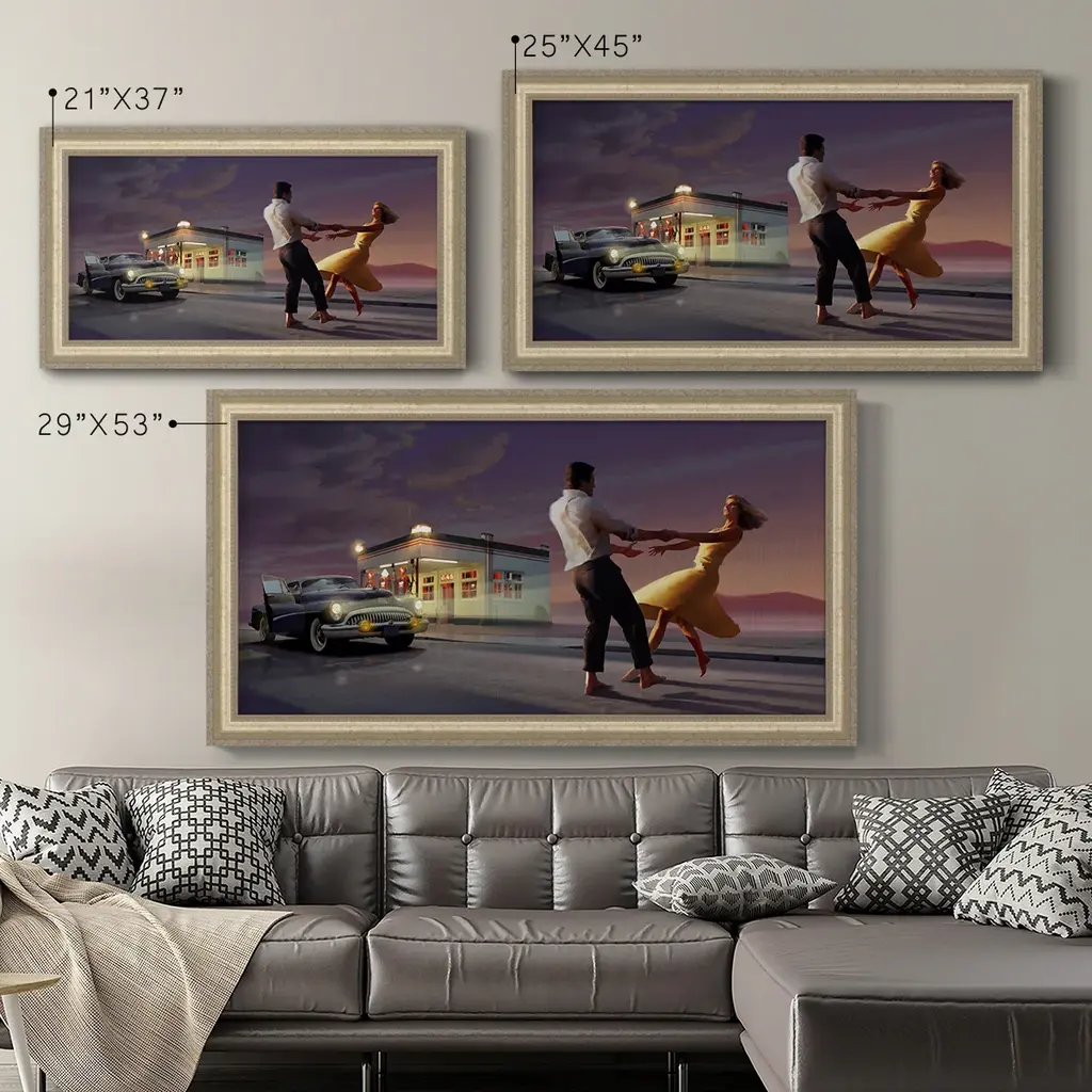 Night Dance Premium Framed Canvas- Ready to Hang A Premium Framed Canvas created to last. Framed in distressed wood and available in an array of sizes and colors Featuring a beveled a solid wood stretcher bar, each piece comes ready to hand 3 SIZES AVAILABLE 21''X37'' - Overall Size 25''X45'' - Overall Size 29''x53'' - Overall Size Each piece is made to order. Each piece comes with hanging hardware. Made in the USA Ready to Hang Giclee Paper Print Acrylic Glass Beveled Matt Board