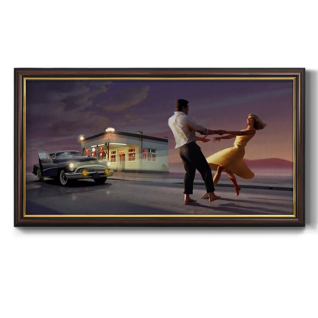 Night Dance Premium Framed Canvas- Ready to Hang A Premium Framed Canvas created to last. Framed in distressed wood and available in an array of sizes and colors Featuring a beveled a solid wood stretcher bar, each piece comes ready to hand 3 SIZES AVAILABLE 21''X37'' - Overall Size 25''X45'' - Overall Size 29''x53'' - Overall Size Each piece is made to order. Each piece comes with hanging hardware. Made in the USA Ready to Hang Giclee Paper Print Acrylic Glass Beveled Matt Board