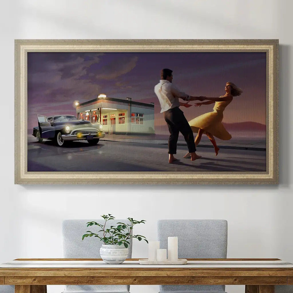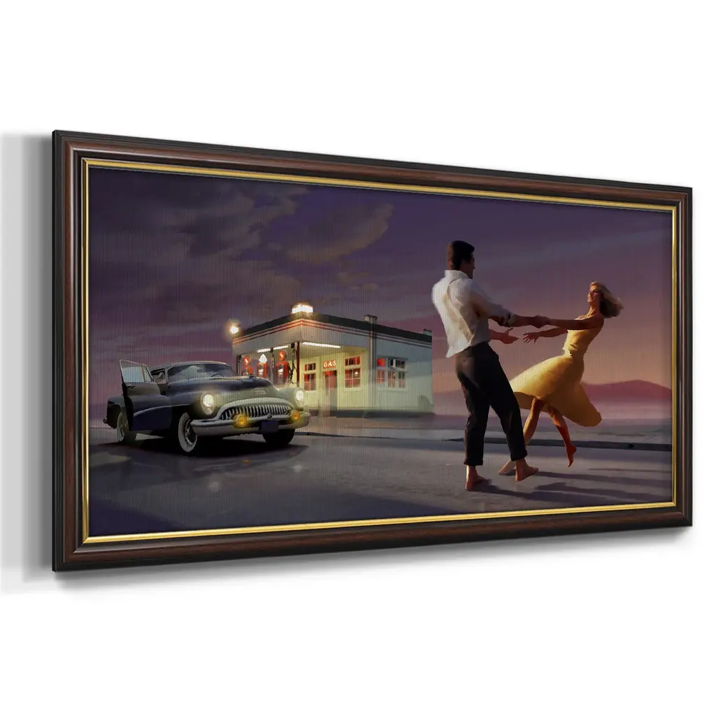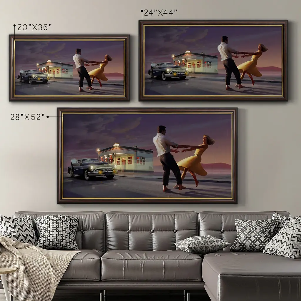 Night Dance Premium Framed Canvas- Ready to Hang A Premium Framed Canvas created to last. Framed in distressed wood and available in an array of sizes and colors Featuring a beveled a solid wood stretcher bar, each piece comes ready to hand 3 SIZES AVAILABLE 21''X37'' - Overall Size 25''X45'' - Overall Size 29''x53'' - Overall Size Each piece is made to order. Each piece comes with hanging hardware. Made in the USA Ready to Hang Giclee Paper Print Acrylic Glass Beveled Matt Board