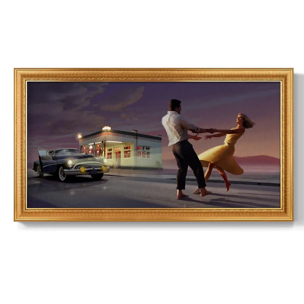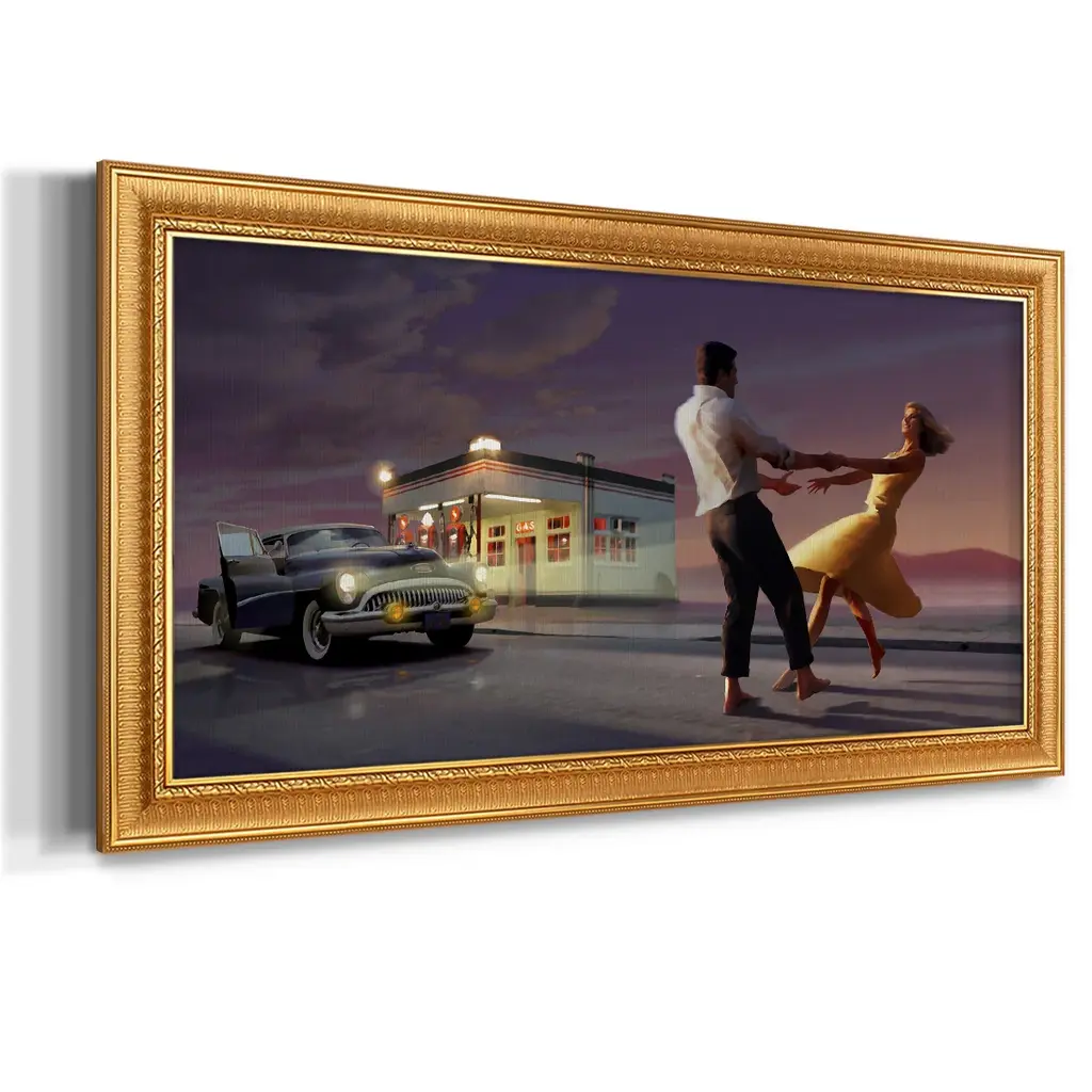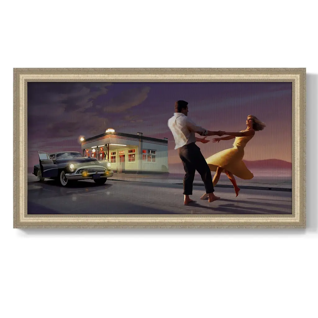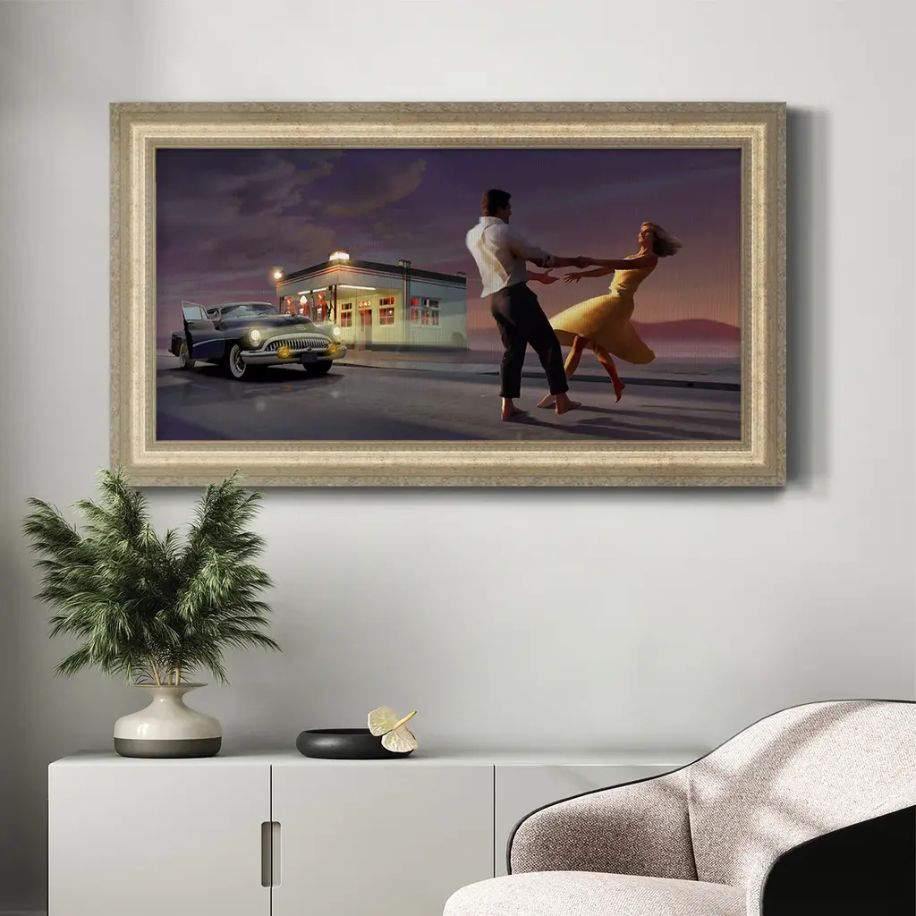 Night Dance Premium Framed Canvas- Ready to Hang A Premium Framed Canvas created to last. Framed in distressed wood and available in an array of sizes and colors Featuring a beveled a solid wood stretcher bar, each piece comes ready to hand 3 SIZES AVAILABLE 21''X37'' - Overall Size 25''X45'' - Overall Size 29''x53'' - Overall Size Each piece is made to order. Each piece comes with hanging hardware. Made in the USA Ready to Hang Giclee Paper Print Acrylic Glass Beveled Matt Board