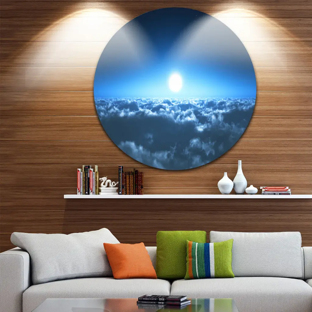 Bring Contemporary Abstraction to your home with this large Circle Metal wall art. This Night Flight above Clouds Metal Artwork makes it the focal point of any room or office. - White Gloss Coating ensures colors are extra vibrant with light reflection.- Aluminum grade Sheet Metal with 1 inch mounting frame on the back giving the illusion that the artwork is floating on the wall..- Mounting Brackets are included along with instructions.- High Quality Digital images are created directly into a glossy aluminum panel producing a stunning and captivating print into the glossy finish of the metal.- Water, Fire and Scratch resistant HD Aluminum panels.- Looks better than any photo paper and guaranteed to last at least 20 years- Easy to clean with a microfiber cloth. Colors are far superior to regular Canvas Art. - Easy to Hang