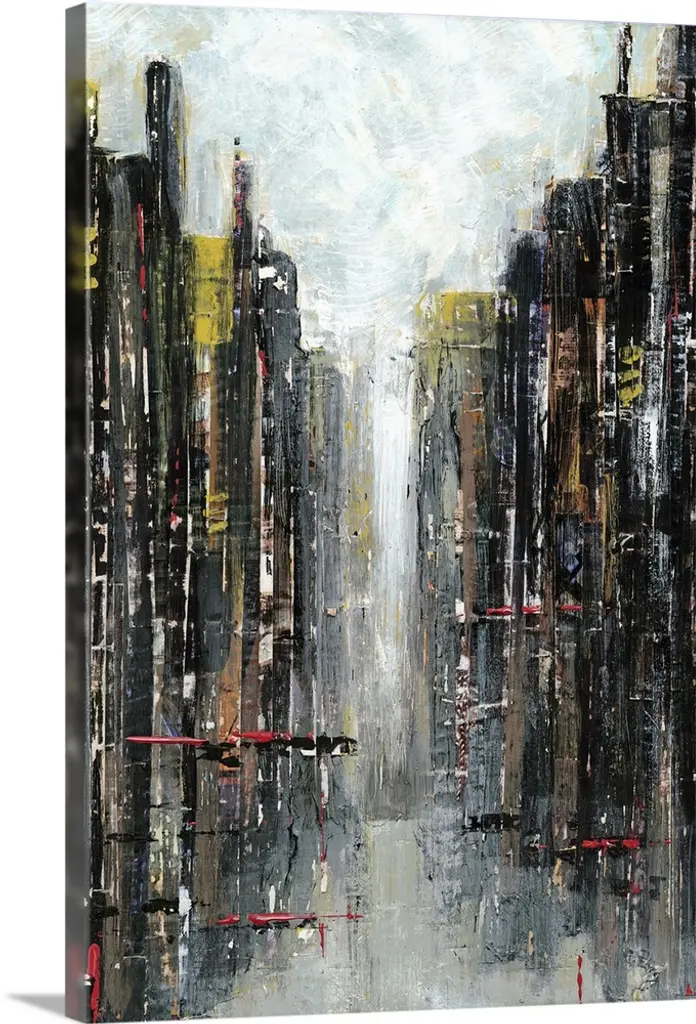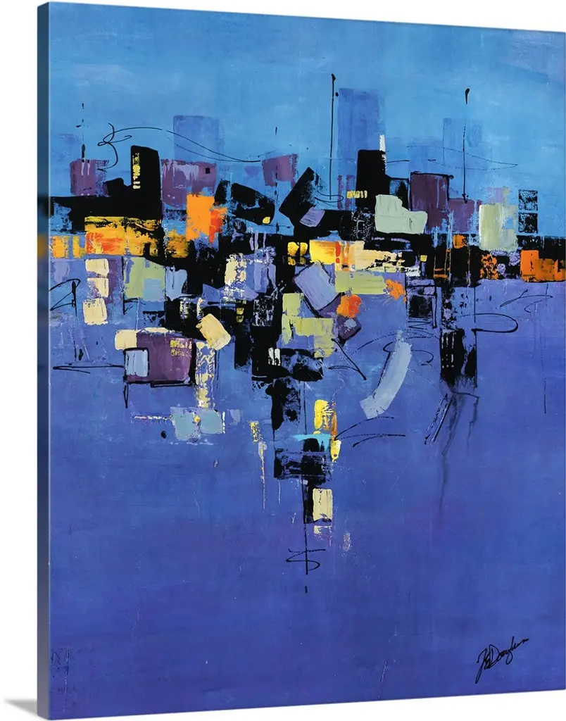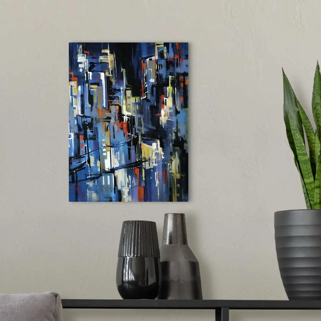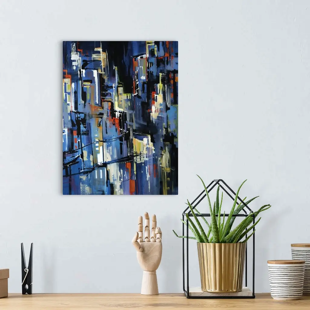 Large, vertical abstract painting in rough brushstrokes of a city packed with brightly lit buildings at night.