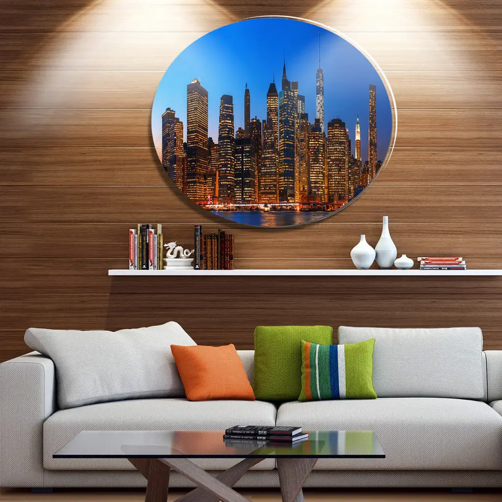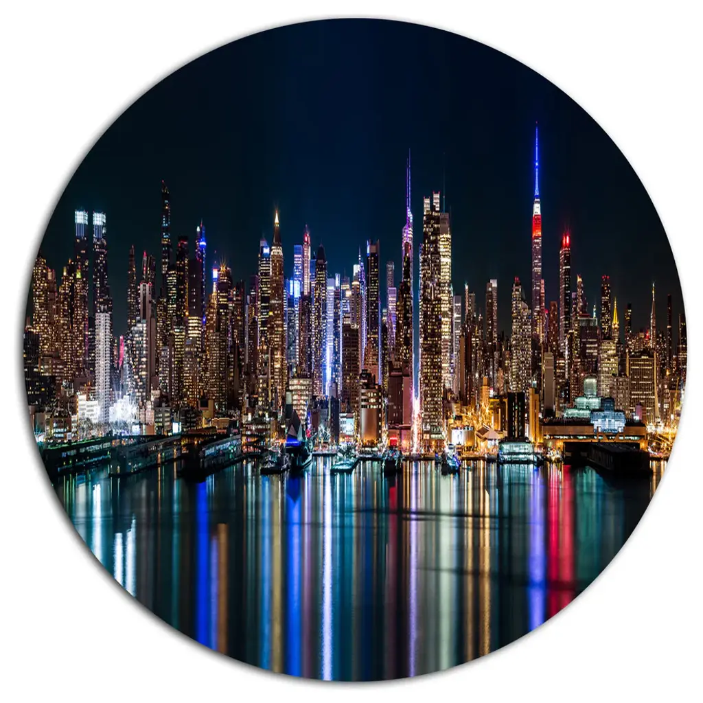 Bring Contemporary Abstraction to your home with this large Circle Metal wall art. This Night New York City Panorama Metal Artwork makes it the focal point of any room or office. - White Gloss Coating ensures colors are extra vibrant with light reflection.- Aluminum grade Sheet Metal with 1 inch mounting frame on the back giving the illusion that the artwork is floating on the wall..- Mounting Brackets are included along with instructions.- High Quality Digital images are created directly into a glossy aluminum panel producing a stunning and captivating print into the glossy finish of the metal.- Water, Fire and Scratch resistant HD Aluminum panels.- Looks better than any photo paper and guaranteed to last at least 20 years- Easy to clean with a microfiber cloth. Colors are far superior to regular Canvas Art. - Easy to Hang