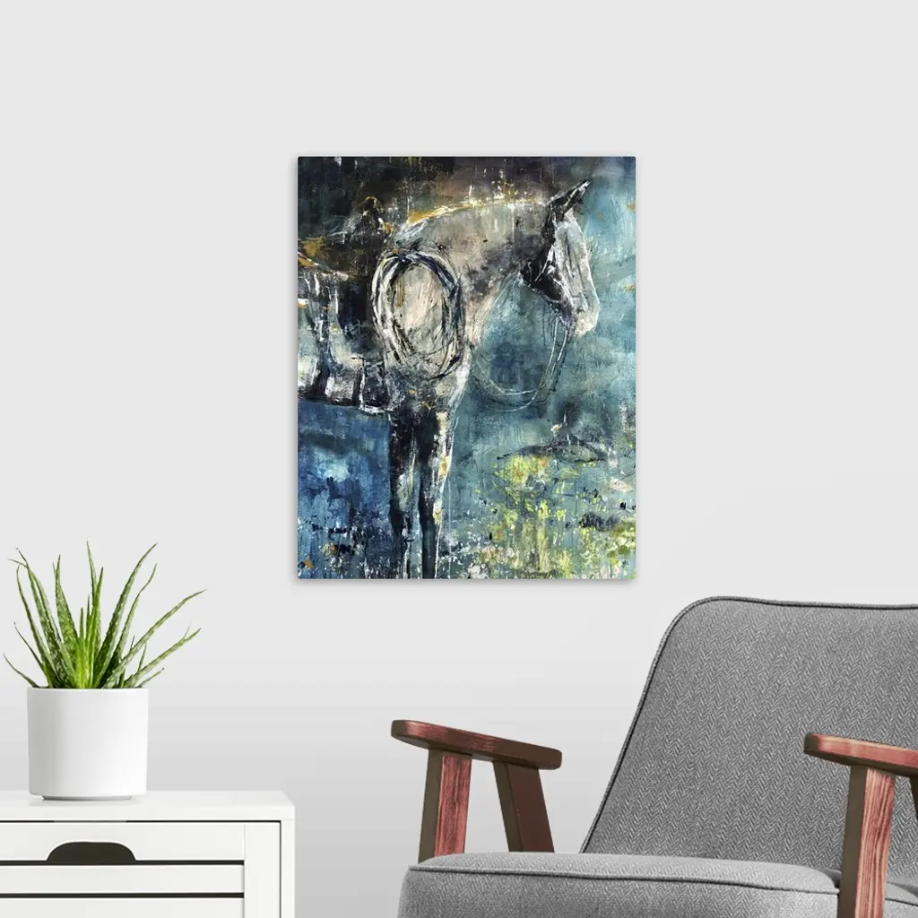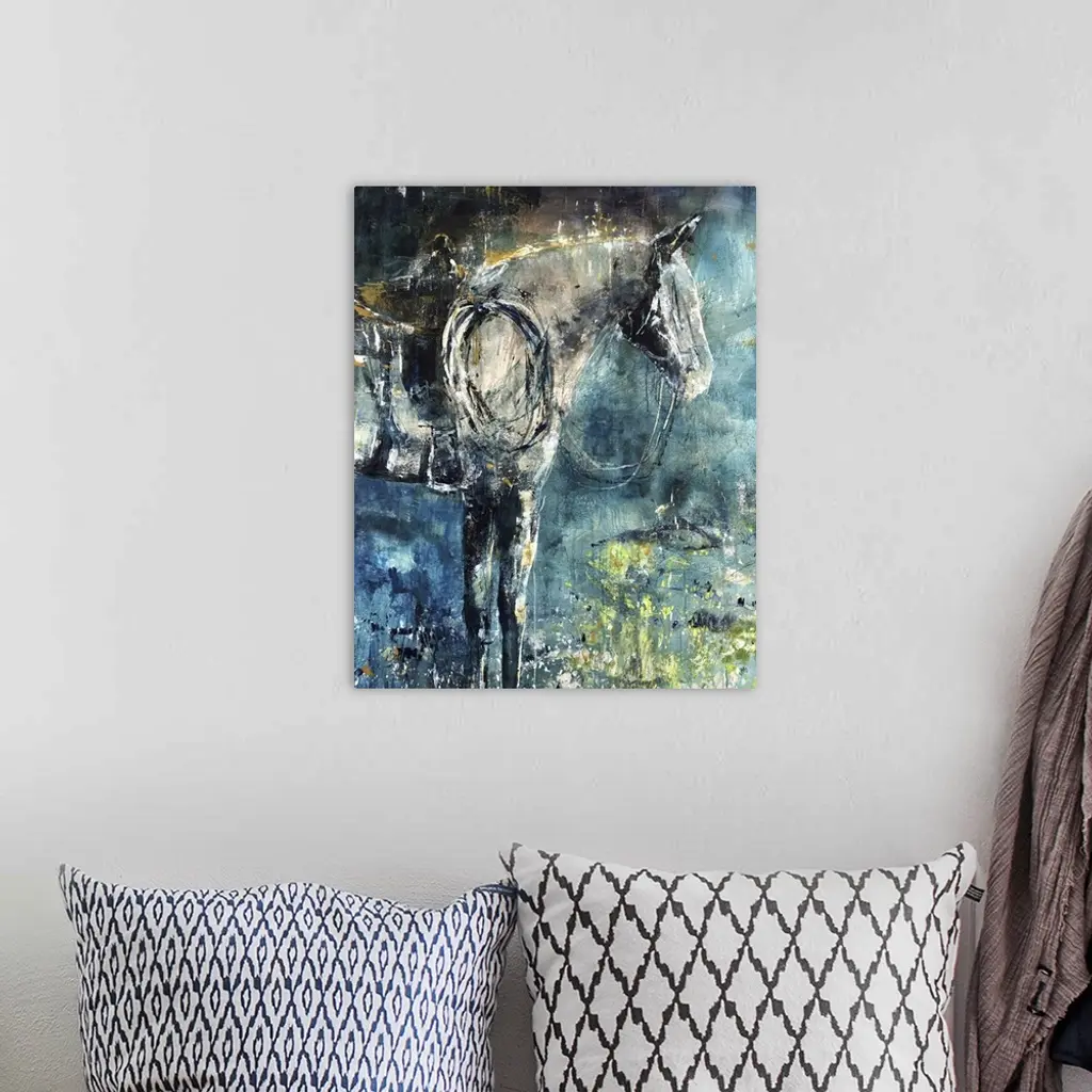 Contemporary painting of a profile of a horse wearing a saddle and reins.
