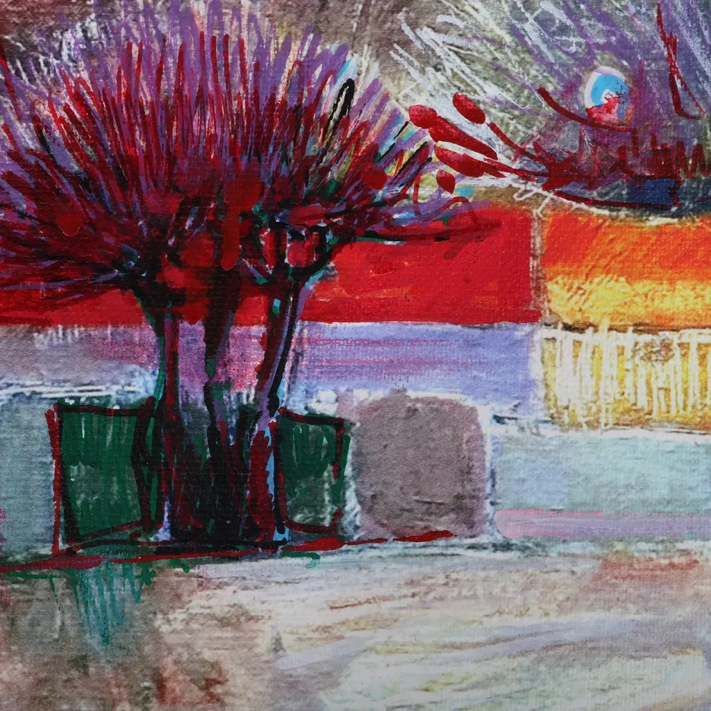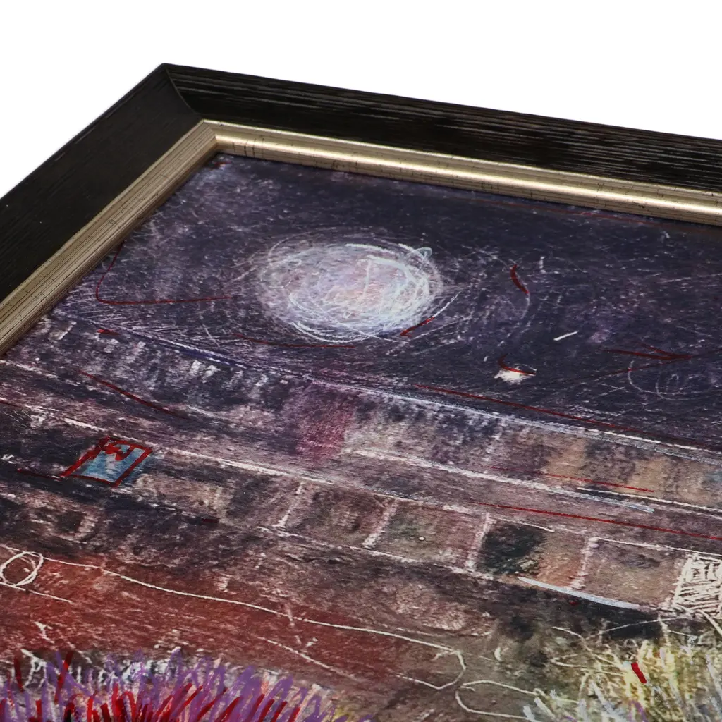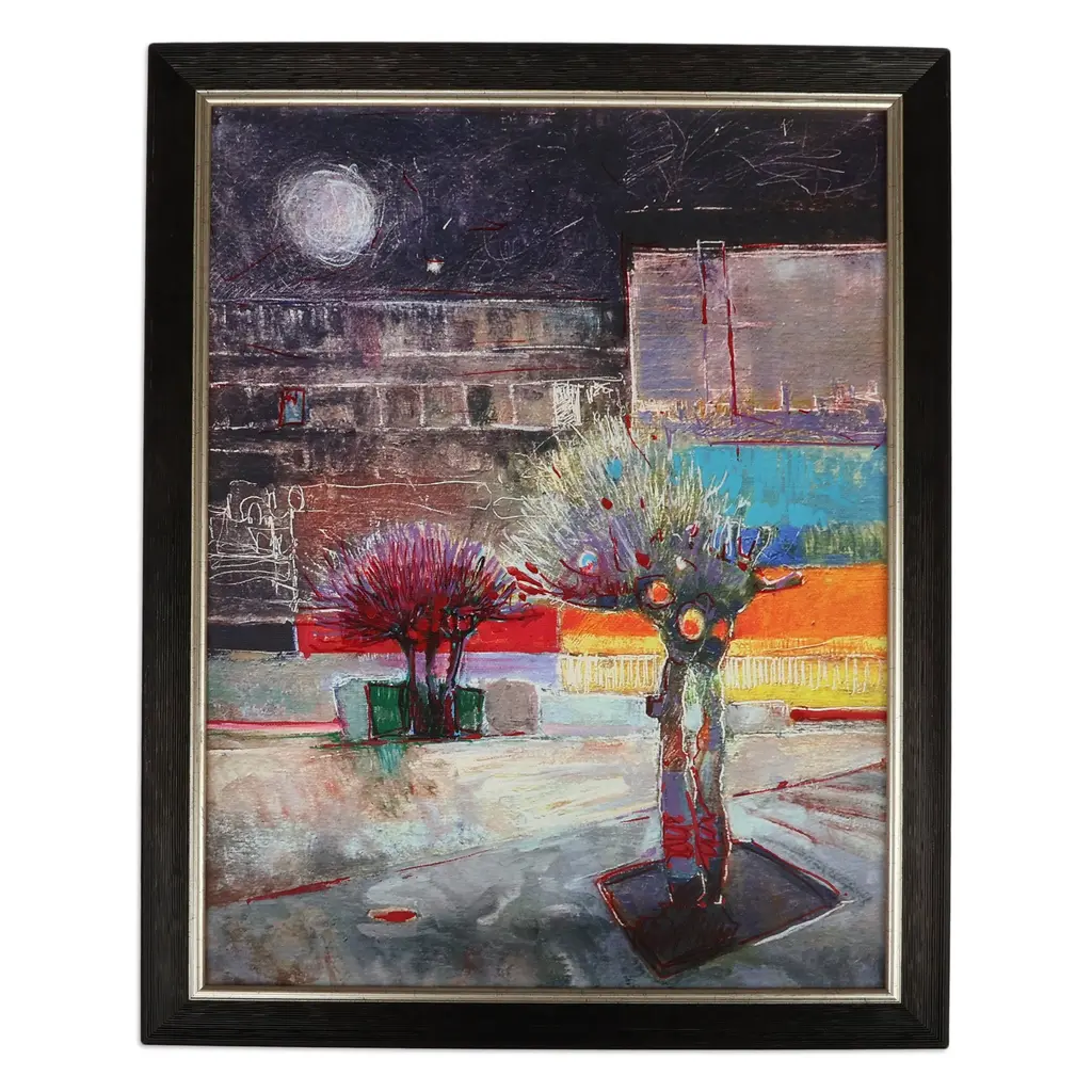 Armenia's nights are serene and full of enchanting colors—just like this painting by Vahagn Ghazaryan. Acrylic and markers reunite in the details that compose this impressionist composition, honoring the region's urban life and cultural impact.The painting has an acrylic frame in silver and black hues.