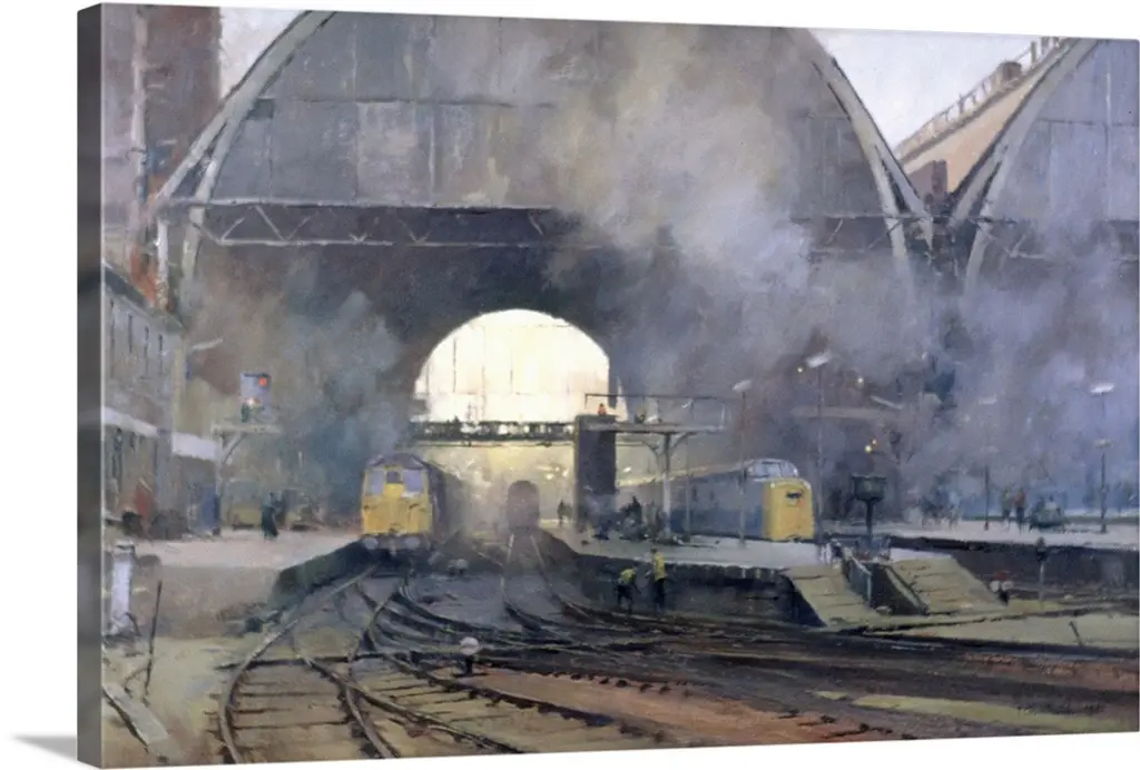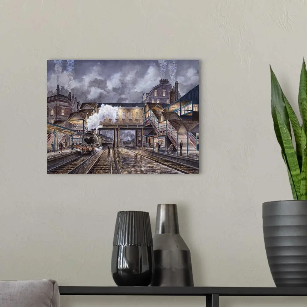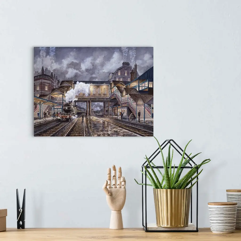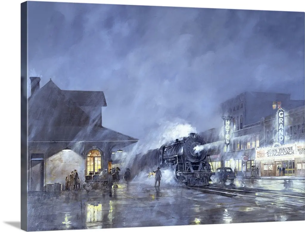 Contemporary painting of a train making a stop to pick up passengers at dusk.