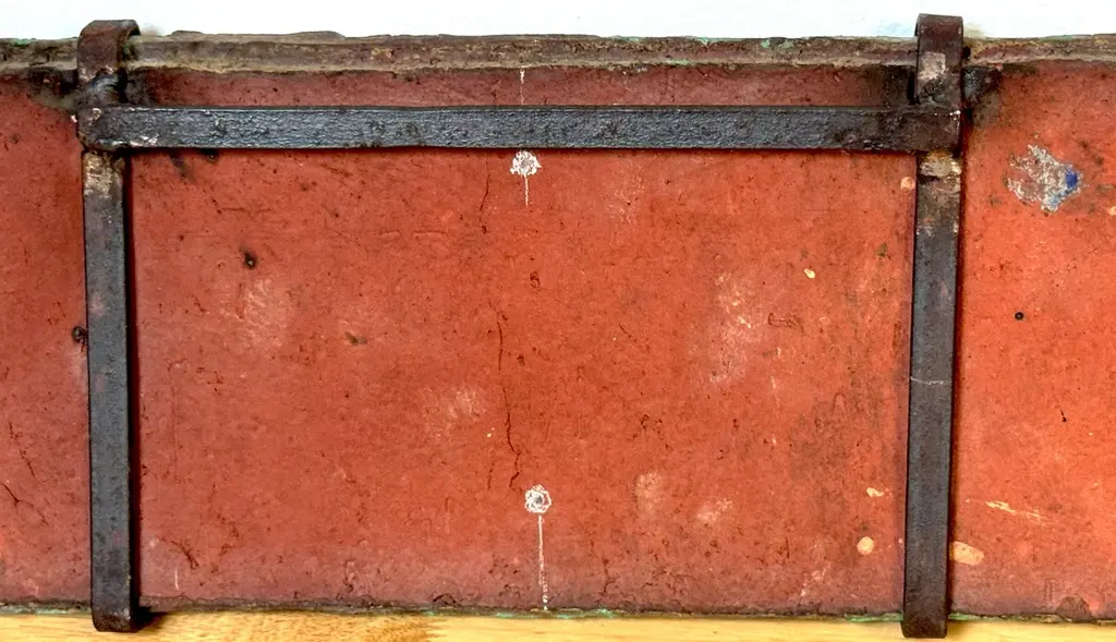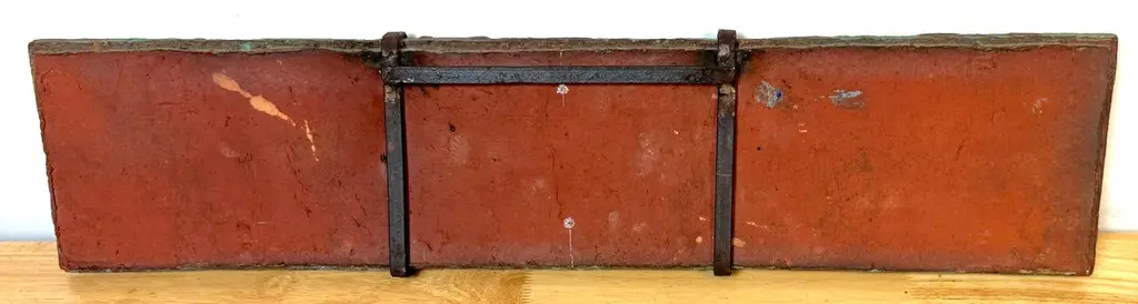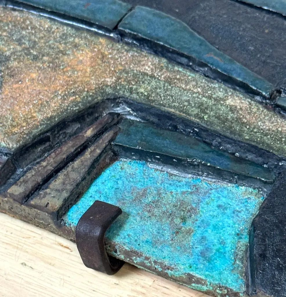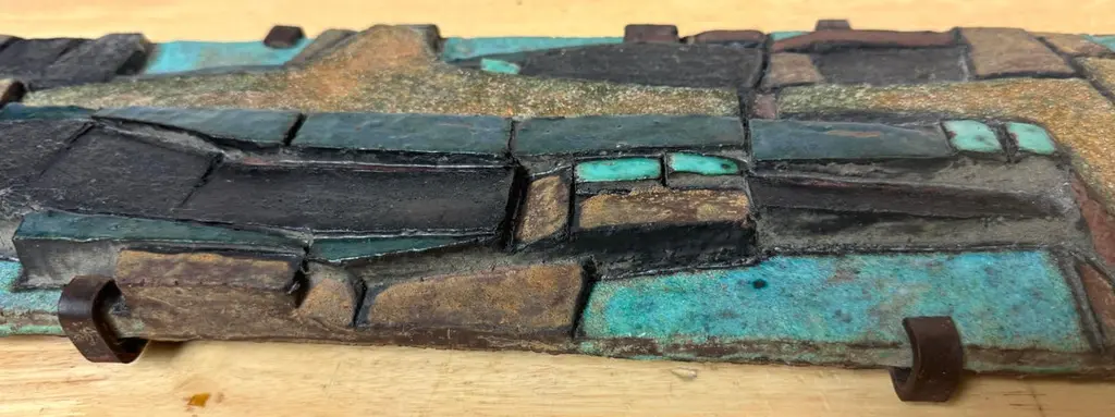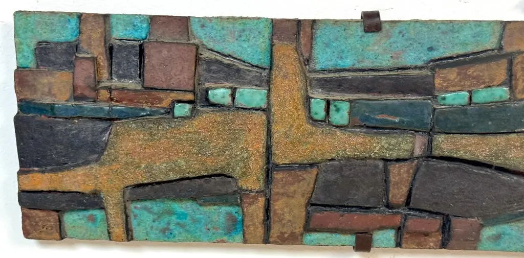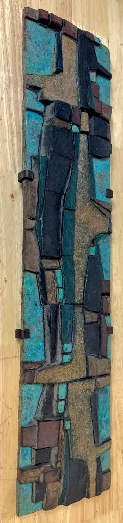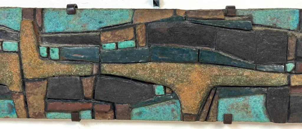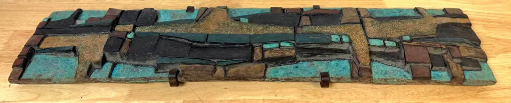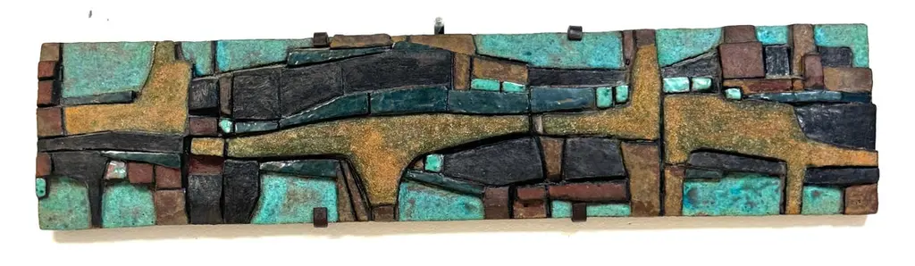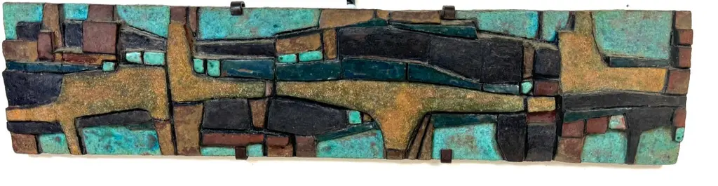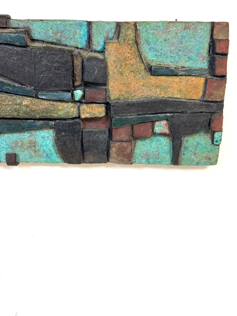Nijole Šivickas, High-Fired Clay Cubist Landscape Wall Panel, circa 1970sLithuanian-born Colombian artist Nijole Šivickas (1925–2018)High-fired clay with oxides and pigments, custom wrought-iron mount28" W × 6.5" H × 1.5" DThis exceptional wall panel by Lithuanian-born Colombian artist Nijole Šivickas reflects her postwar European modernist training and her later immersion in the vivid material culture of Latin America. Crafted in the 1970s and acquired directly from the artist, it exemplifies her mastery of relief-mosaic ceramic technique. The high-fired clay surface is built up into an intricate network of interlocking geometric forms, each uniquely finished: some retain a gritty, sand-textured matte surface, while others are glazed in mineral blues, turquoise, deep teal, warm ochres, and blacks. The turquoise and blue tones suggest copper oxide glazes, while the darker hues derive from iron and manganese-based pigments, all fused permanently into the clay body through high-temperature firing.The horizontal composition channels Cubist and Constructivist spatial thinking, abstracting the visual language of aerial landscapes, urban grids, or geological strata. Bands of blue evoke water or sky, while earthen tones suggest terrain or architectural foundations. The relief creates shifting shadows that animate the surface as light changes, reinforcing the sense of movement and layered depth.The work is presented in its original custom wrought-iron mount, designed as an integral architectural element and not removable. This approach was typical of Šivickas in the period, underscoring her intent for her ceramics to function as permanent, environment-shaping artworks.Provenance: Purchased directly from the artist in the 1970s.Most Recent Exhibitiations - 'Studio,' Museo de Arte Moderno de Bogotá (MAMBO), Colombia, 2024.