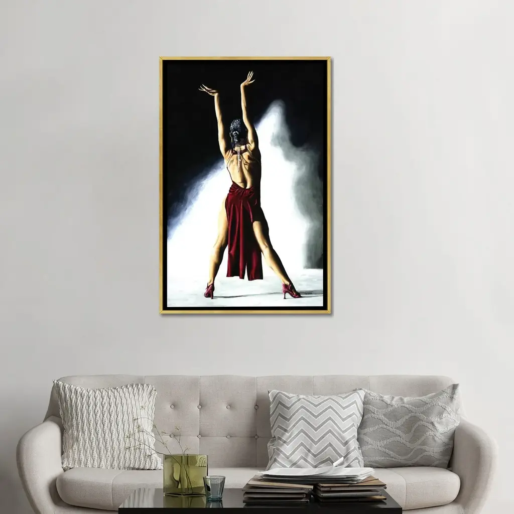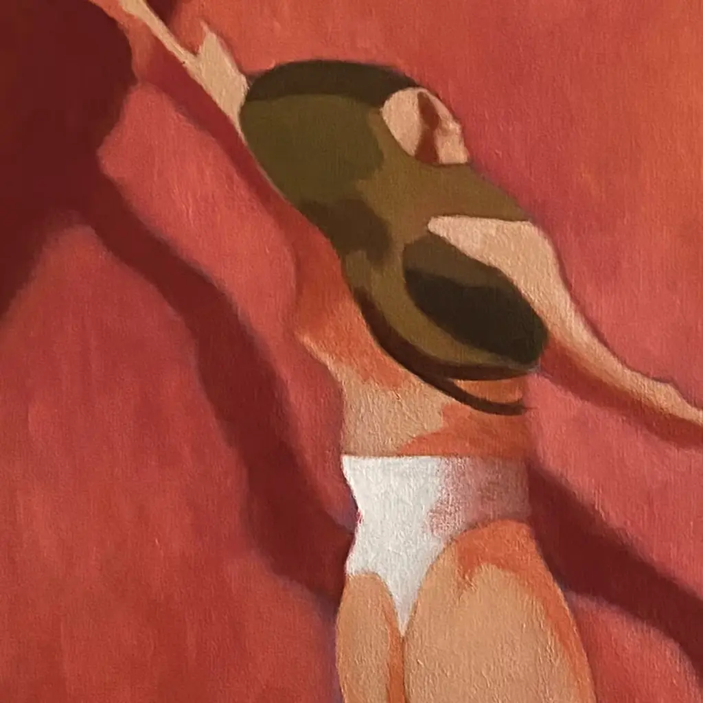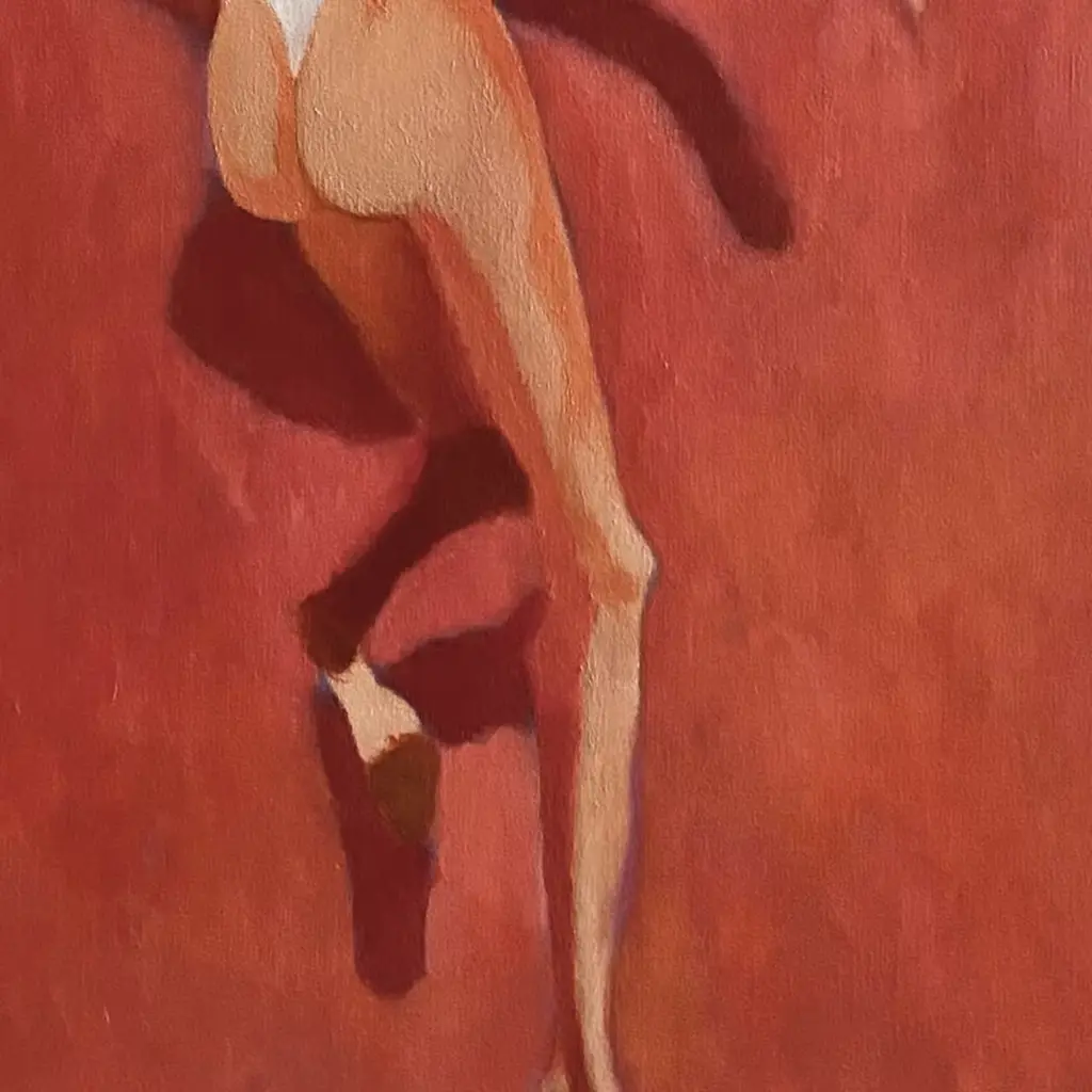 This refined oil painting celebrates the elegance of a woman seemingly captured while swimming in a red pool. Her stylized body moves following a graceful rhythm, which the painter images as if dictated by her own undetectable thoughts. Painted with meticulous care, it is an ode to the natural sensuality of women. An authenticity certificate is included in the delivery.