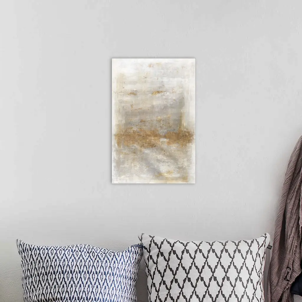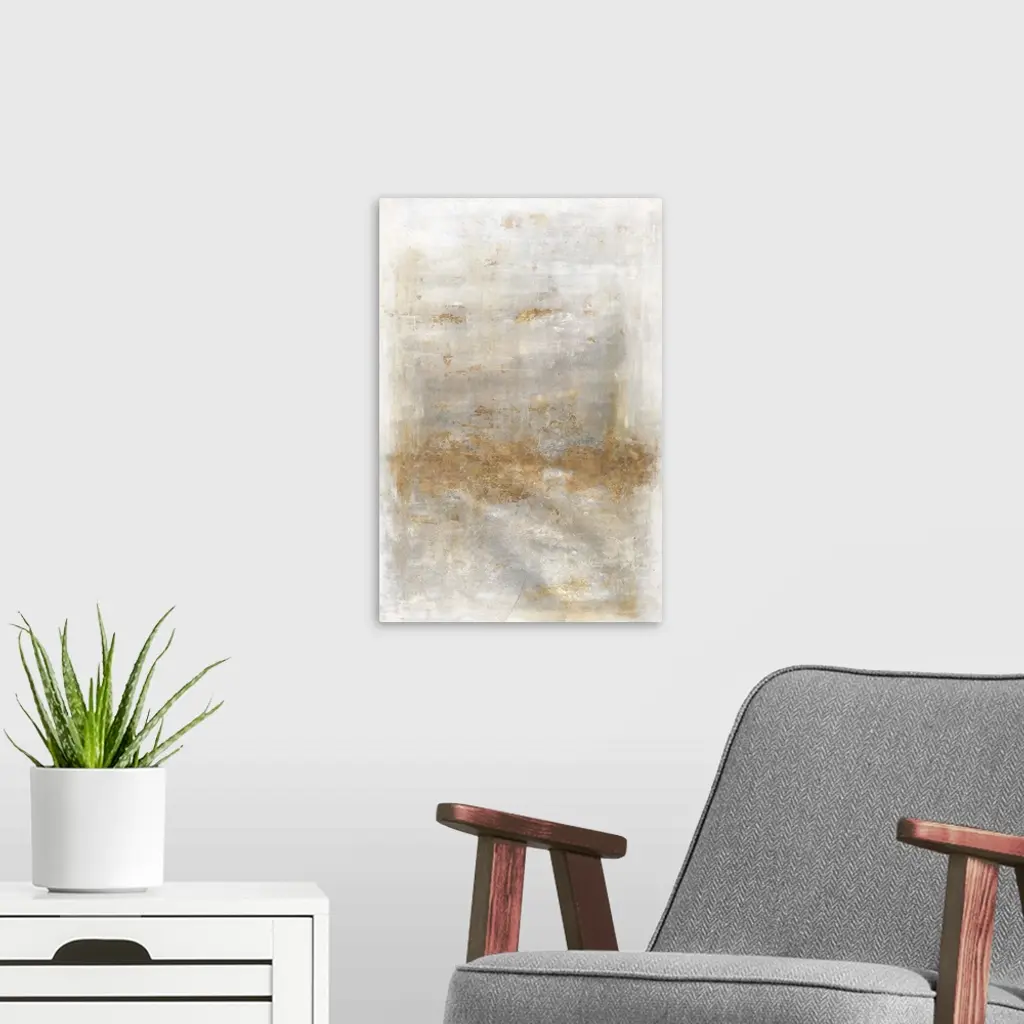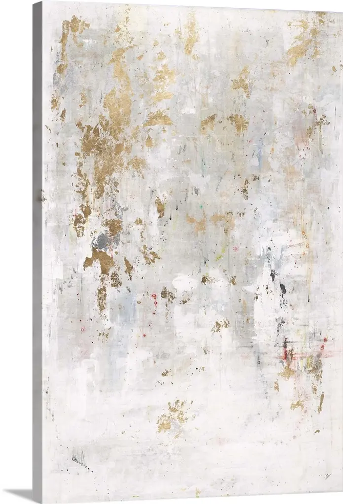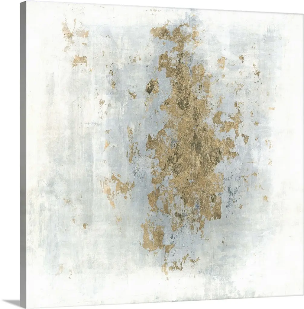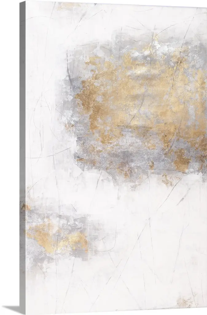 Large abstract artwork with a gray and white background and metallic gold on top.