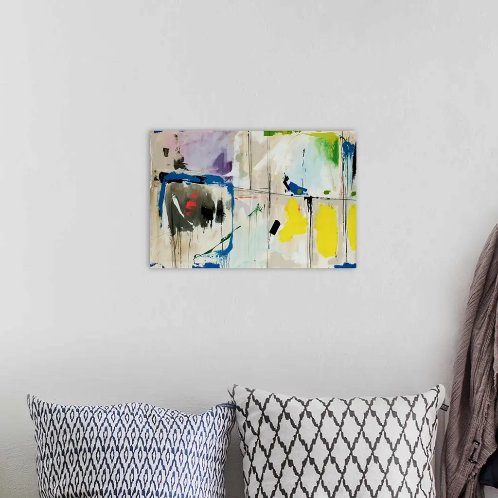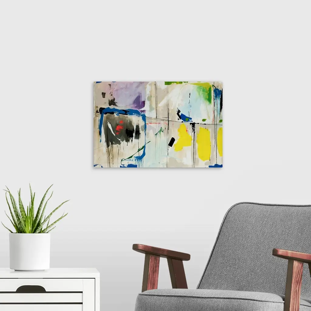 Abstract painting of brightly colored square and rectangular shapes that are divided by thin drips of paint and blocks of various colors.