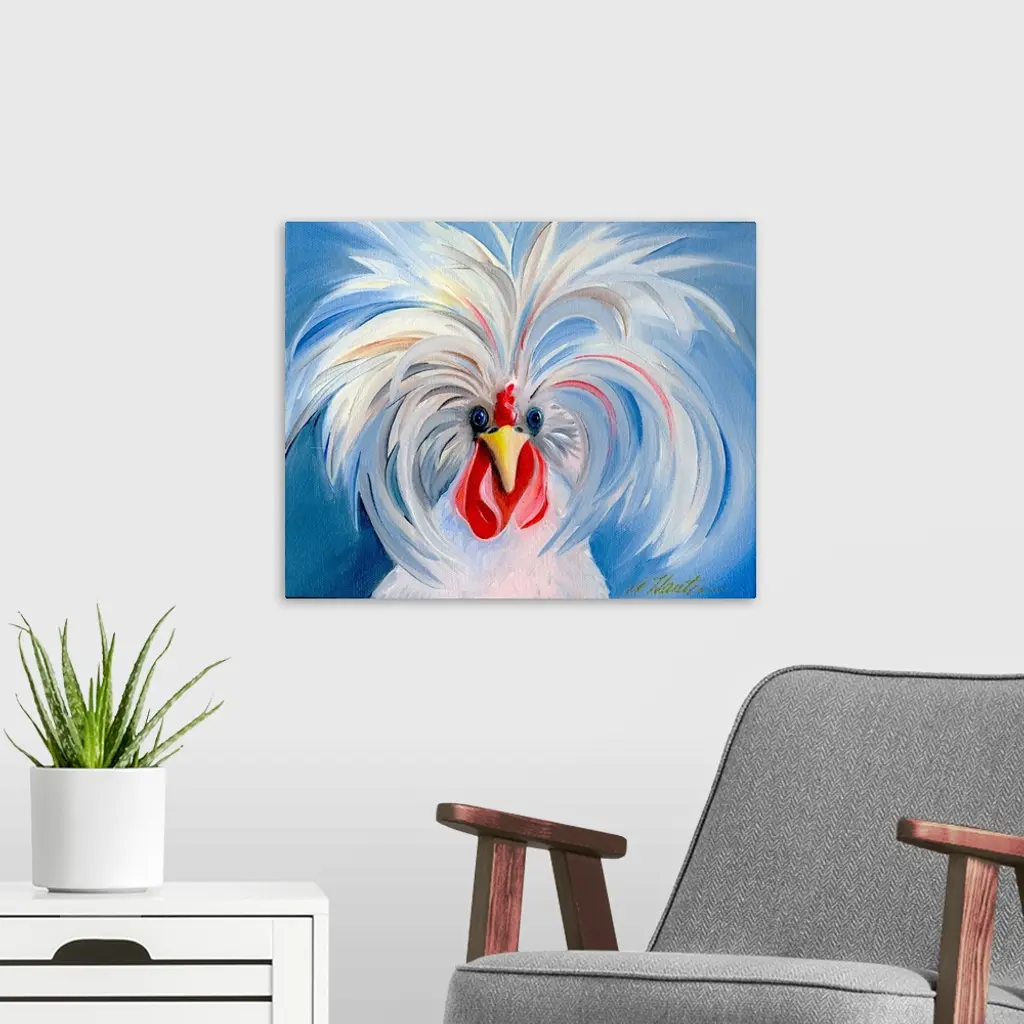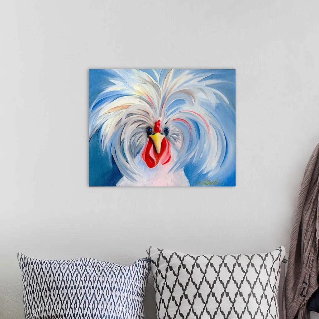 A humorous painting of a rooster with the feathers on top of his sprouting up and out so as to give him a crazy hair style.