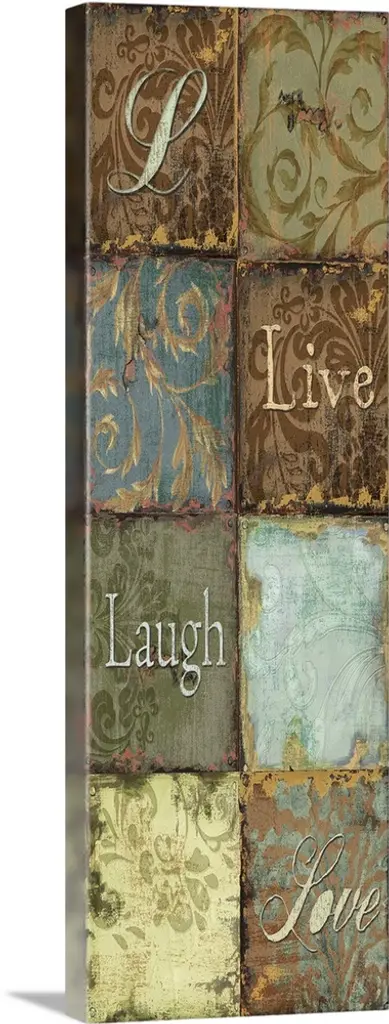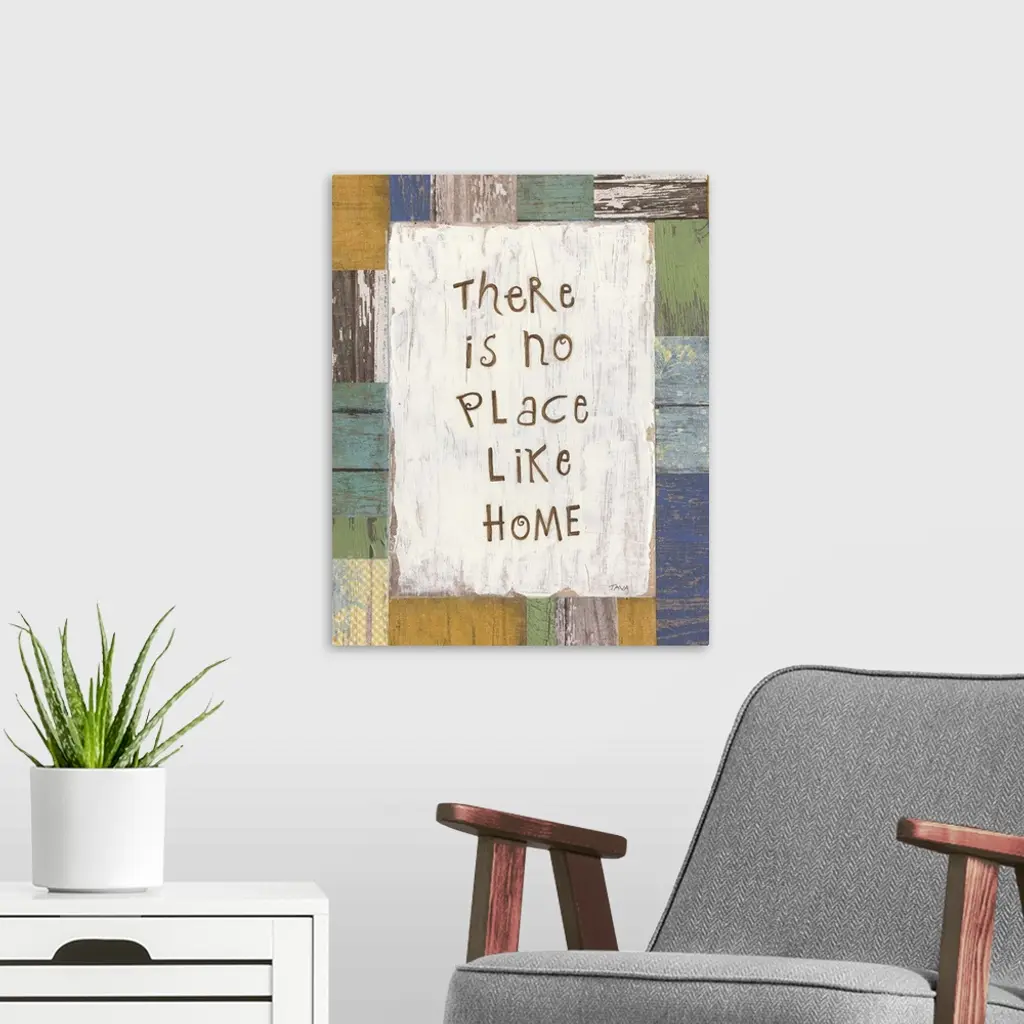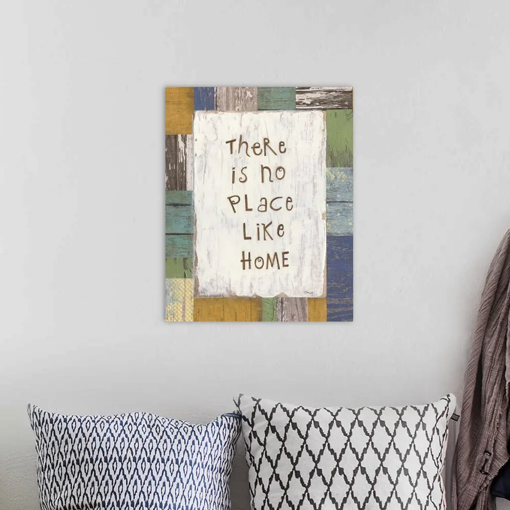 A decorative painting that has ?There is no Place Like Home? painted on a multi-colored wood patterned background.