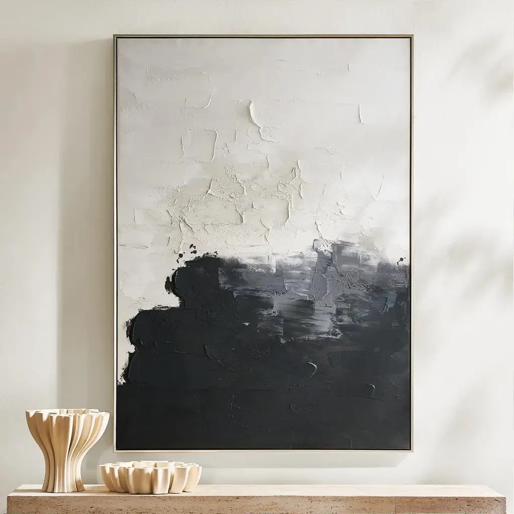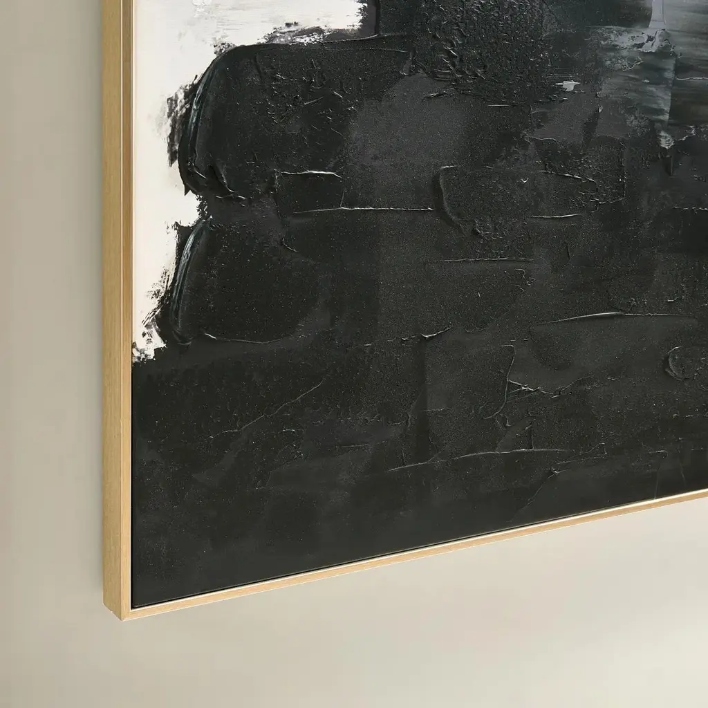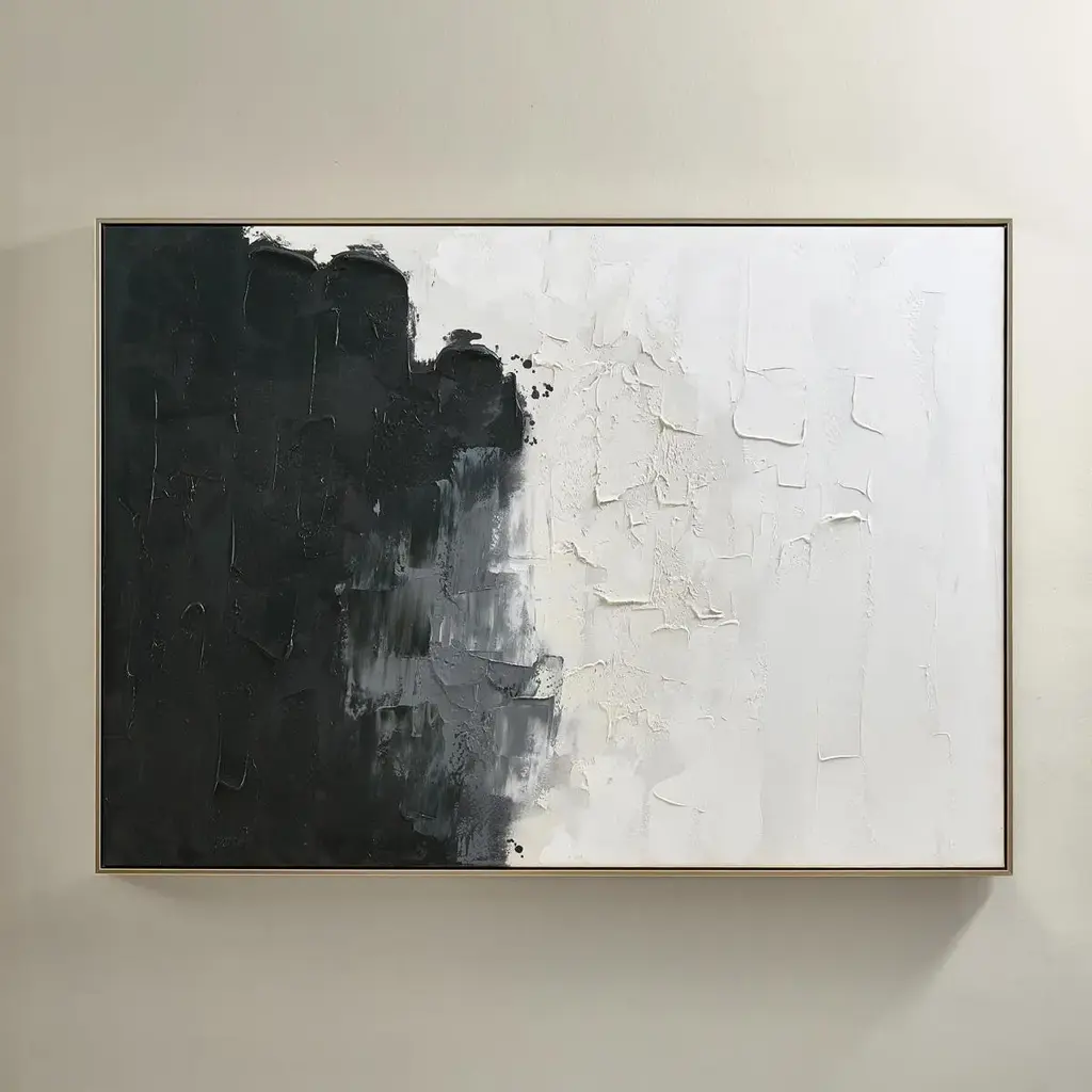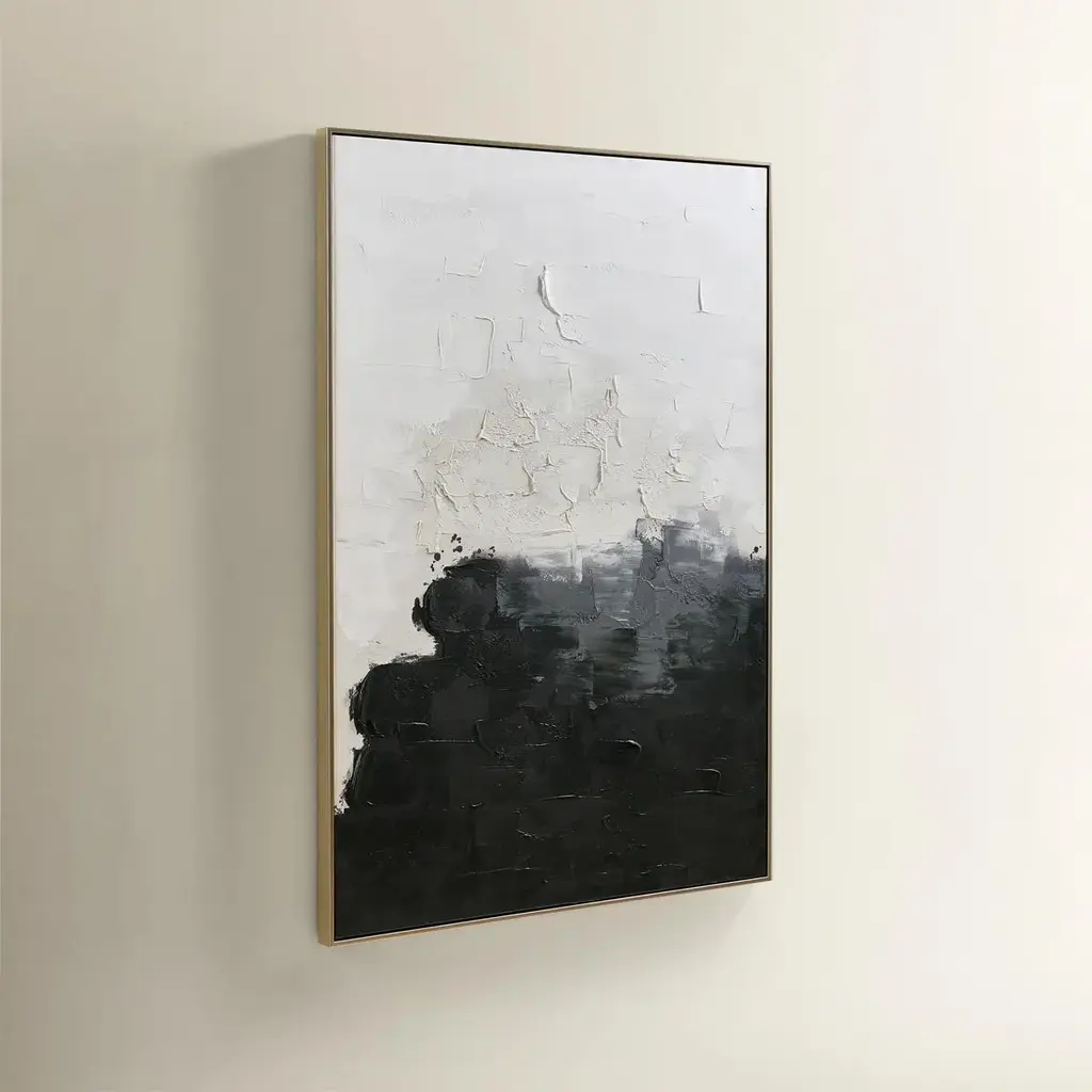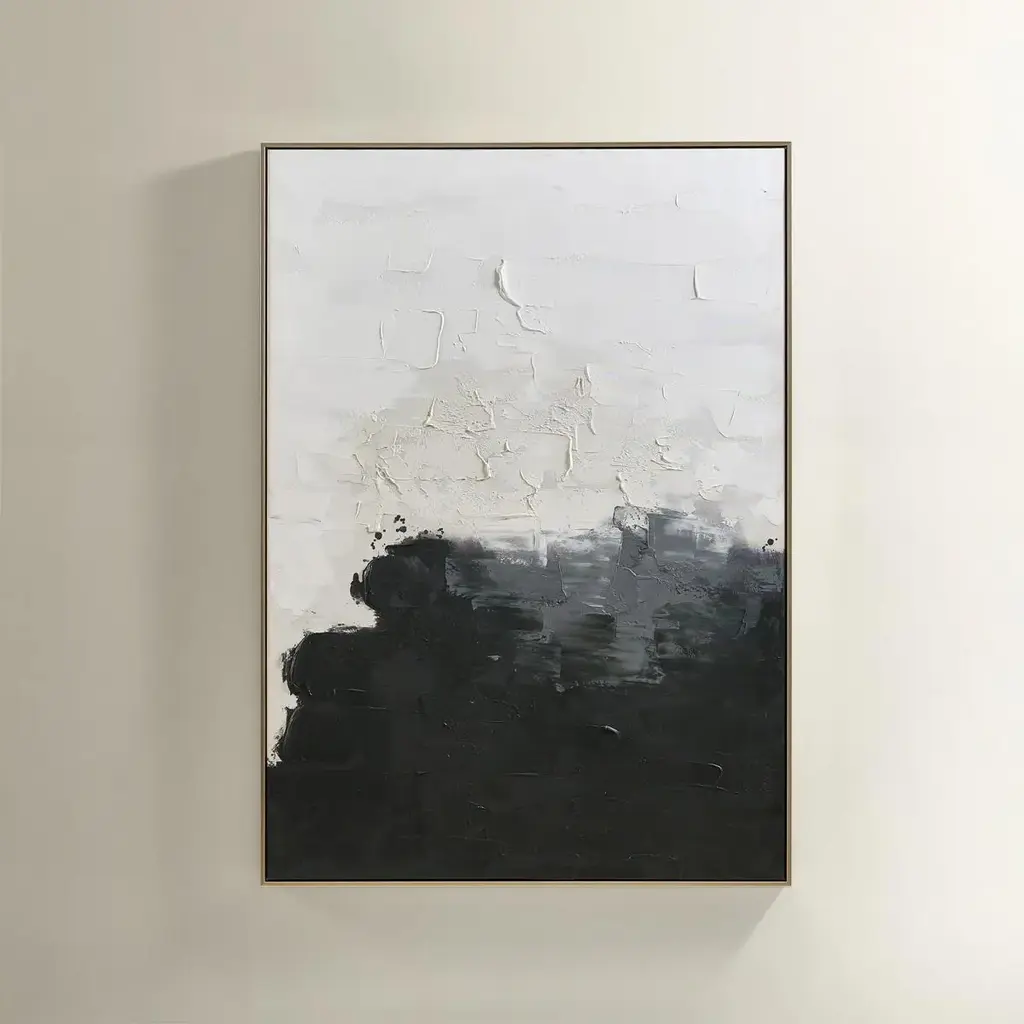 A calming study in contrast, No Rush blends layers of white, ivory, and deep charcoal in expressive palette knife strokes. The textured hand-painted canvas adds depth and drama, while the light natural wood floater frame delivers a clean, modern finish. This piece can be displayed vertically or horizontally, making it a versatile focal point in living rooms, bedrooms, or entryways.