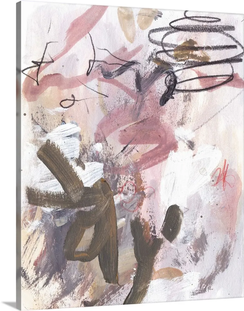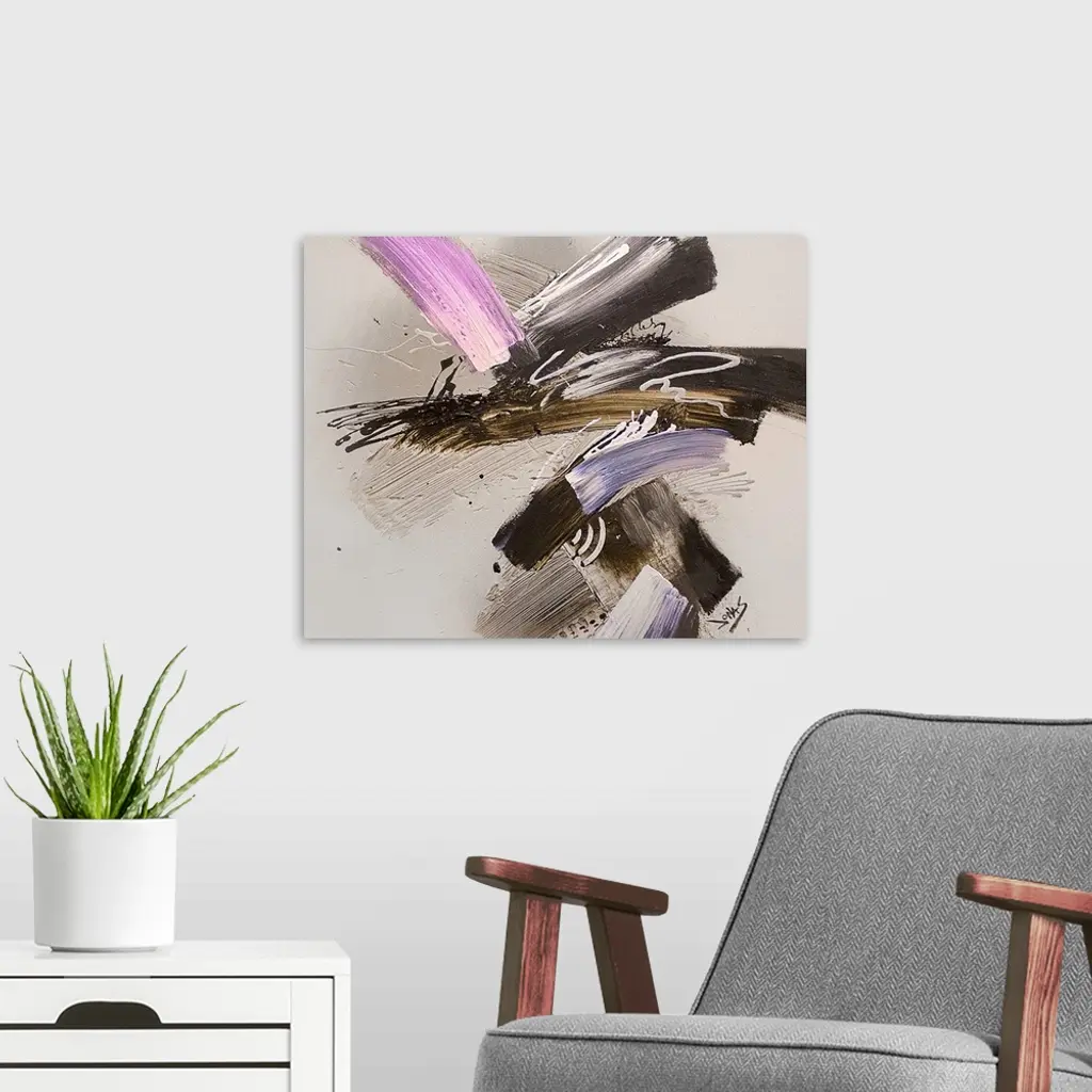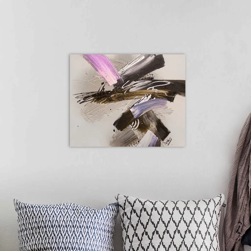 Contemporary abstract painting using bold thick strokes of dark color with one neon pink stroke against a neutral background.